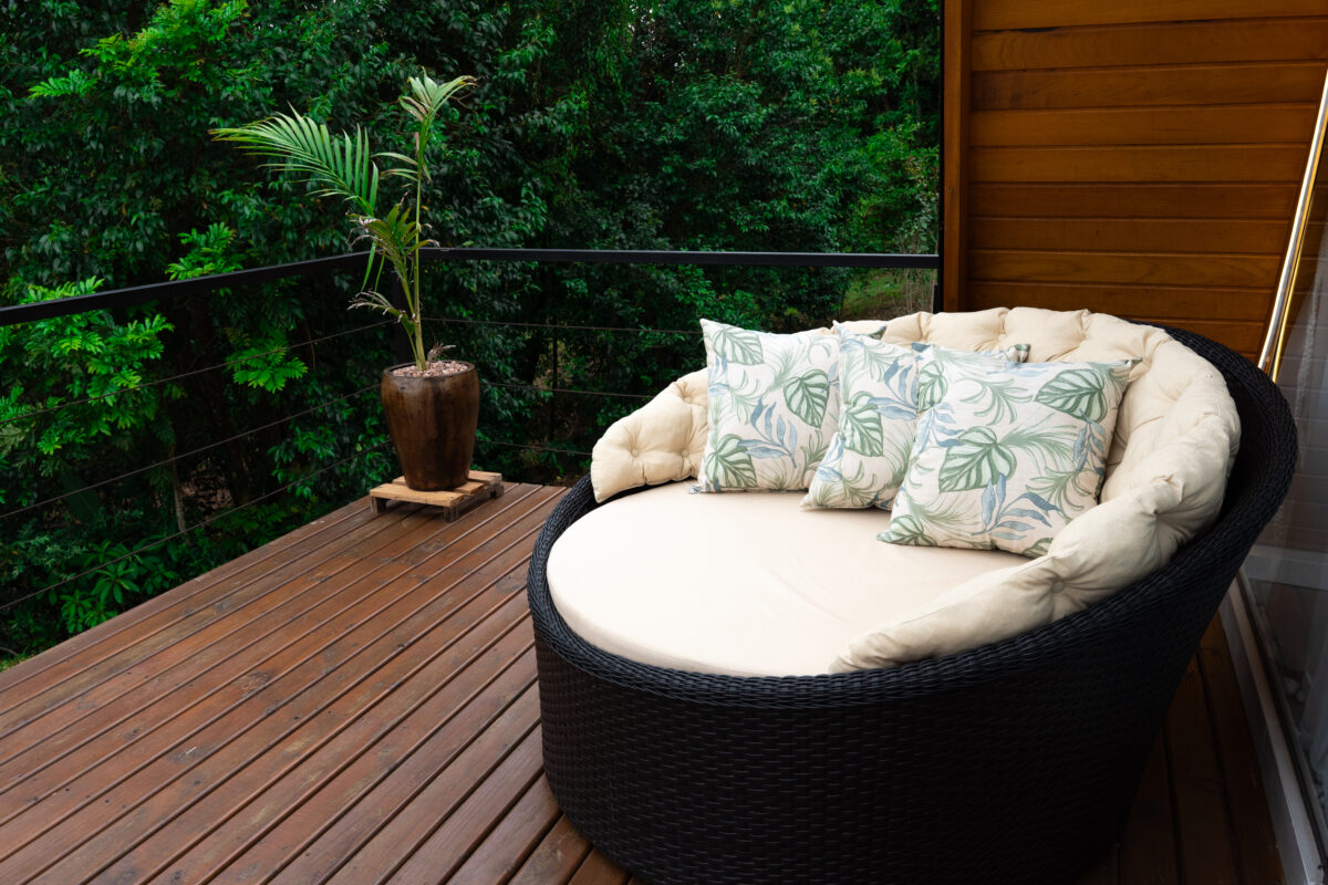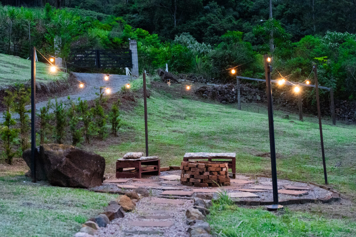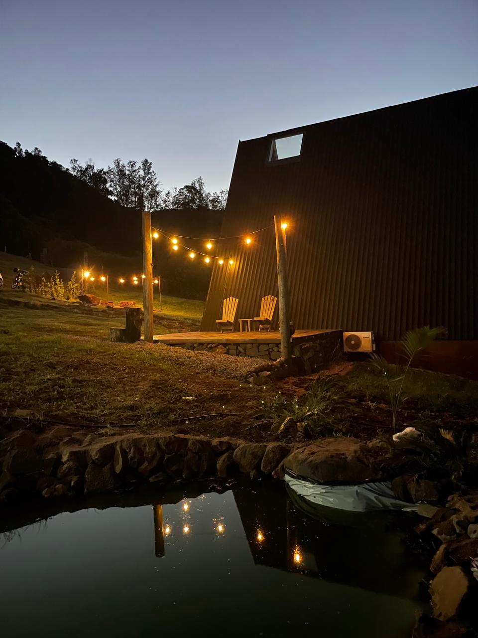 Na área externa, o deck de madeira proporciona um contato com a natureza ao redor, a Cabana A-Frame Gaúcha também conta com cadeiras ao lado da cabana, fogueira e lago, que completam esse momento inesquecível.