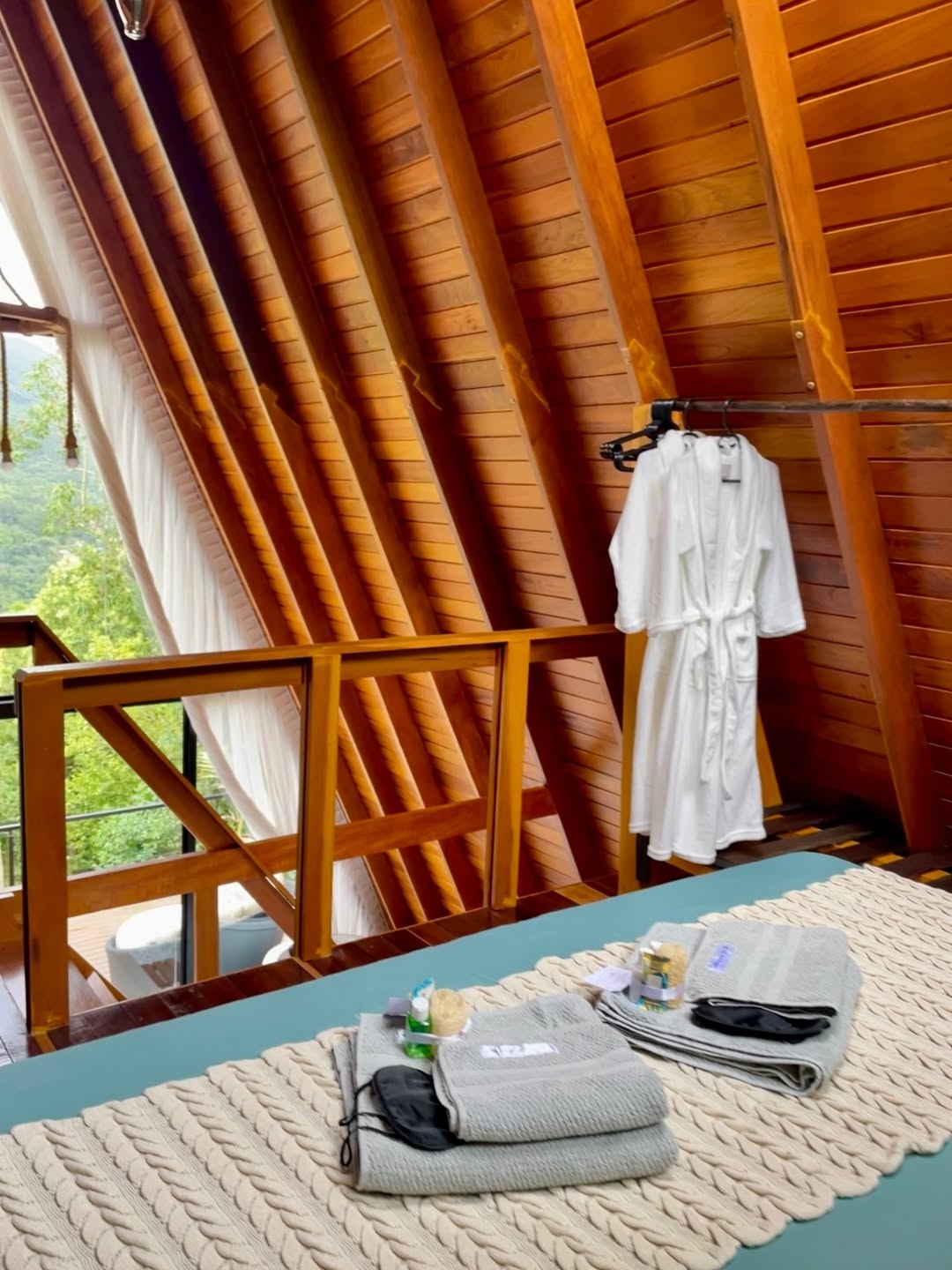 Subindo para o mezanino, você encontra uma cama king size com enxoval completo, ar-condicionado e uma charmosa claraboia, que permite contemplar o céu estrelado.