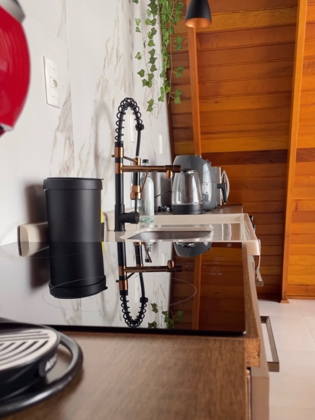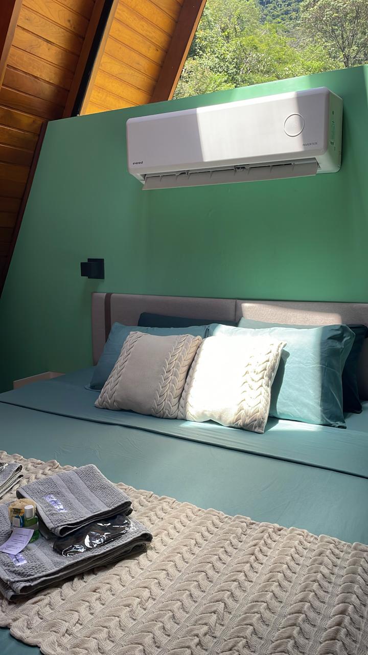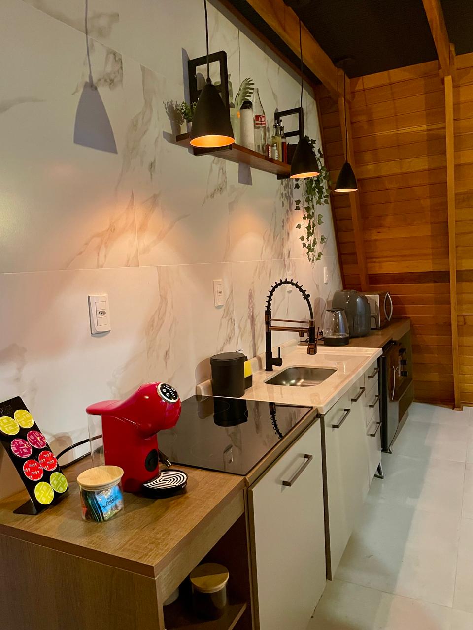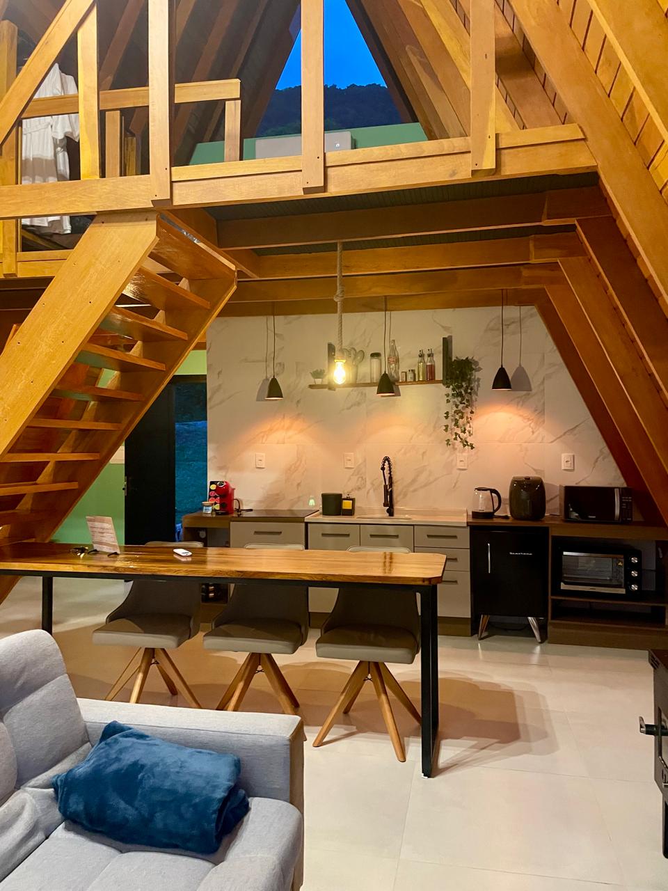 No primeiro andar, a sala de estar integra conforto e aconchego, com sofá-cama, smart TV, lareira, ar-condicionado e um espaço pensado para home office. A cozinha, conectada ao ambiente, é equipada com forno elétrico, cooktop, micro-ondas, frigobar e airfryer, oferecendo praticidade durante toda a estadia.