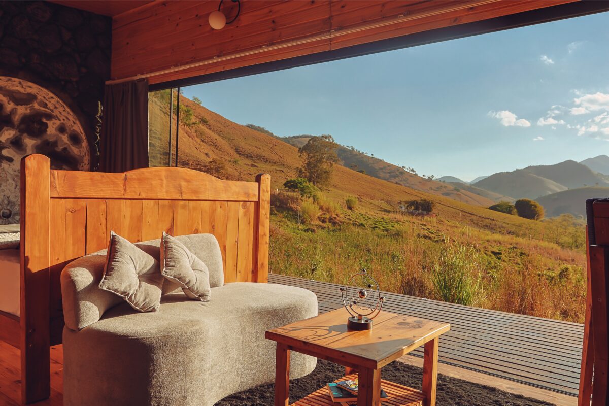 No interior, os charmosos ambientes foram pensados para momentos de descanso. Espaço de estar aconchegante com sofá confortável, perfeito para relaxar com vista para as montanhas. Ao lado, o quarto com cama queen, poltrona, espaço para itens pessoais, cortinas blackout e enxoval de alta qualidade.