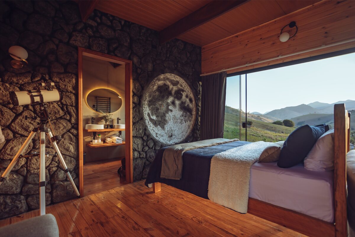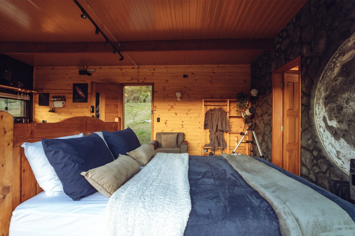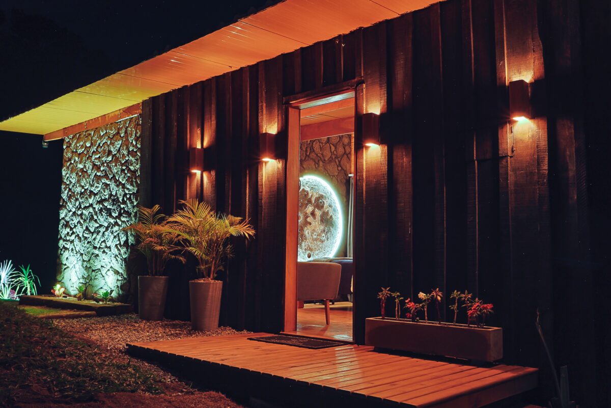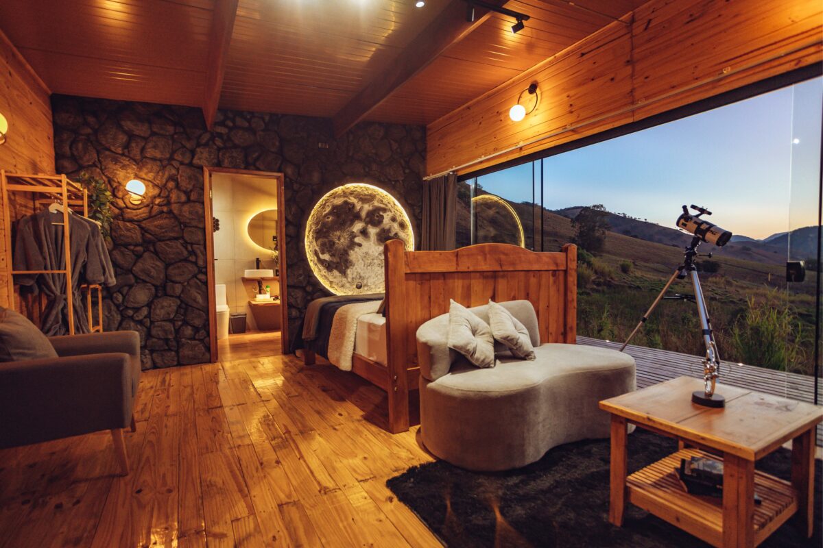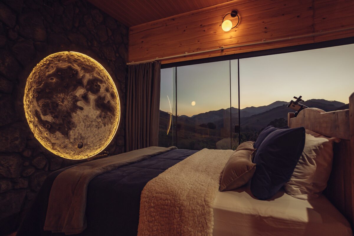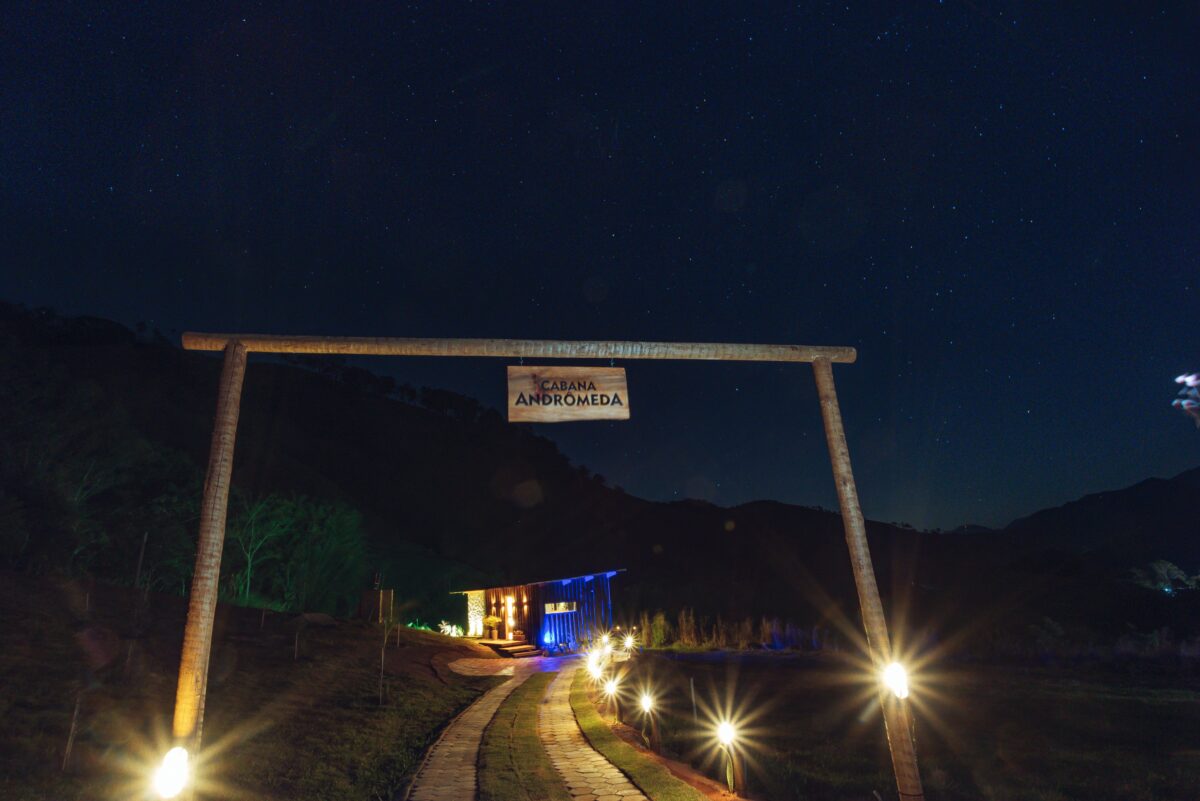 A Cabana Andrômeda é um refúgio entre as montanhas da Serra da Mantiqueira, perfeita para dias de descanso e conexão, cercada pela tranquilidade da natureza. Romântica e cheio de encanto, onde o céu estrelado parece mais próximo, a arte se faz presente na obra da lua com iluminação em LED, que cria um efeito 3D e transforma cada noite em um espetáculo.