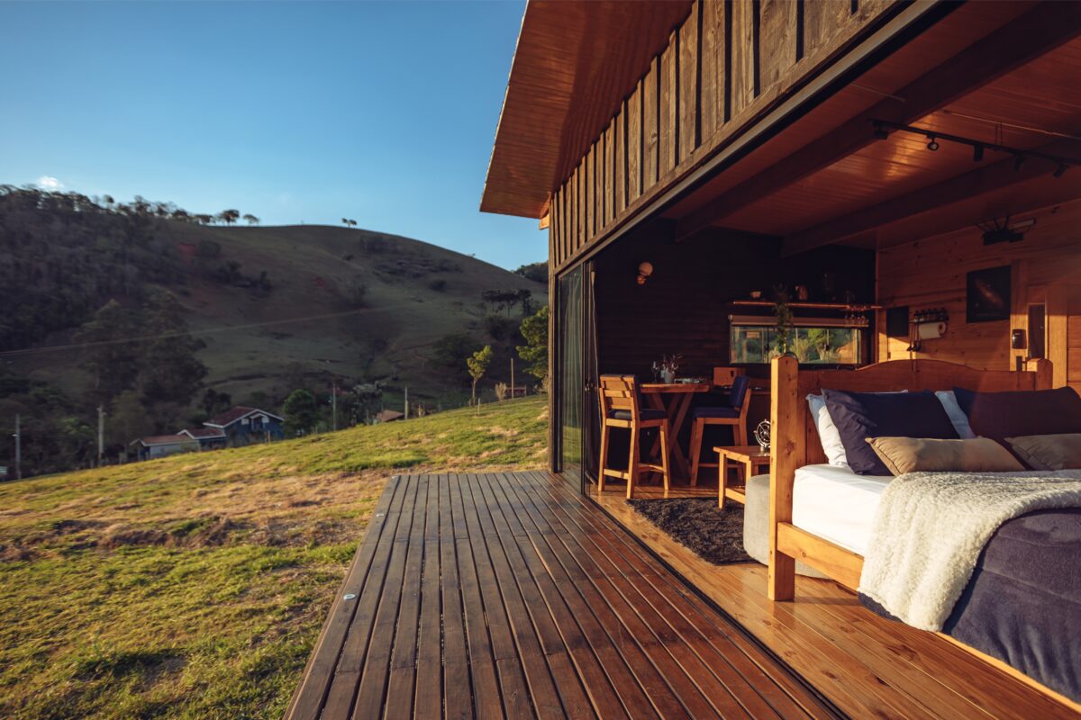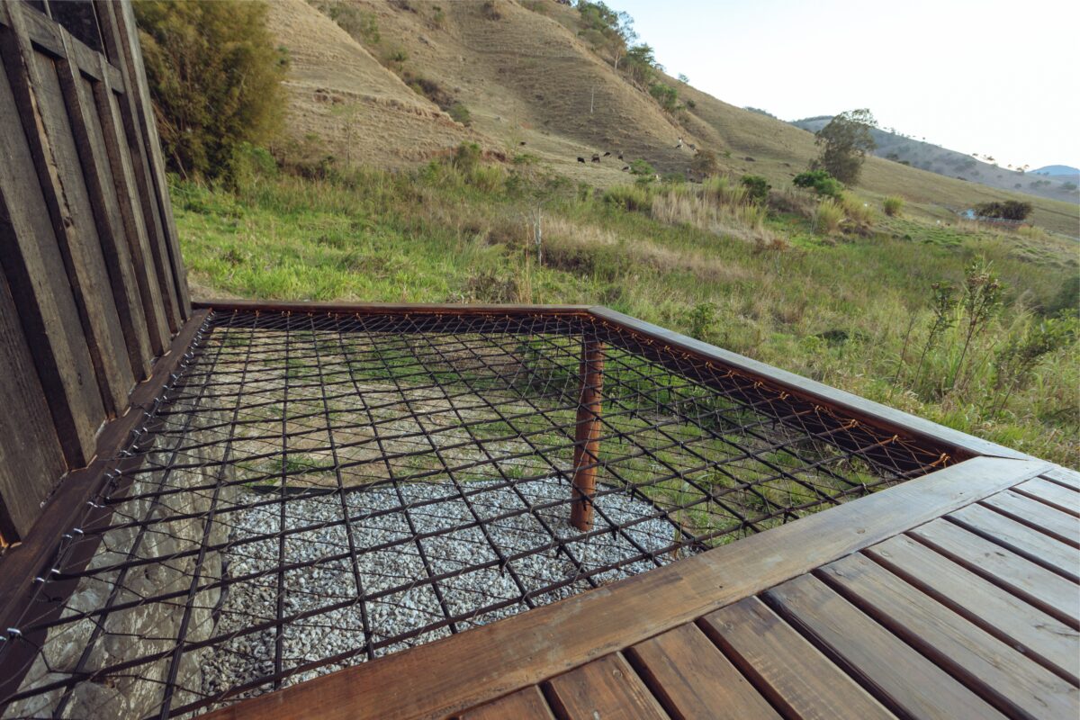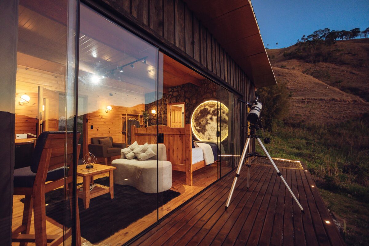 Na área externa, um deck de madeira com um telescópio para observar as estrelas, um redário e um amplo gramado perfeito para atividades ao ar livre. Tudo foi pensado para que cada instante seja vivido em harmonia com a natureza e com o céu da Mantiqueira.