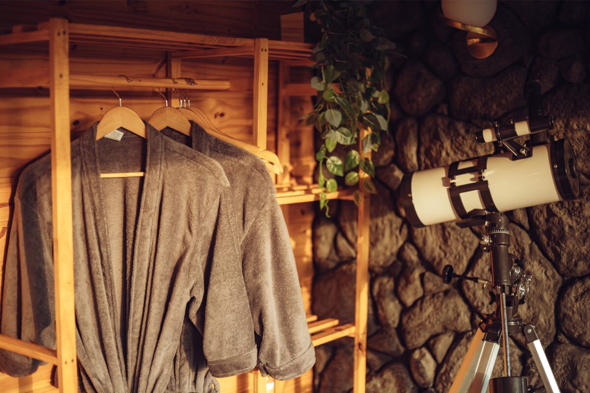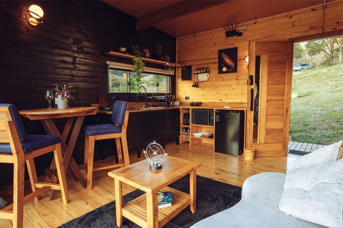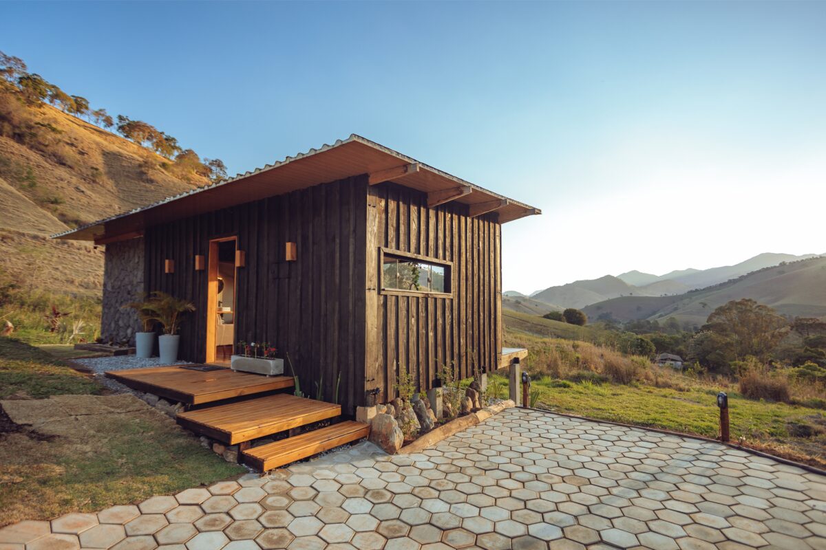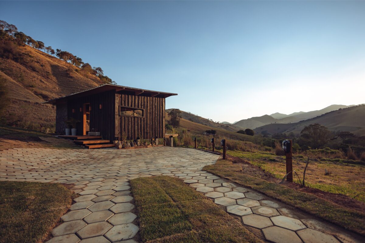 Na área externa, um deck de madeira com um telescópio para observar as estrelas, um redário e um amplo gramado perfeito para atividades ao ar livre. Tudo foi pensado para que cada instante seja vivido em harmonia com a natureza e com o céu da Mantiqueira.