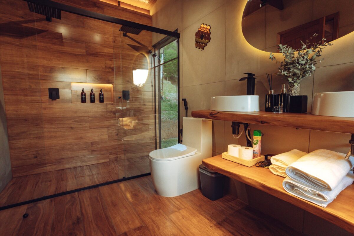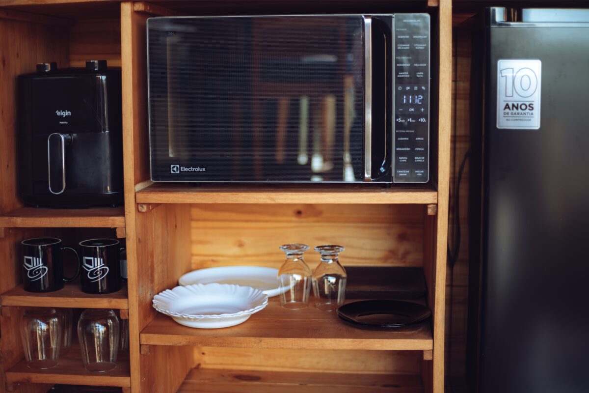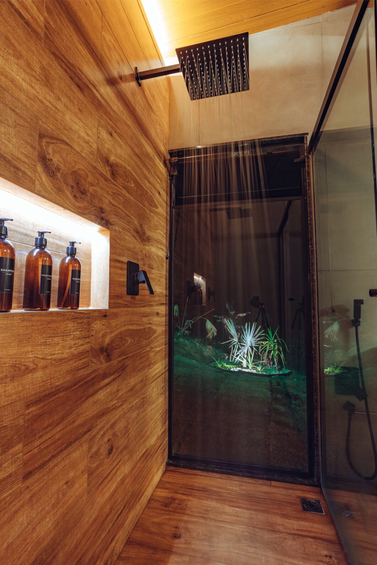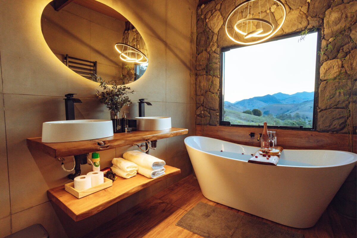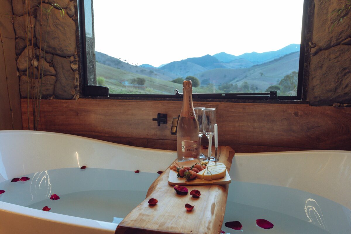 Além disso, a cozinha integrada, equipada com frigobar, cooktop, micro-ondas, airfryer e diversos utensílios e eletroportáteis para o preparo de refeições. O banheiro com conforto e bem-estar equipado com com chuveiro duplo com água quente, toalhas macias, secador de cabelo e amenities exclusivos. E, para completar a experiência, uma banheira de imersão com vista para a natureza.