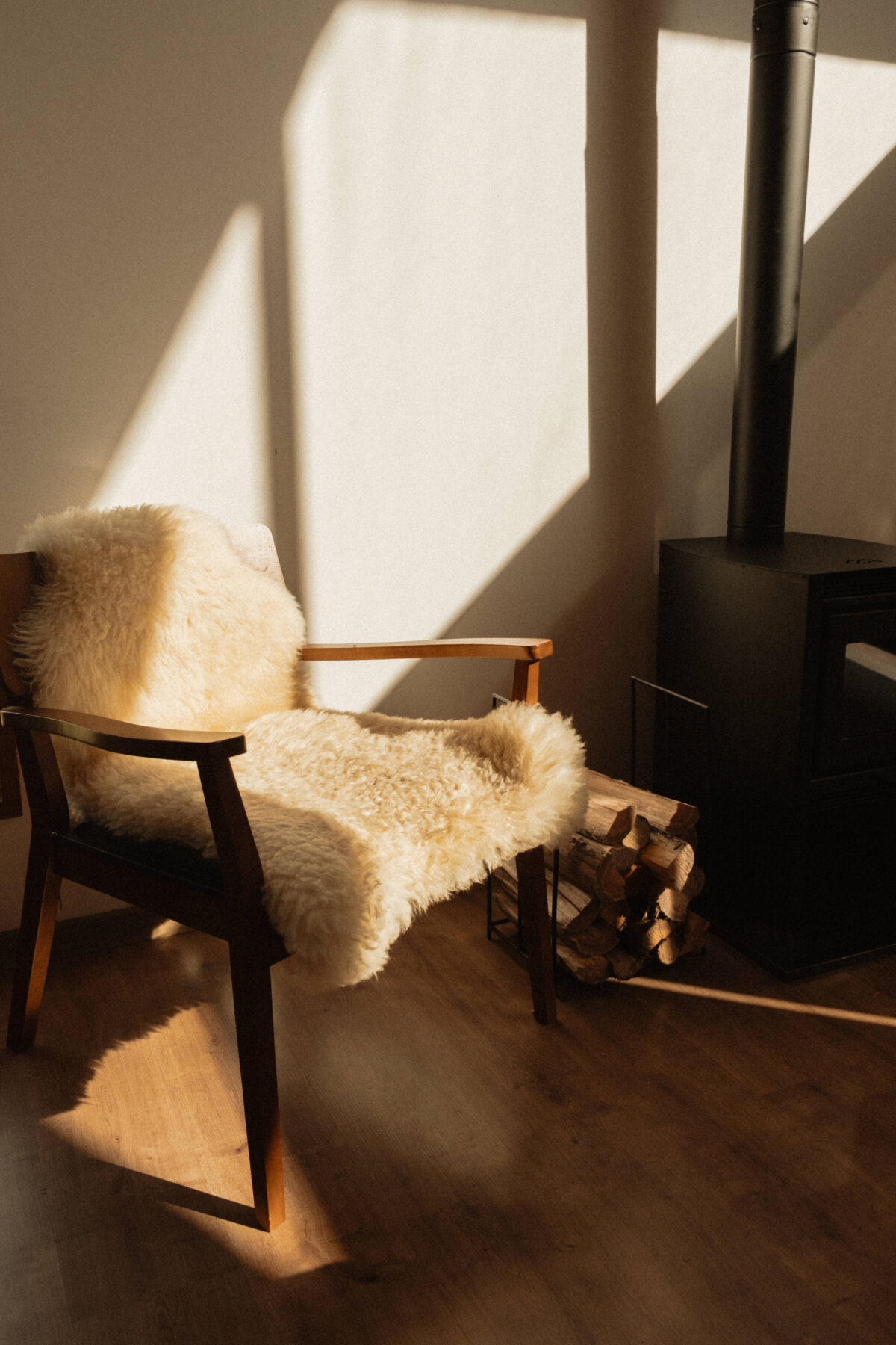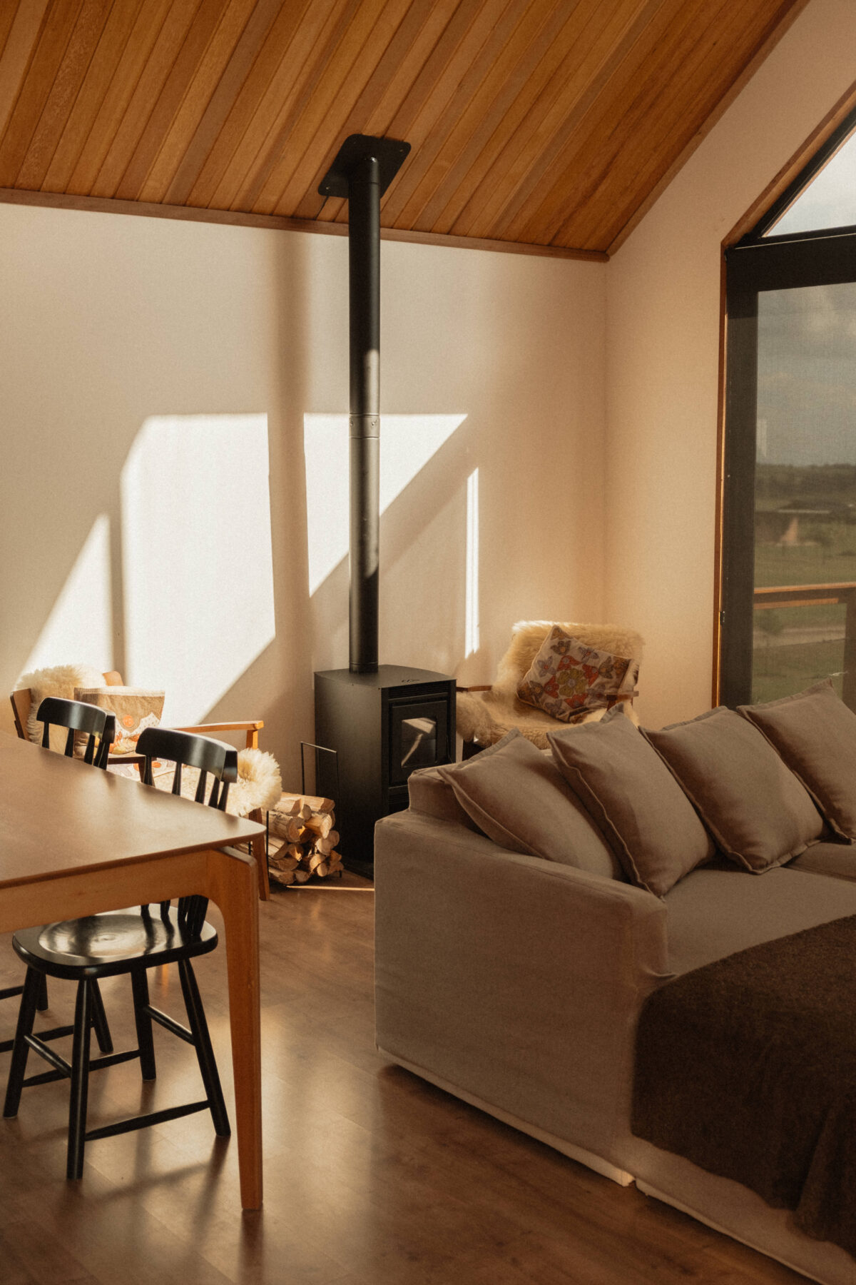 O interior da cabana é acolhedor e bem equipado para que você se sinta em casa. A sala de estar conta com um confortável sofá, Smart TV 55” e Playstation, ideal para momentos de lazer. Além disso, ao lado, uma charmosa lareira com poltronas ao redor.