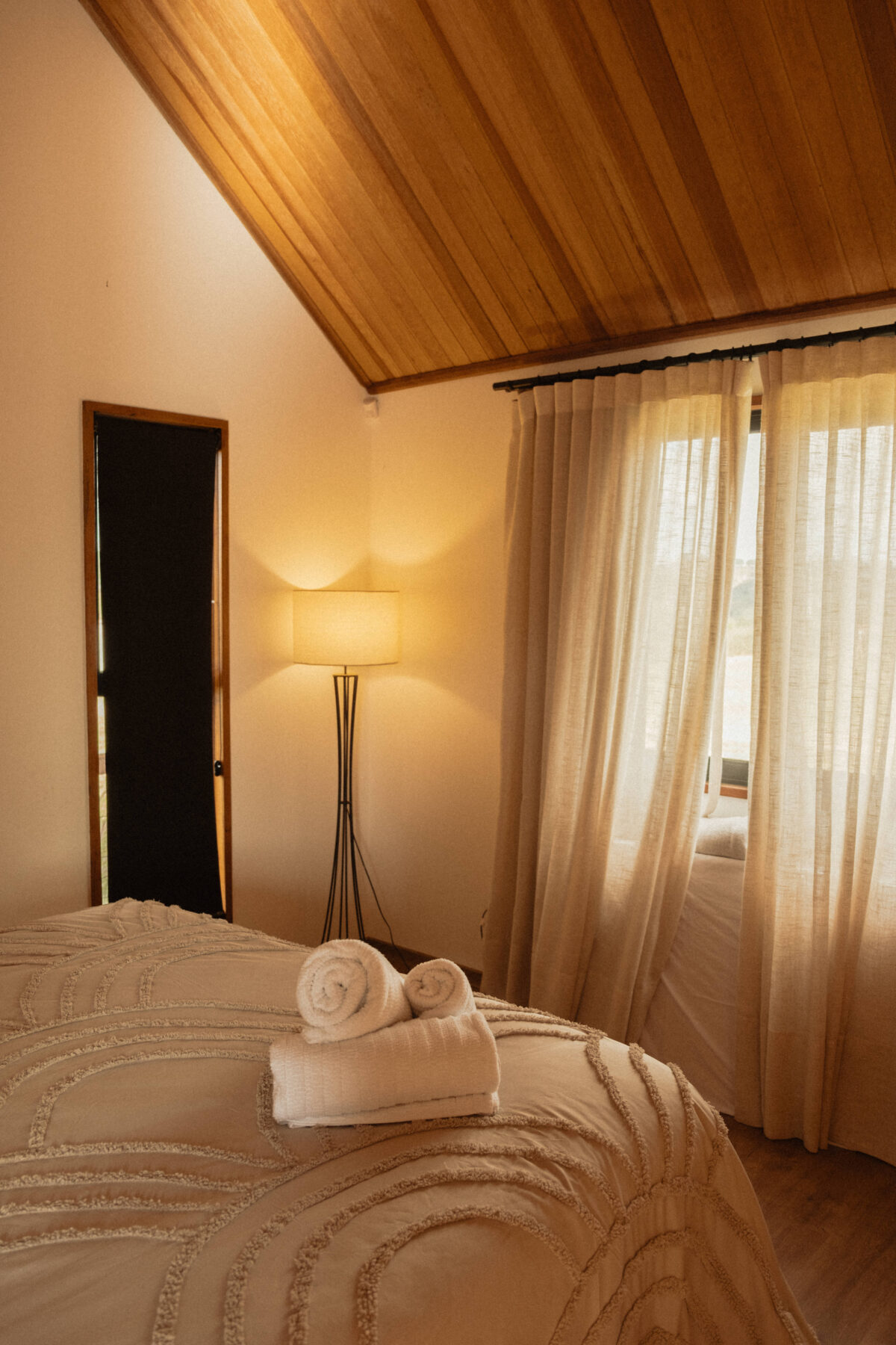 A cabana acomoda até quatro pessoas em dois quartos confortáveis: um com cama queen e outro com duas camas de solteiro que podem ser unidas formando outra cama de casal.. Ambos oferecem enxoval completo, ar-condicionado, cortinas blackout e espaço para itens pessoais. O banheiro é moderno, com ducha quente, toalhas, amenidades e toalheiro aquecido para maior conforto.