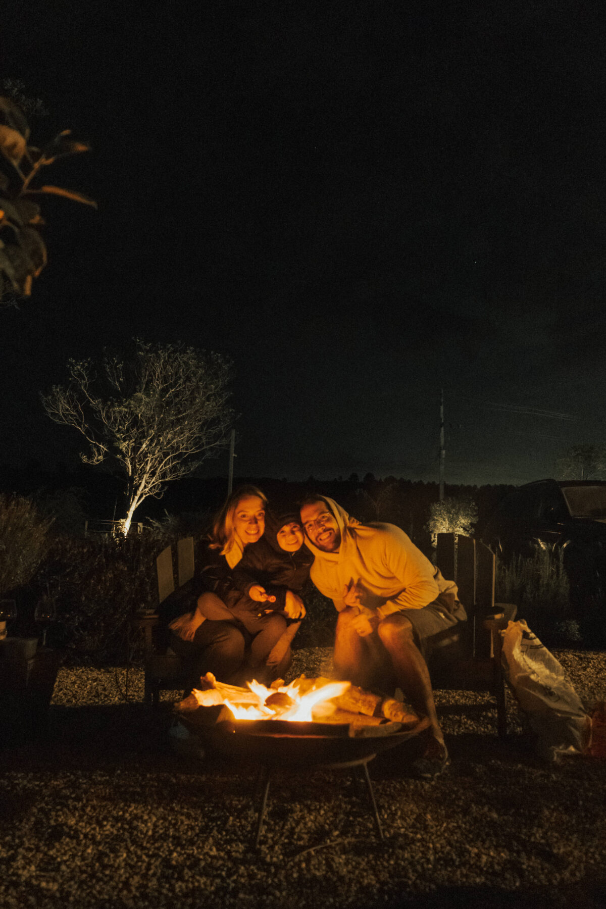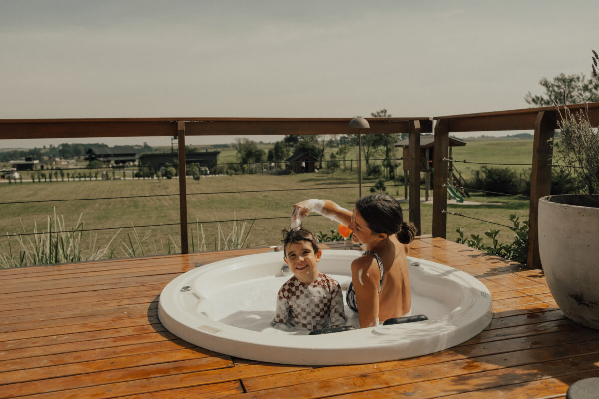 Para completar a experiência, na área externa há um amplo deck de madeira com uma jacuzzi com hidromassagem, além de uma churrasqueira e espreguiçadeiras. Além disso, um amplo gramado para atividades ao ar livre e piqueniques. Há ainda um espaço com firepit, um parquinho para as crianças se divertirem e um jardim.