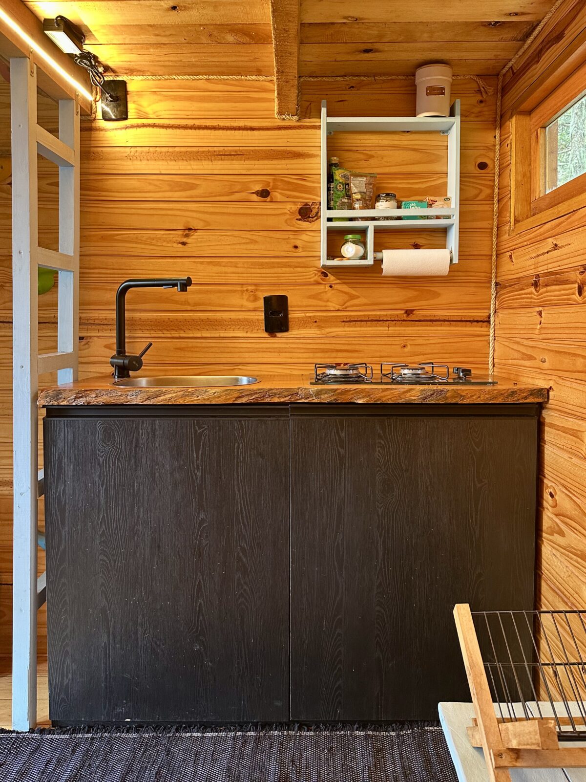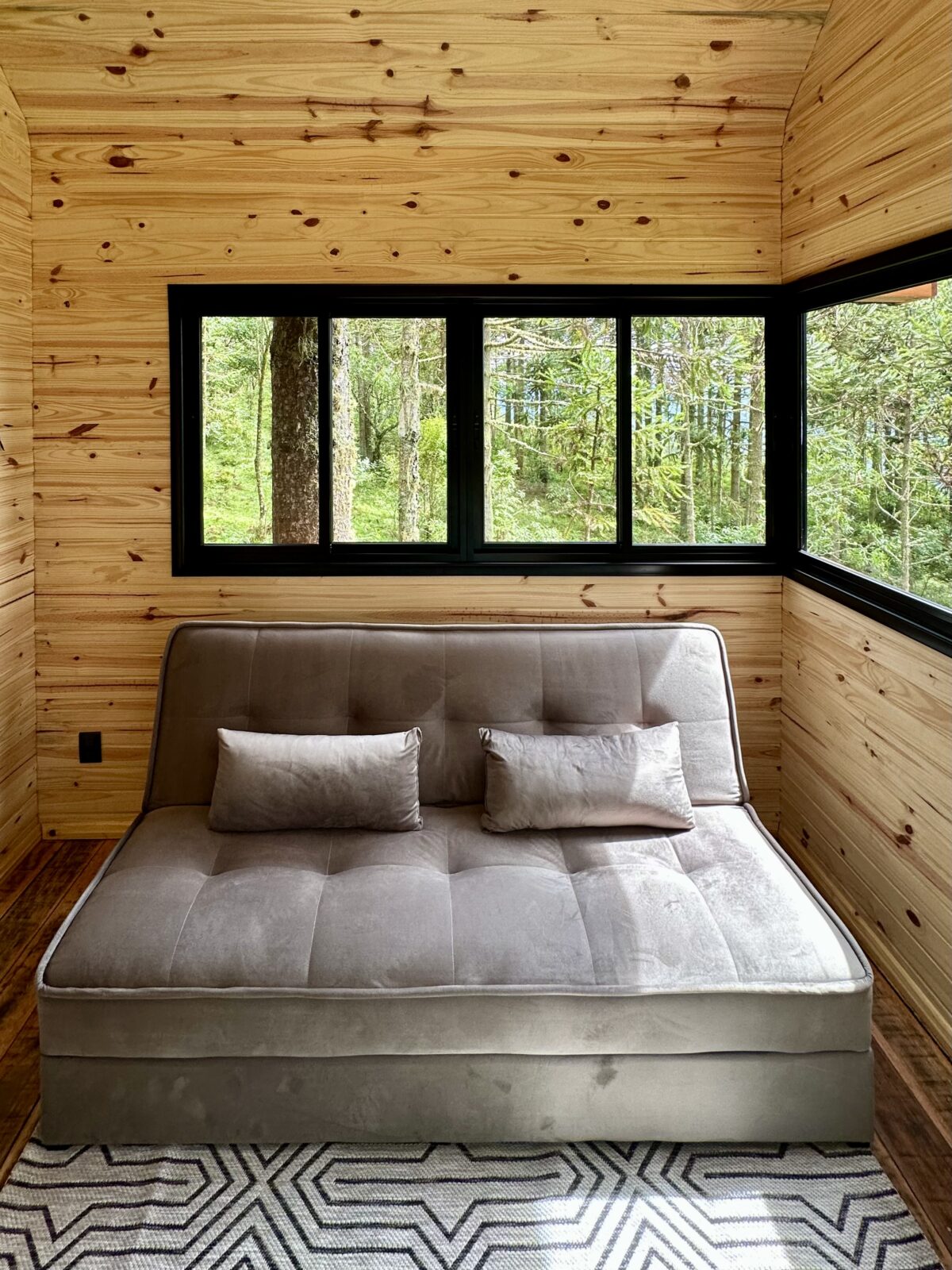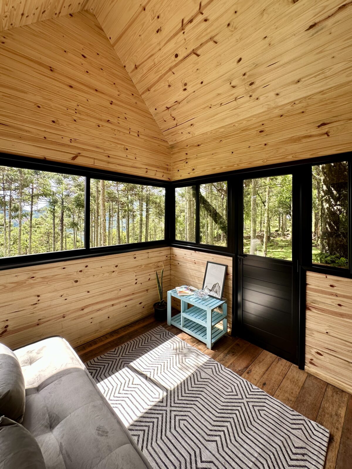 Além disso, uma cozinha compacta com cooktop, frigobar e utensílios essenciais para o preparo de refeições. O banheiro possui ducha de água quente, toalhas e amenidades. O grande destaque é a banheira de imersão com hidromassagem, posicionada ao lado de amplas janelas de vidro para banhos relaxantes com vista para a floresta de araucárias.
