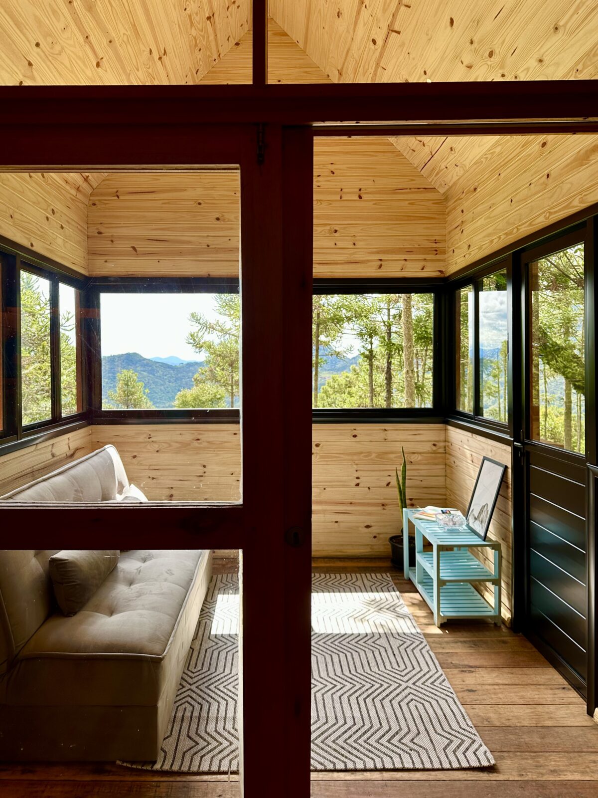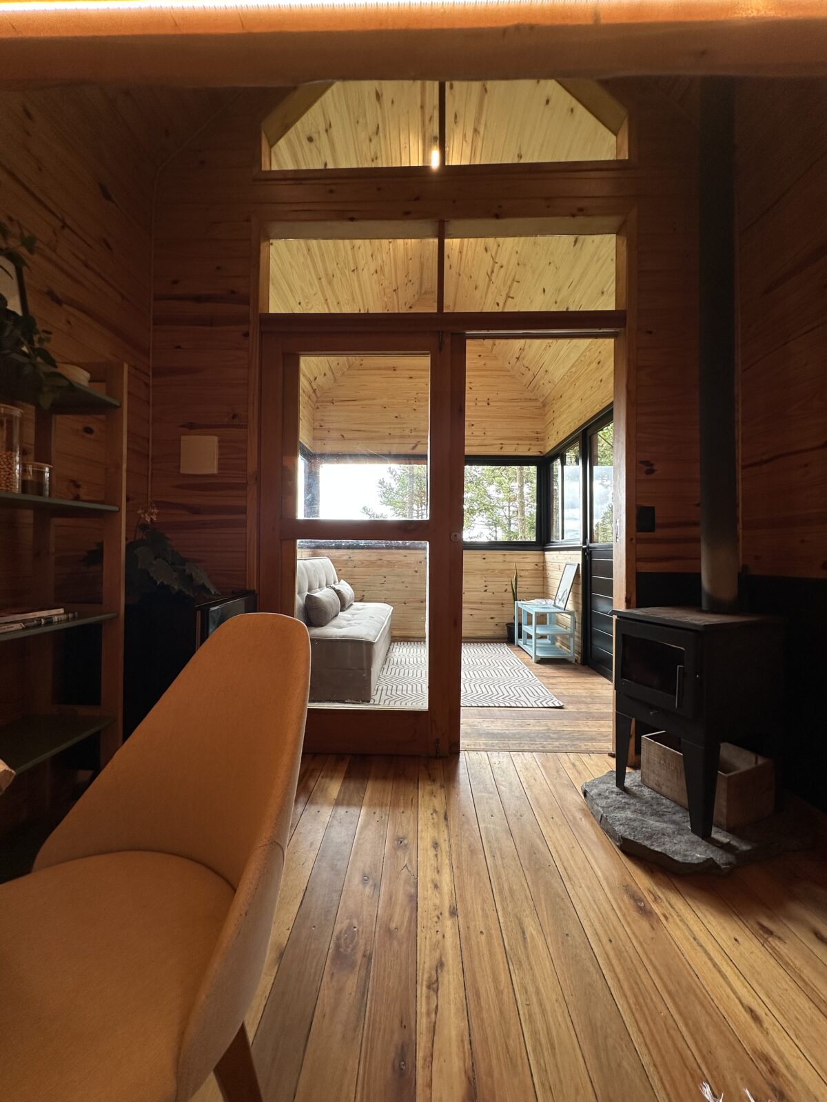 A área interna é inteiramente revestida em madeira, criando uma atmosfera acolhedora. O ambiente principal conta com sala de estar com sofá confortável e lareira. Ao lado, o quarto, um mezanino com cama de casal e enxoval completo.