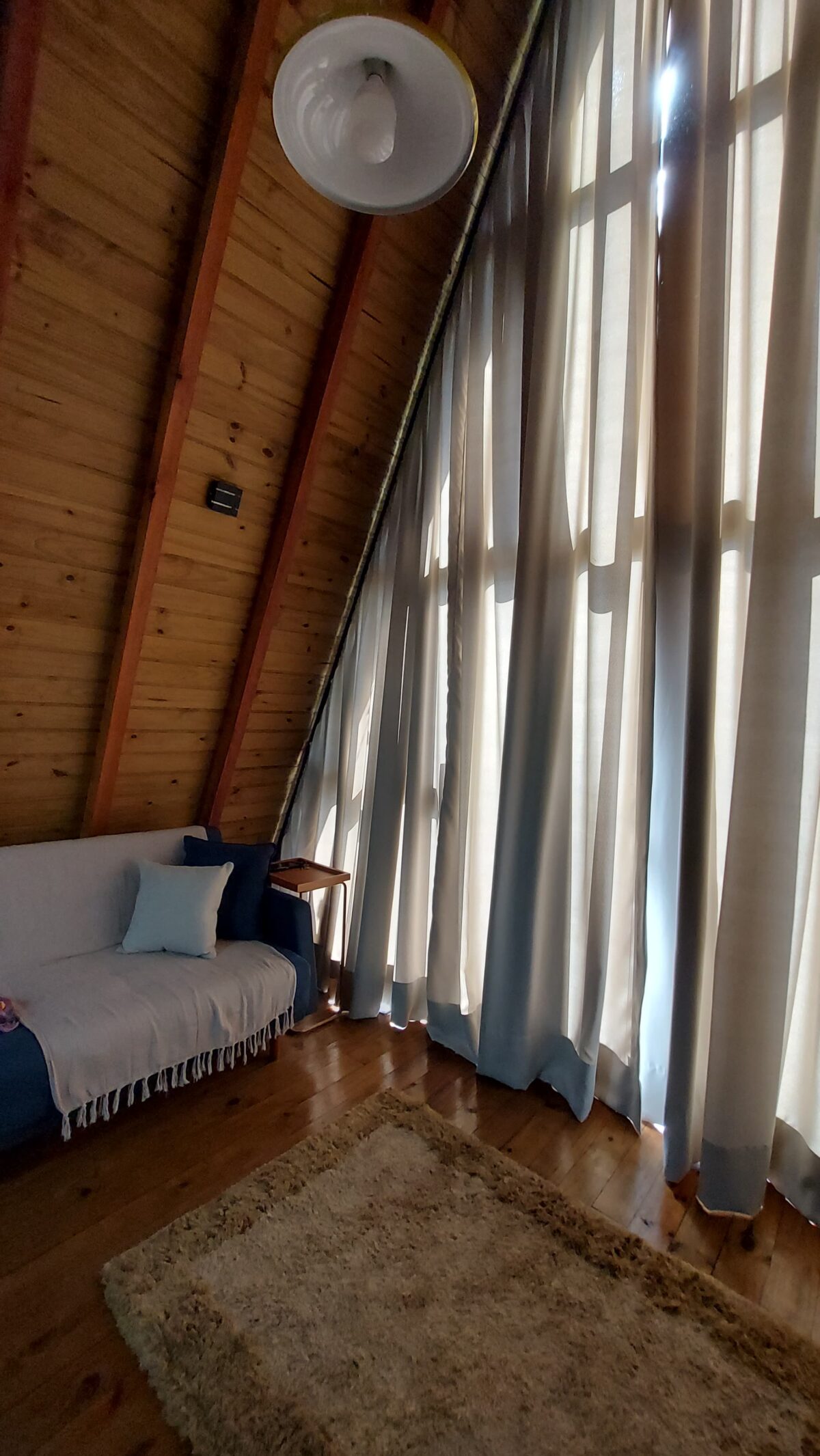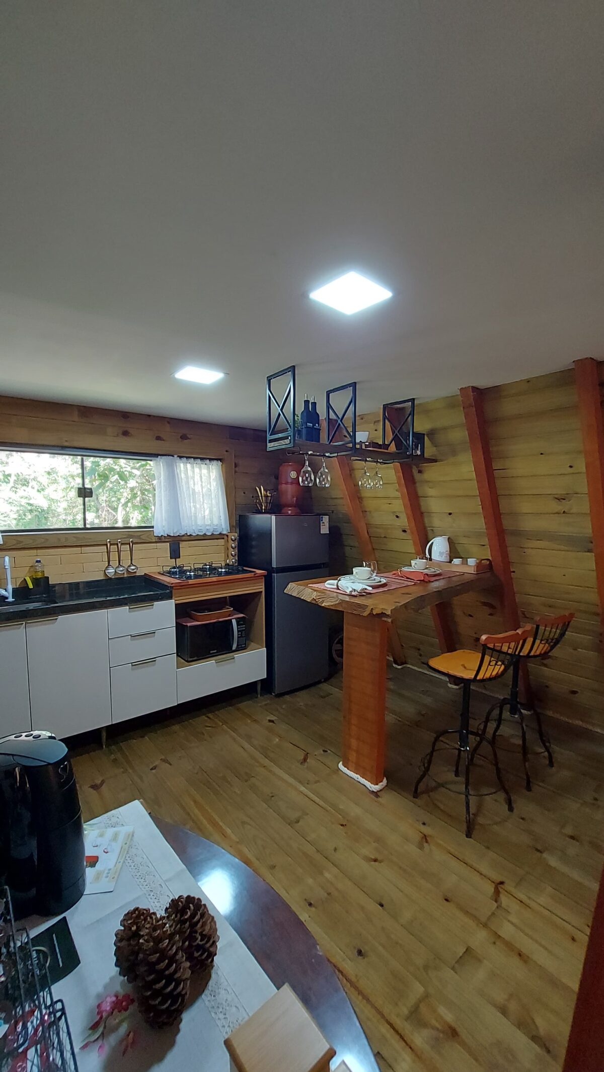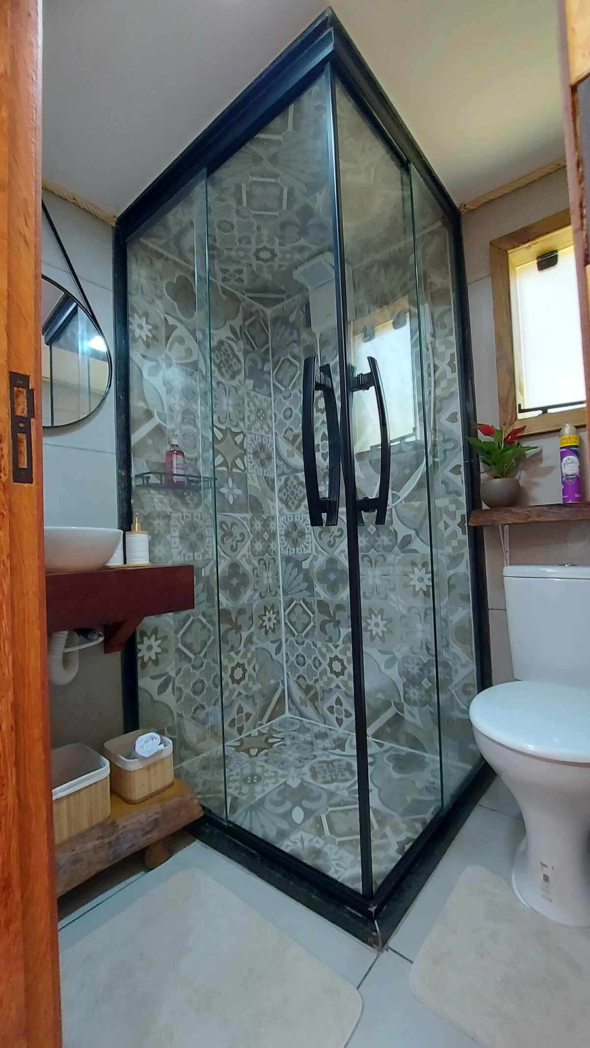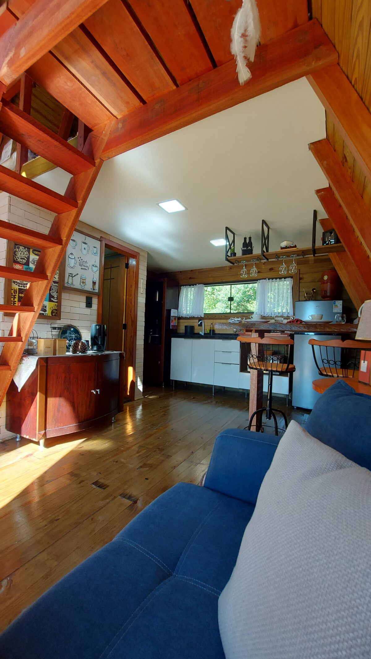 Além disso, há um banheiro completo com ducha de água quente, toalhas macias e amenities. Subindo as escadas, o mezanino com o quarto principal, com cama de casal, enxoval completo e cortinas blackout, garantindo noites tranquilas. .