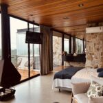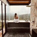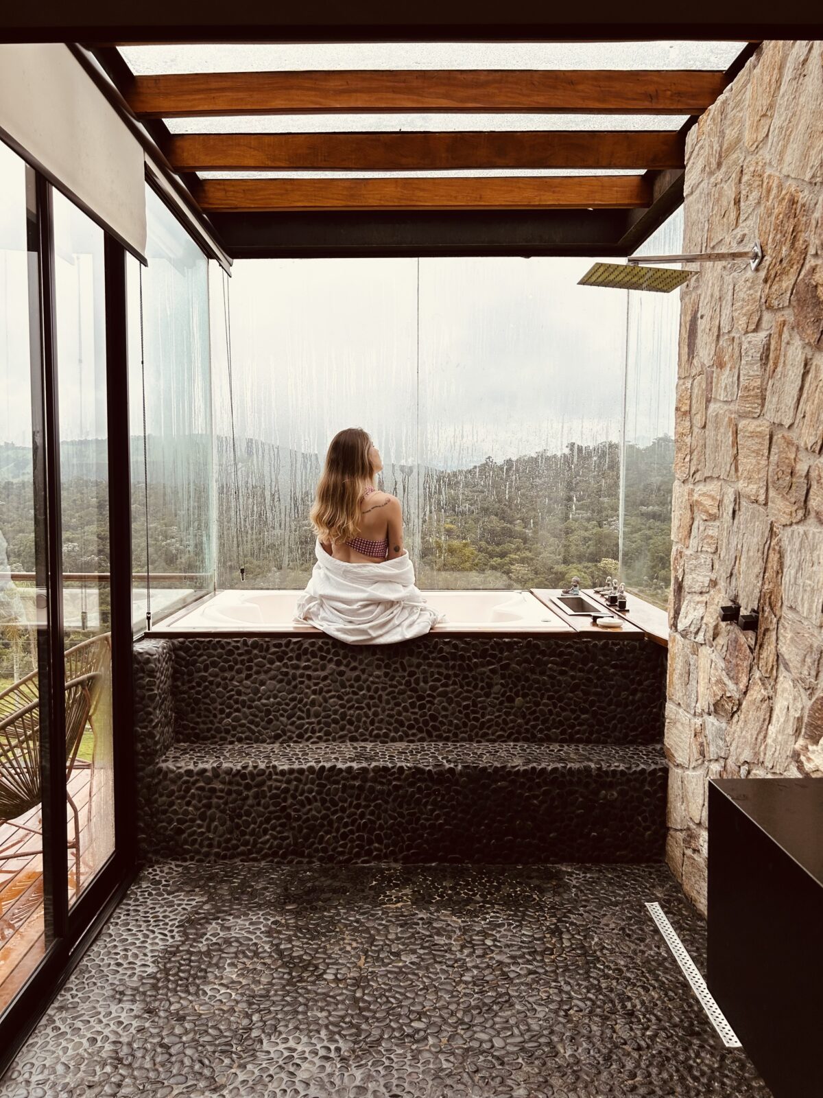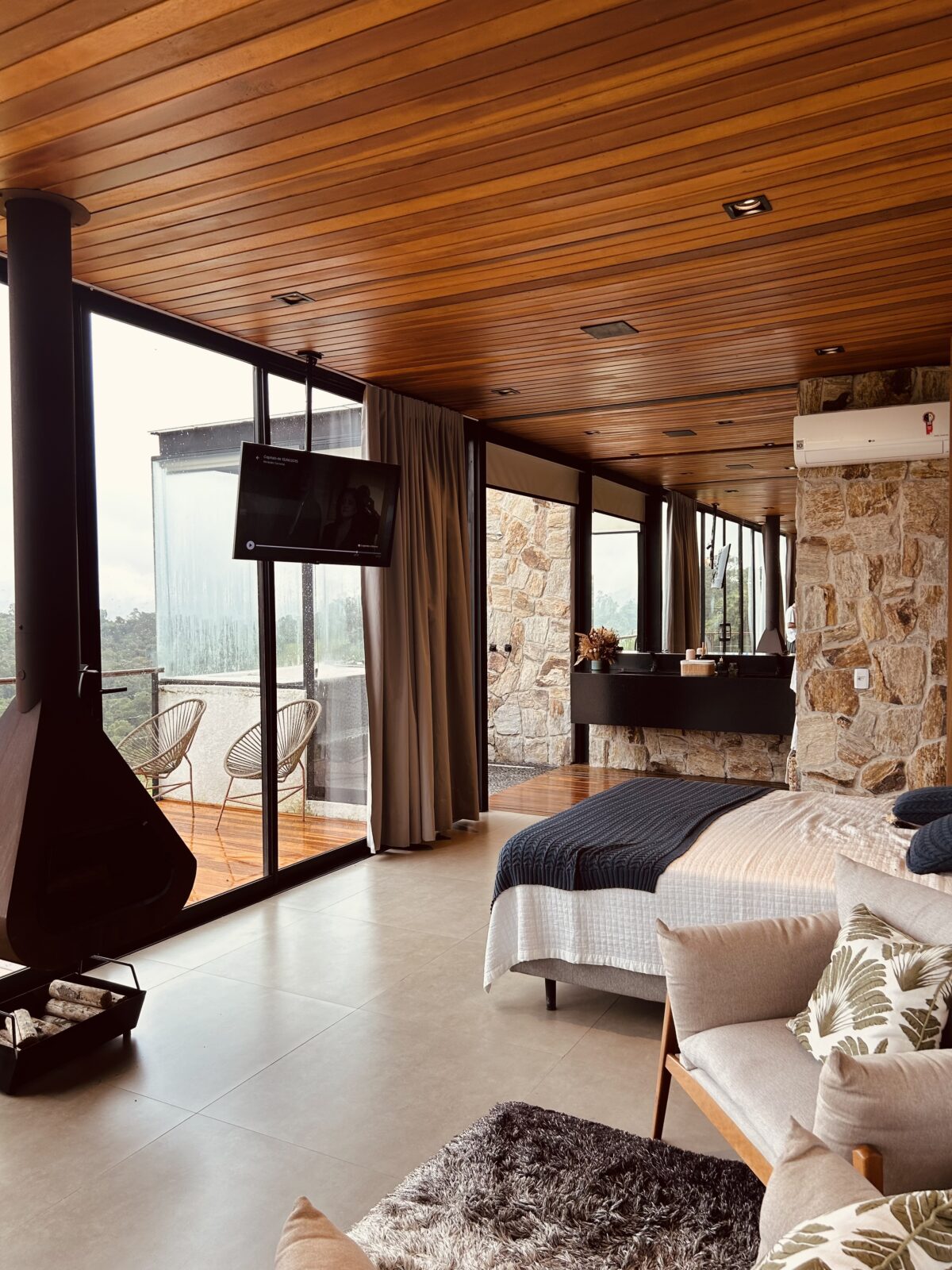 Um dos meus lugares favoritos ali foi o banheiro, todo revestido em pedra, com uma banheira de hidromassagem posicionada de frente para a paisagem. Tomar um banho quente olhando para o verde ao redor é uma experiência muito especial. À noite, acender a lareira e abrir um vinho deixou tudo ainda mais aconchegante. 🥹🤍