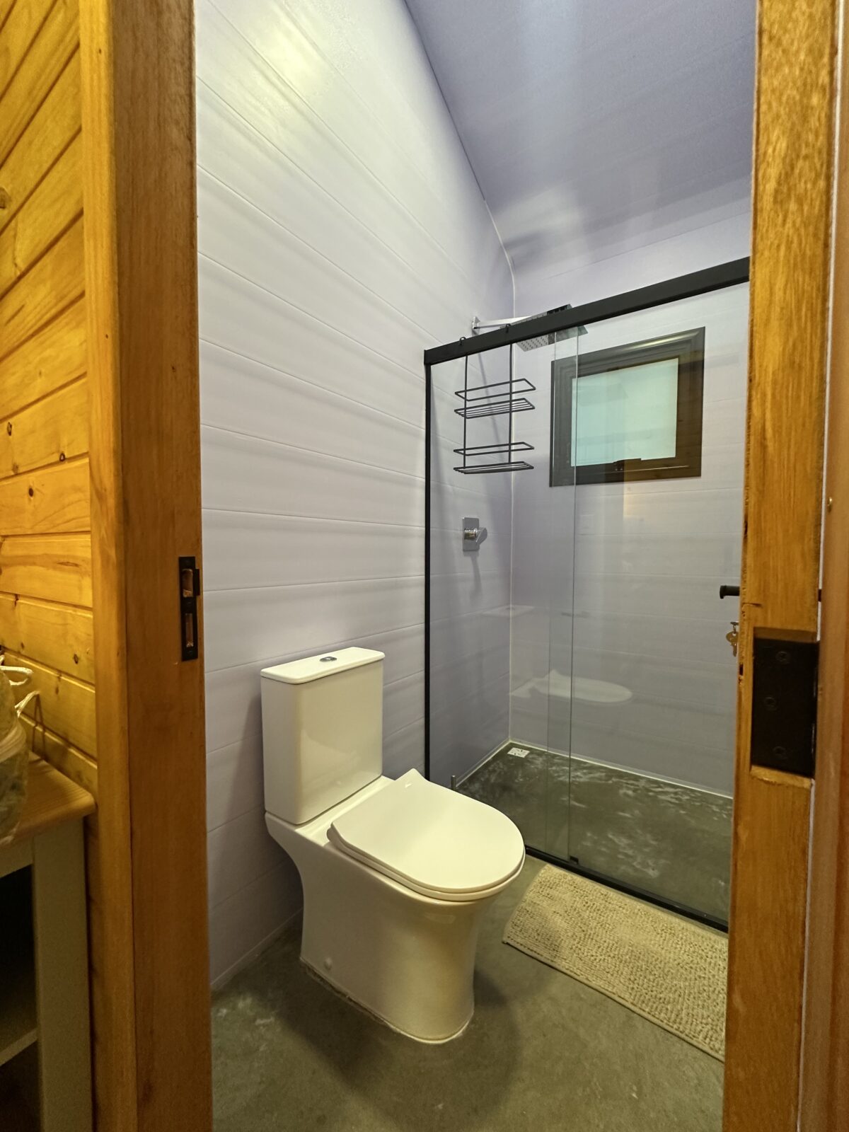 Já na área externa, a cabana dispõe de uma pequena varanda com cadeiras, perfeita para momentos de contemplação da natureza, escutar os sons da mata e desacelerar em meio ao verde.