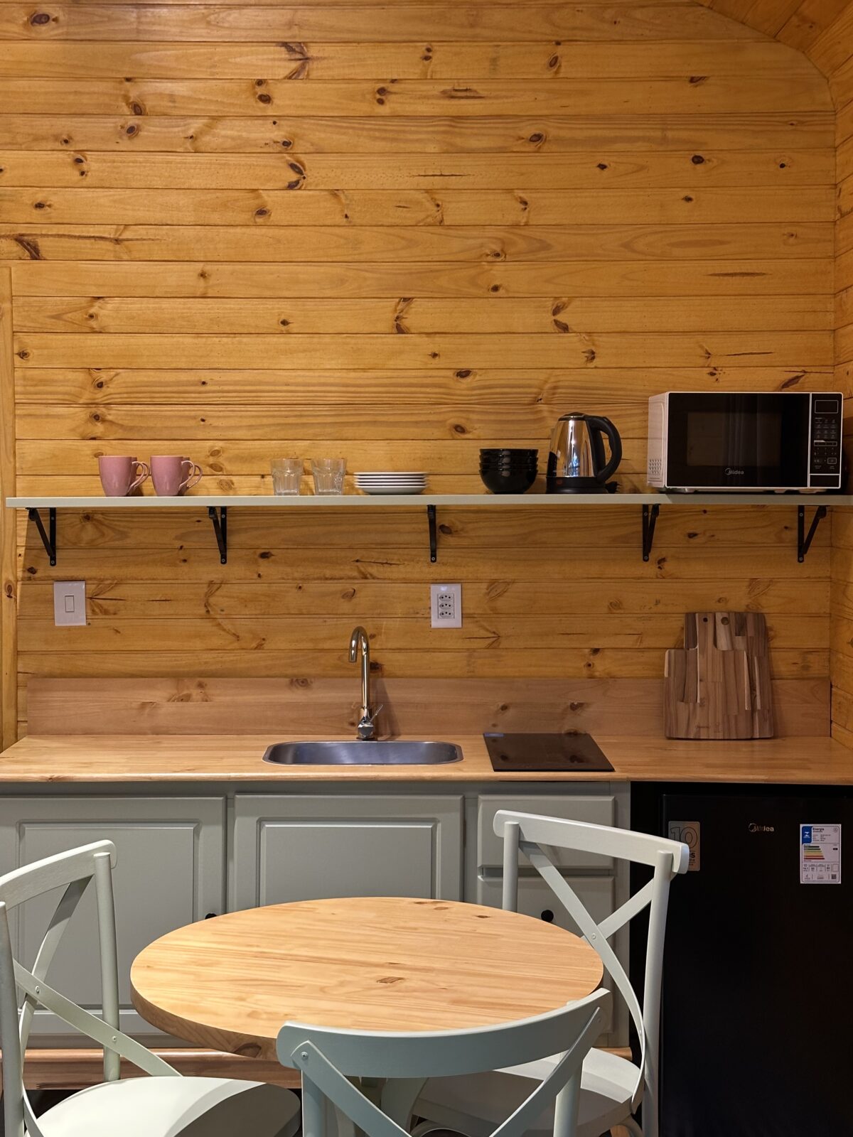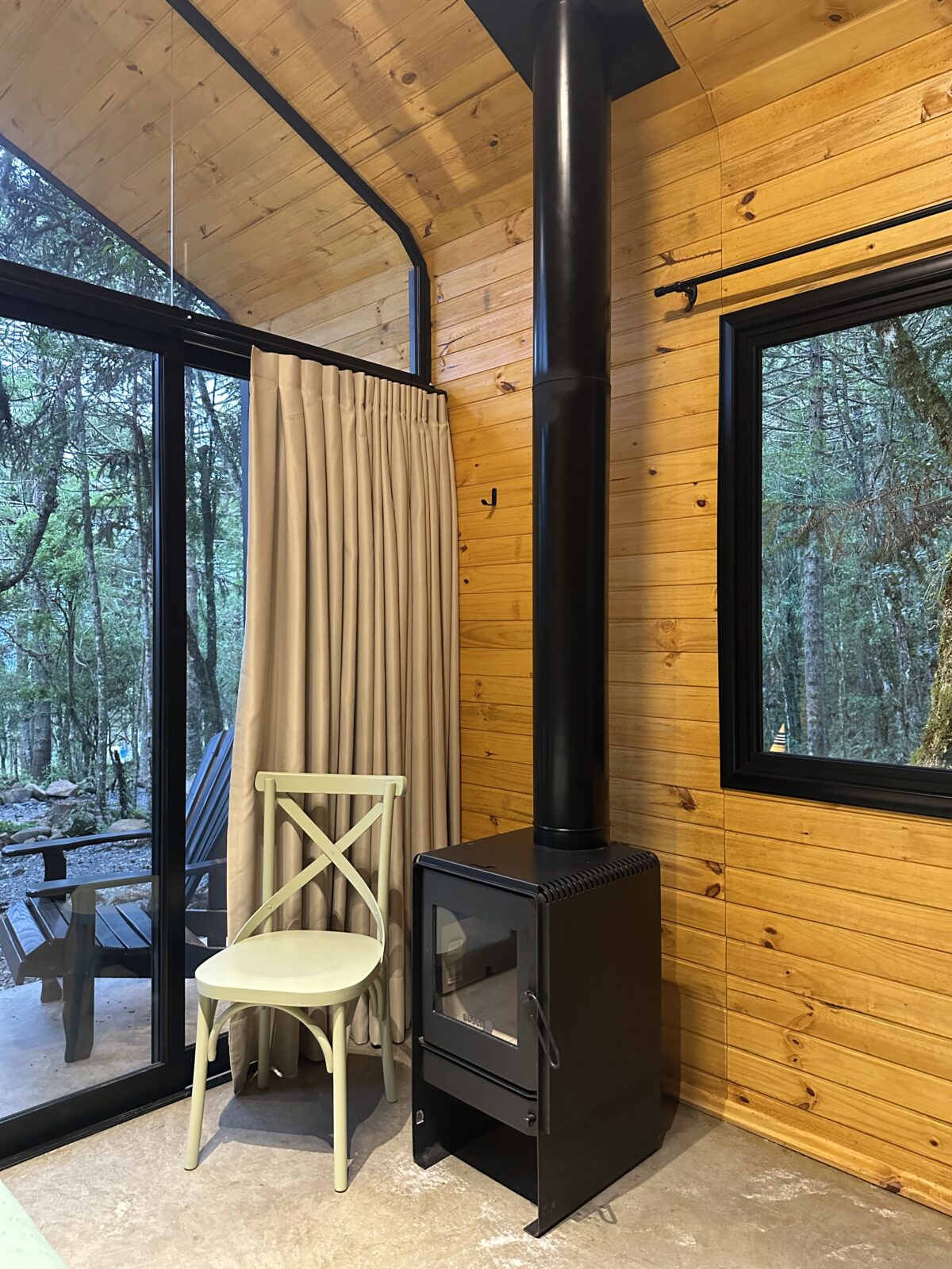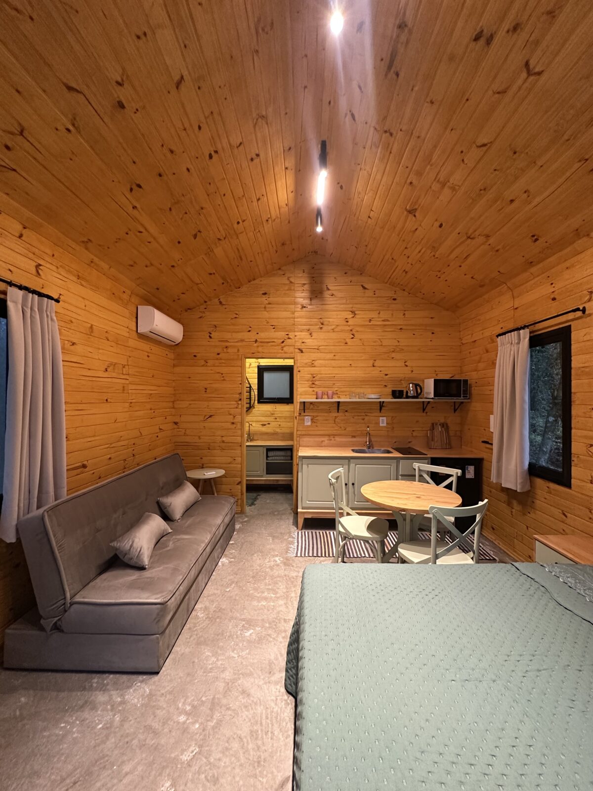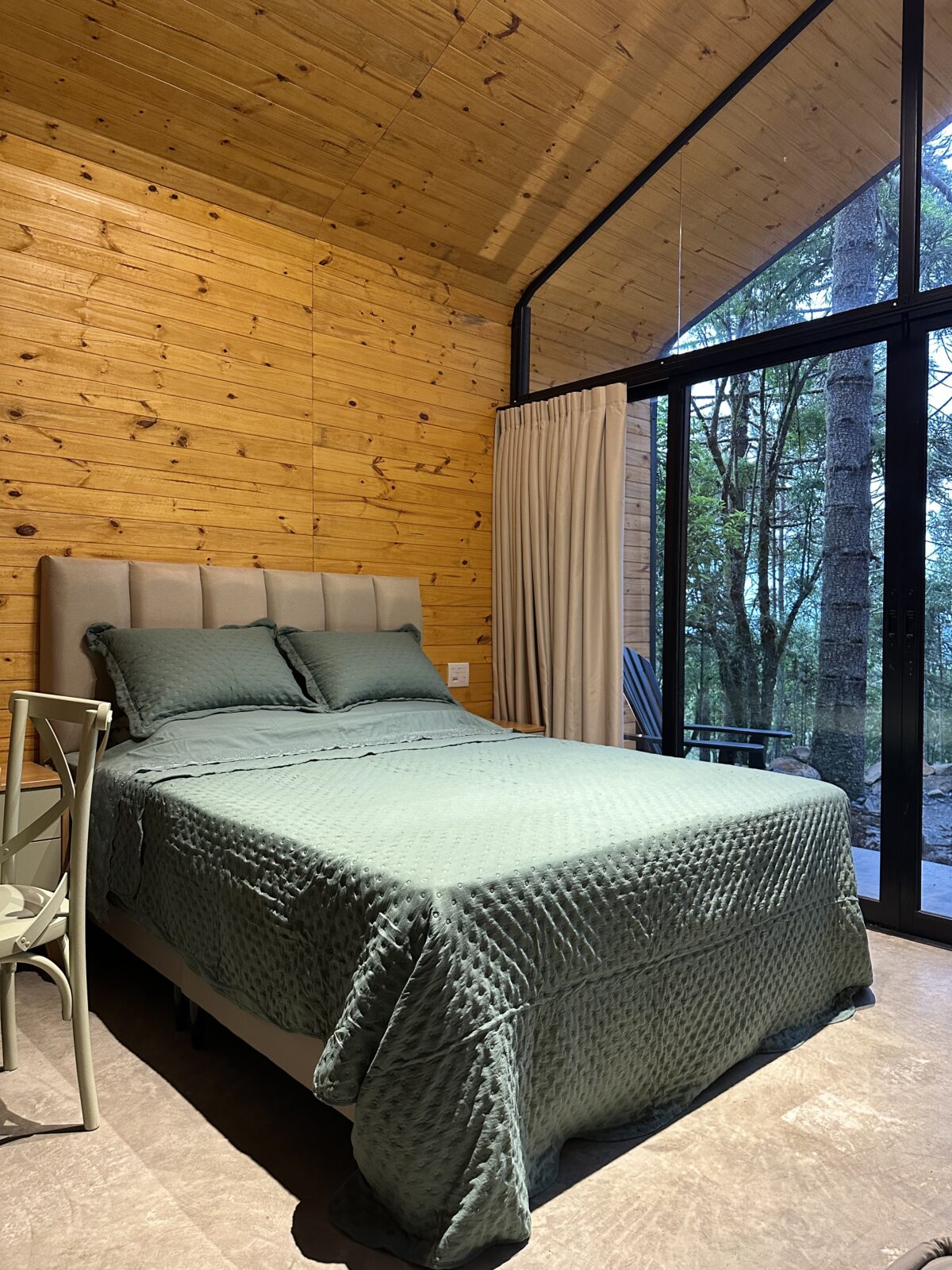 A área interna é inteiramente revestida em madeira, criando um ambiente acolhedor, com uma ampla janela que permite a entrada de luz natural e emoldura a vista para a mata. O ambiente é integrado em um único cômodo, o quarto possui uma cama queen, enxoval completo, lareira, cortinas blackout e ar condicionado.