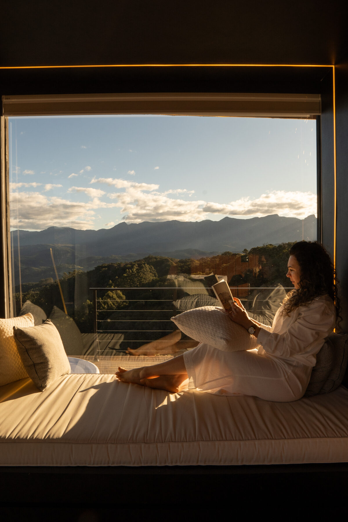 Além disso, para momentos de relaxamento, há uma banheira de imersão que oferece um toque especial. As grandes janelas de vidro, estrategicamente posicionadas, permitem que você desfrute de uma vista deslumbrante para a serra, conectando o conforto interior à beleza natural ao redor.