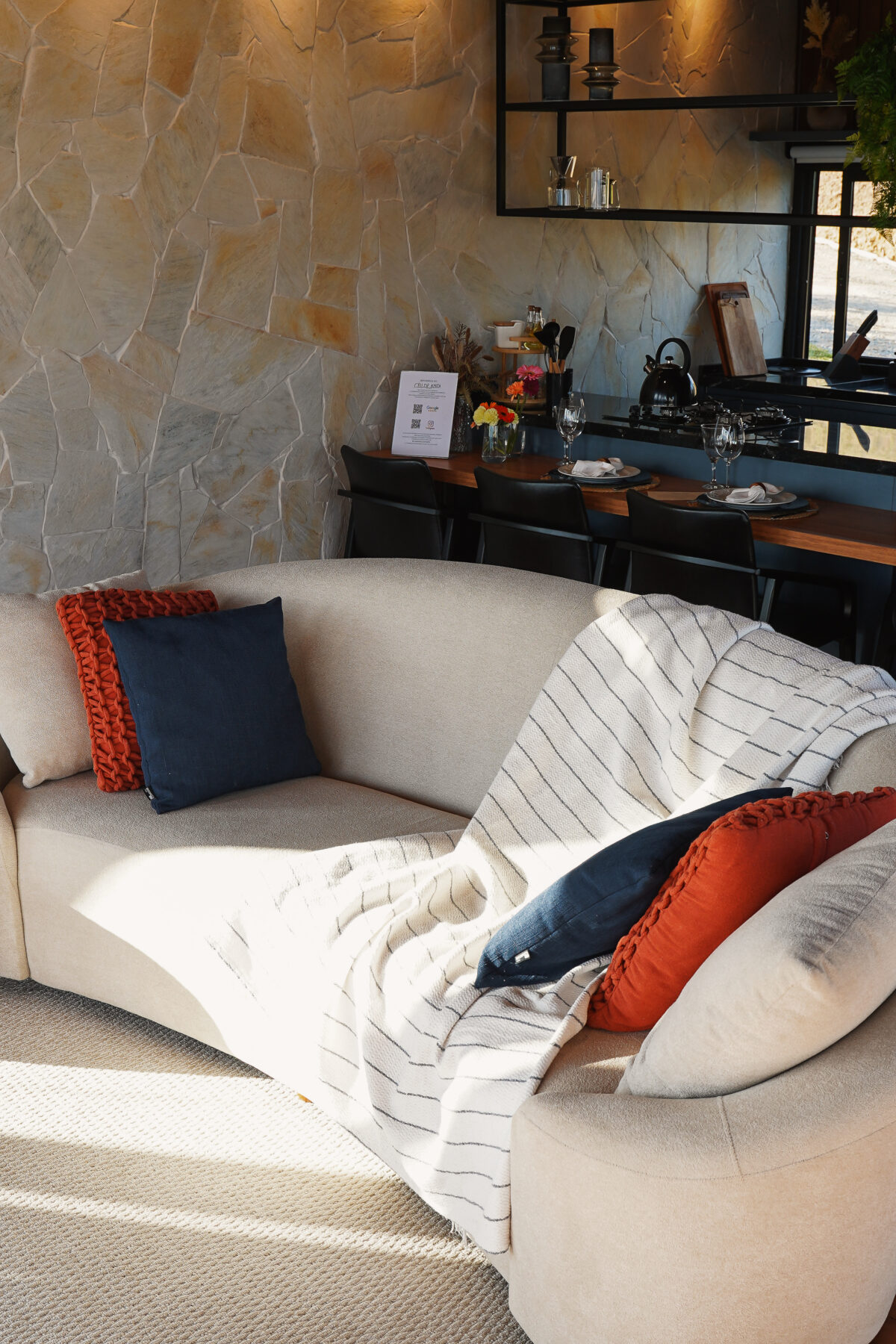 Situada a 1.000 metros de altitude, a área interna da cabana é 100% integrada, o espaço conta com um confortável living, onde um sofá, poltrona e uma lareira convidam ao descanso e aconchego. Ao lado, uma cama queen com enxoval 300 fios Trussardi, ar condicionado, cortinas blackout e Smart TV 55′.