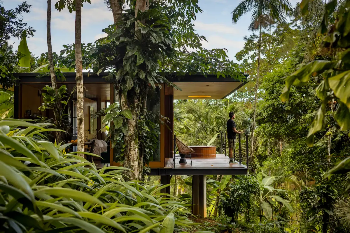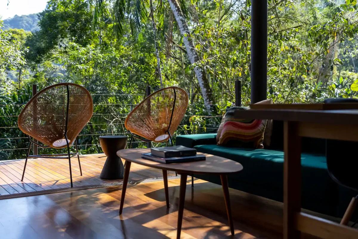 Além disso, na parte externa, um amplo deck com cadeiras convida a contemplar a vista para a mata. O ofurô de imersão é o grande destaque para banhos relaxantes ao ar livre. A cabana está situada em uma fazenda com grande parte preservada pelo santuário natural do Parque Estadual da Serra do Mar.