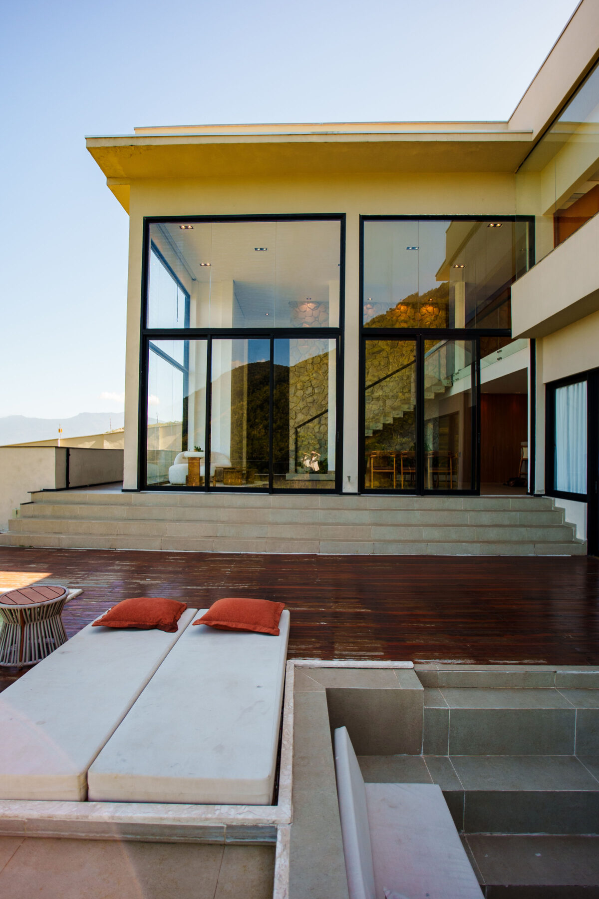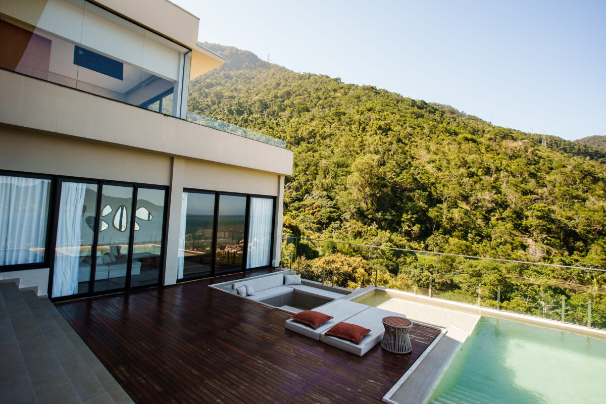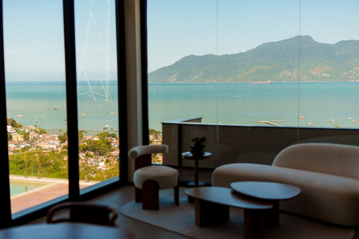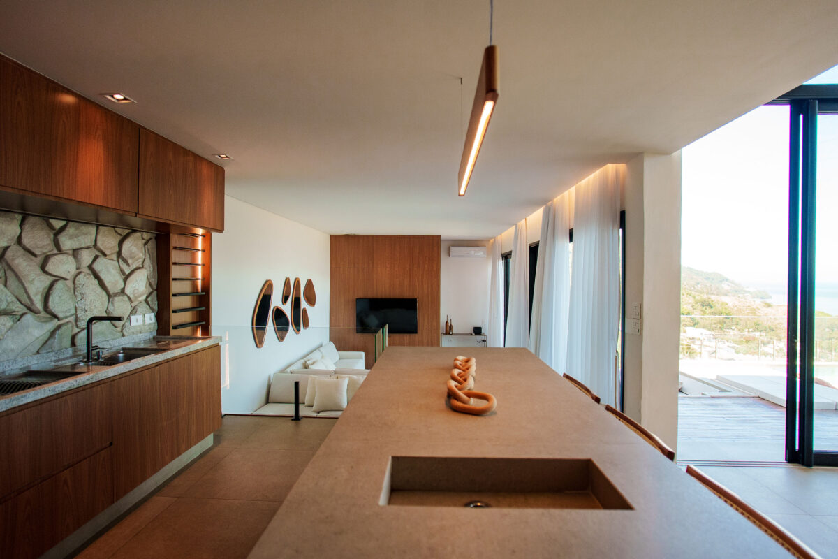 A área interna da casa foi pensada para proporcionar o máximo de conforto. Todos esses ambientes se conectam com a natureza ao redor, graças ao pé-direito alto e às amplas janelas, a casa recebe muita luz natural e vista privilegiada para o mar e para as montanhas.