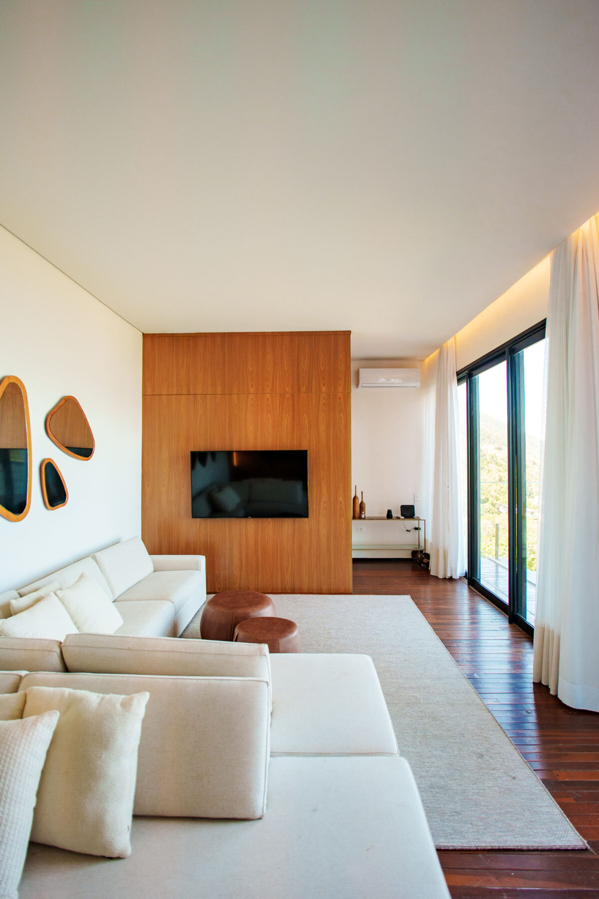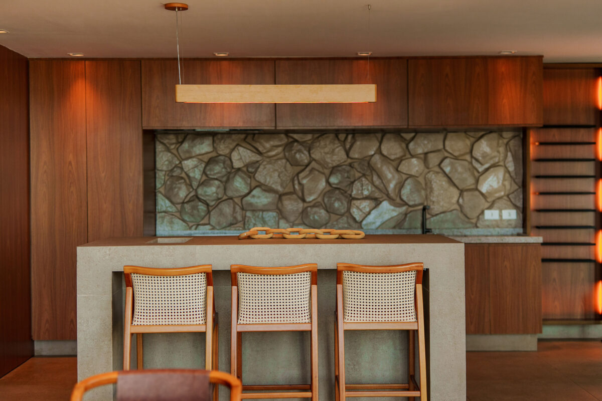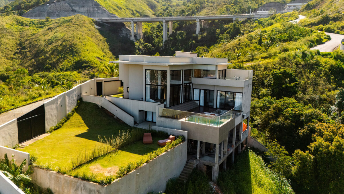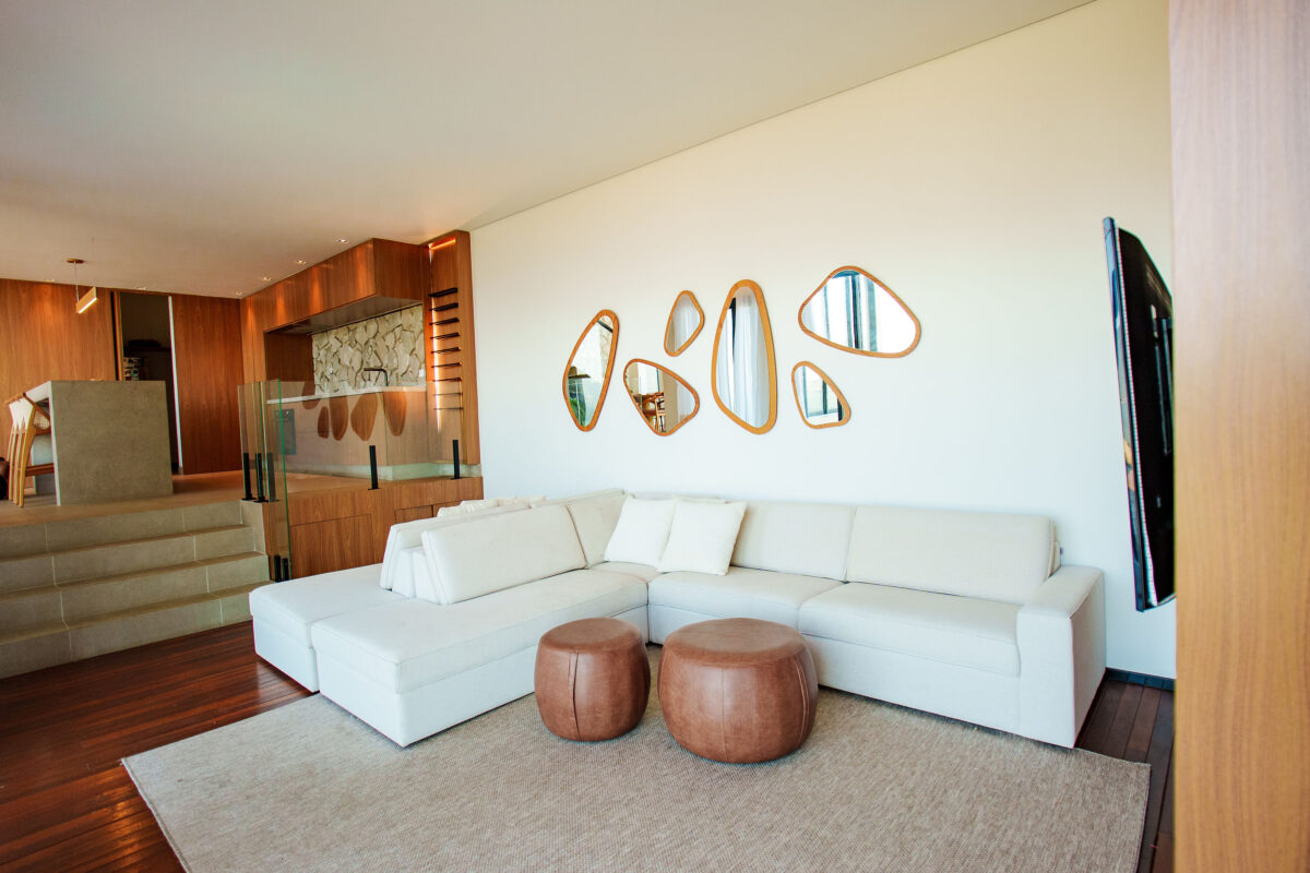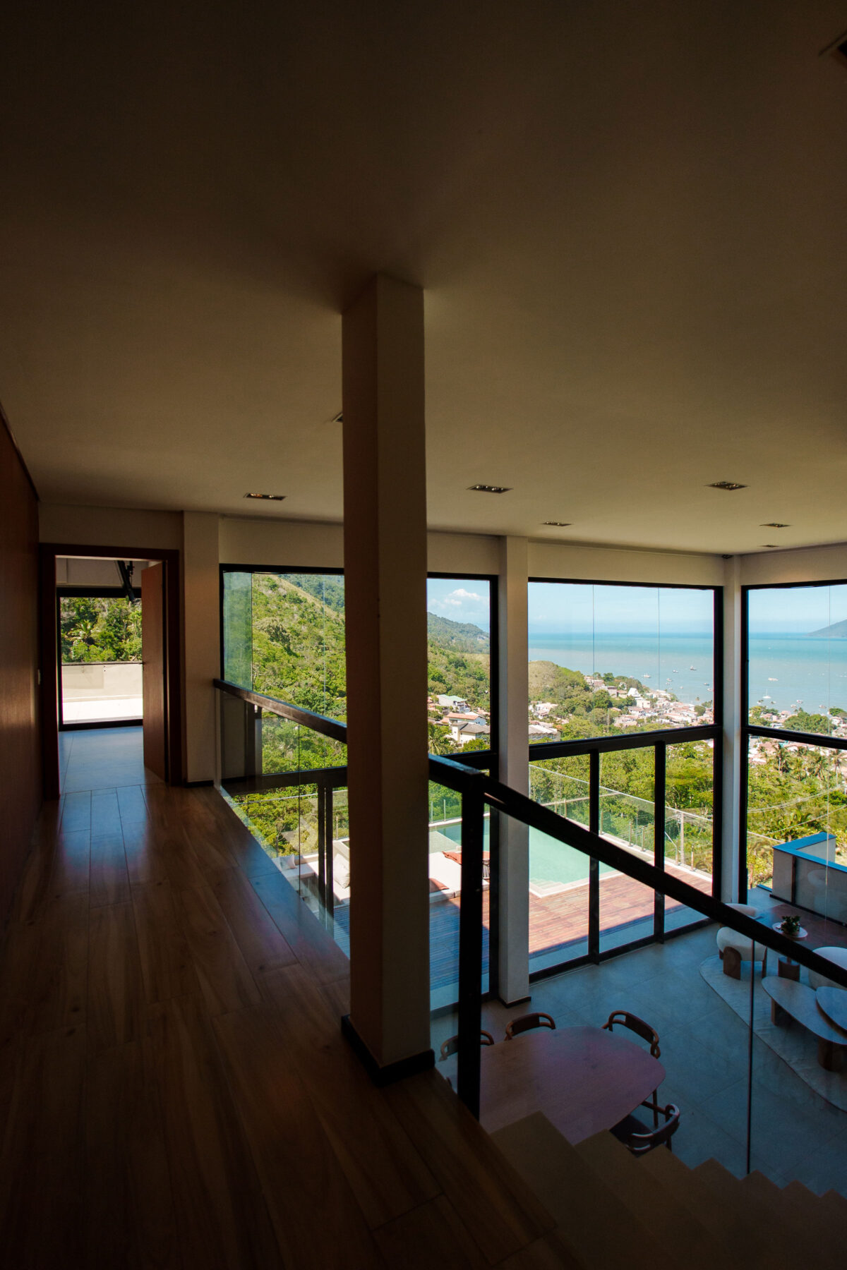 A área interna da casa foi pensada para proporcionar o máximo de conforto. Todos esses ambientes se conectam com a natureza ao redor, graças ao pé-direito alto e às amplas janelas, a casa recebe muita luz natural e vista privilegiada para o mar e para as montanhas.
