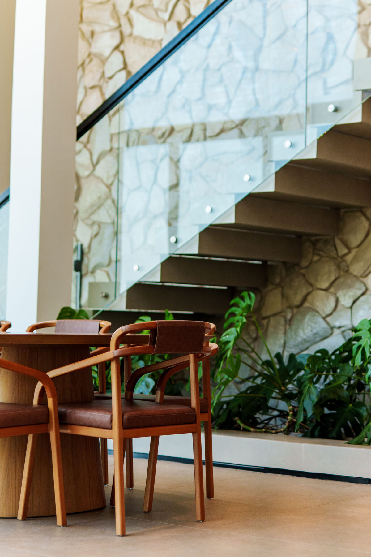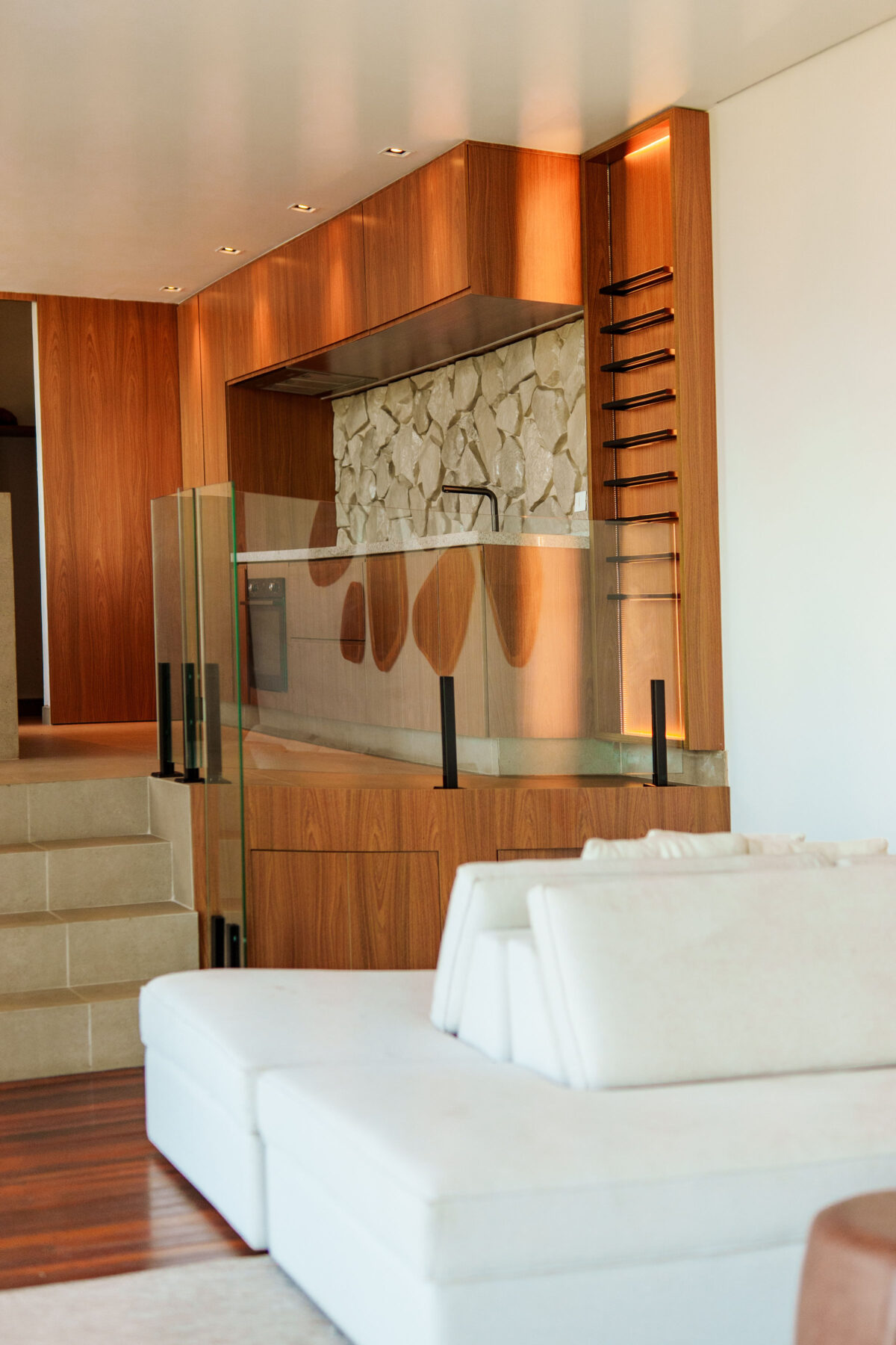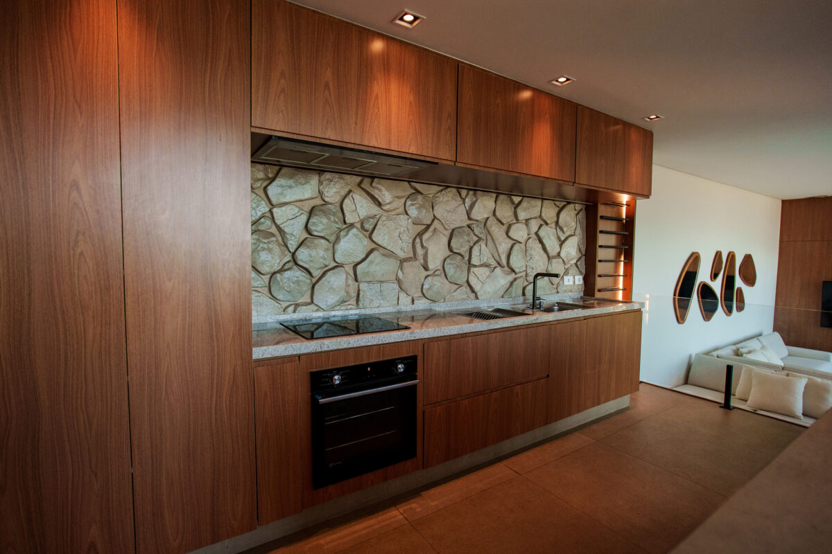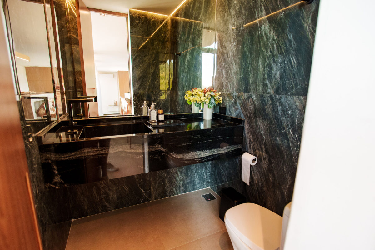 A área interna da casa foi pensada para proporcionar o máximo de conforto. Todos esses ambientes se conectam com a natureza ao redor, graças ao pé-direito alto e às amplas janelas, a casa recebe muita luz natural e vista privilegiada para o mar e para as montanhas.