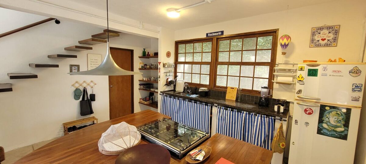 Ao lado, a mesa de refeições conecta o ambiente à cozinha, completa e funcional, equipada com fogão, geladeira, forno e armários com utensílios e eletroportáteis para o preparo refeições. Há também um banheiro completo com ducha de água quente e amenidades.