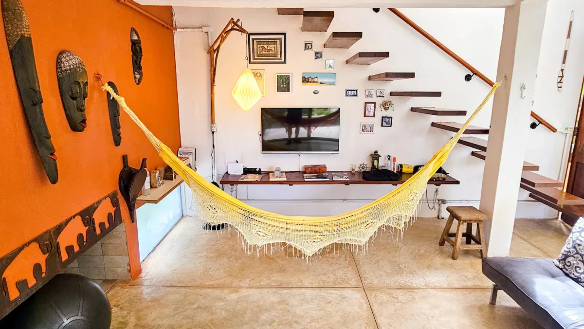 A área interna foi pensada para oferecer conforto e integração total entre os ambientes. A sala de estar conta com um sofá aconchegante, poltrona, Smart TV, lareira e redes de balanço que tornam o espaço ainda mais acolhedor para momentos de descanso.