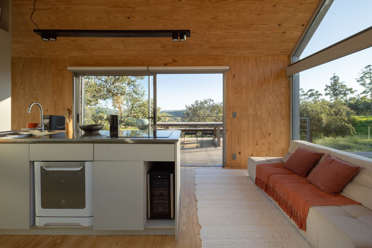 No espaço interno, a madeira predomina e reforça a sensação de conforto. A tecnologia se faz presente em cada detalhe: a casa conta com automação completa, incluindo cortinas, vidros inteligentes, iluminação e som ambiente. As amplas portas e janelas de vidro permitem a entrada abundante de luz natural.