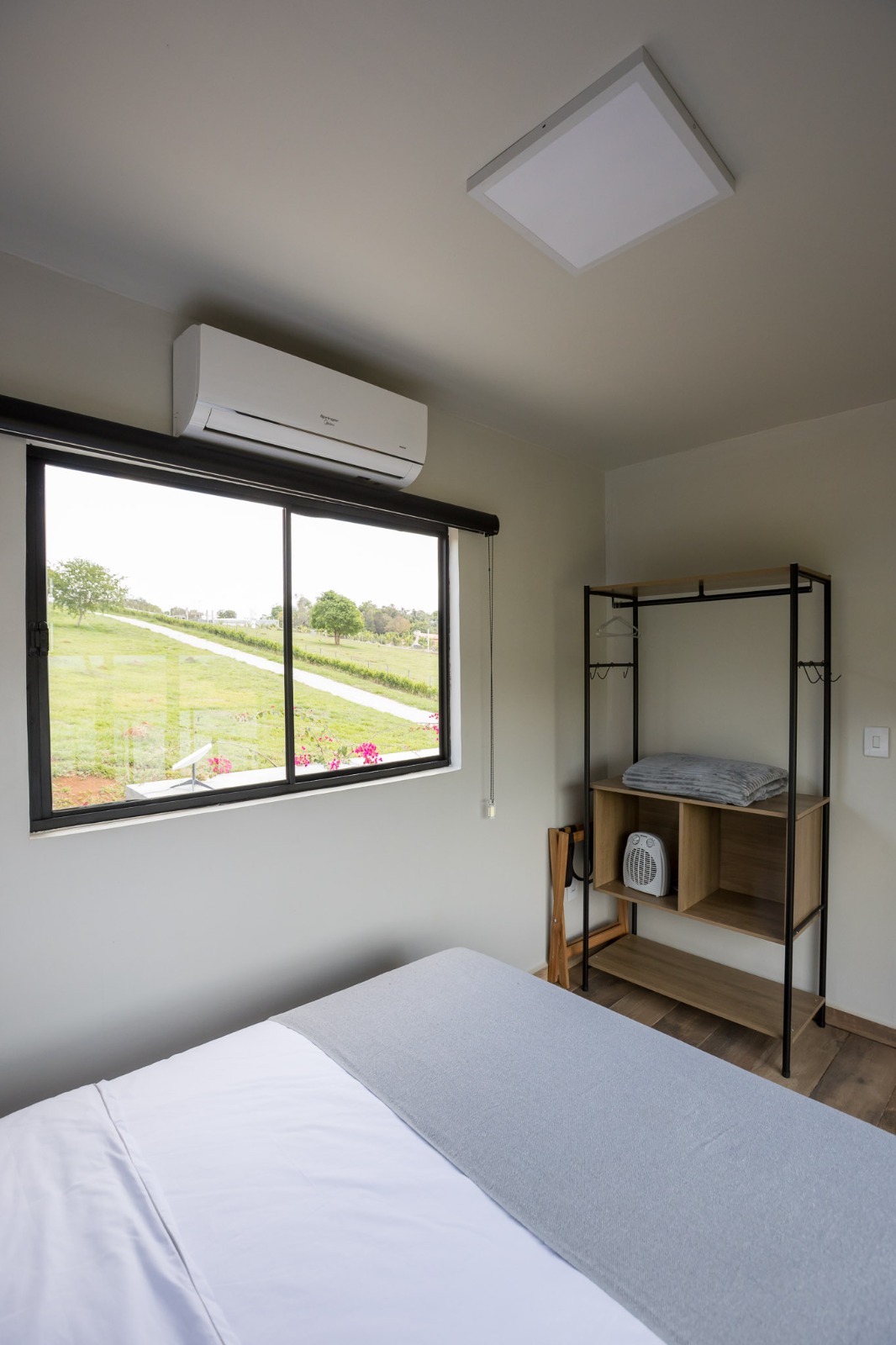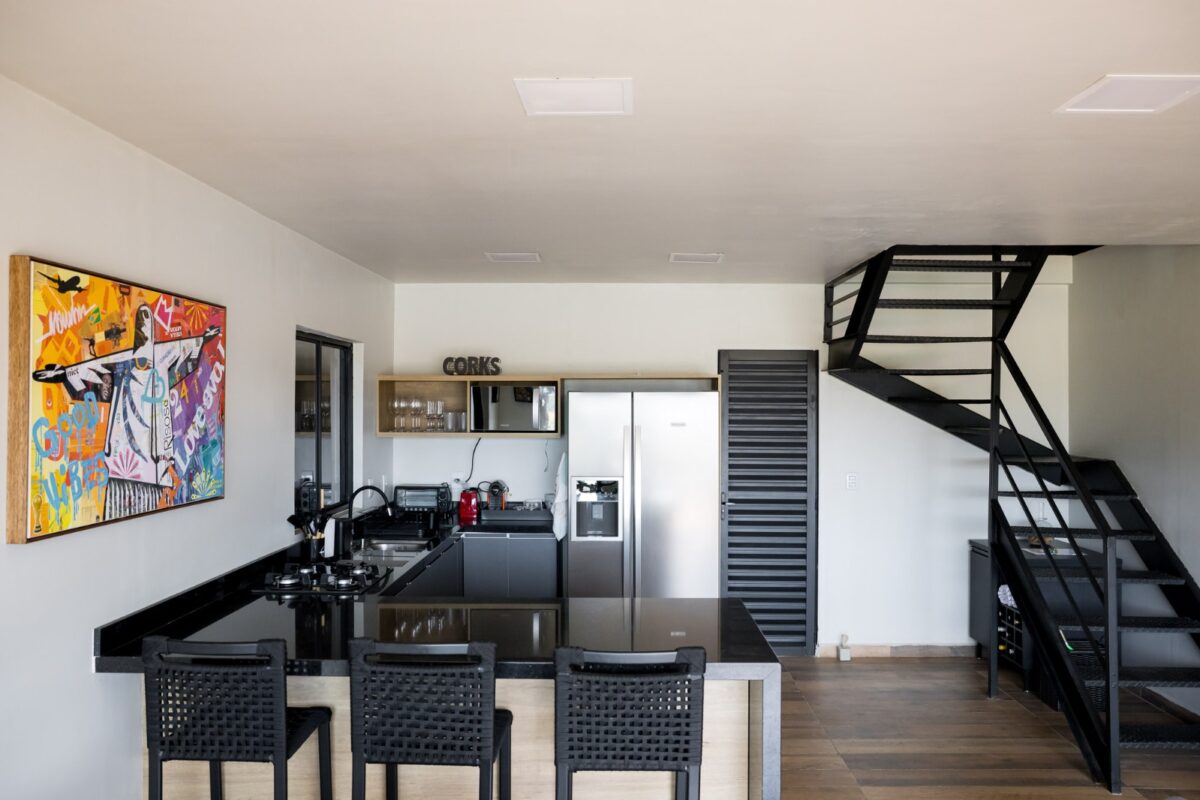 Além disso, há dois quartos aconchegantes, ambos com cama queen, enxoval de alta qualidade, ar-condicionado, espaço para itens pessoais e vista para a área externa. Há também dois banheiros, um sendo lavabo, equipado com ducha de água quente, toalhas, secador de cabelo e amenidades.