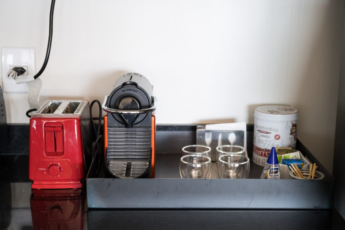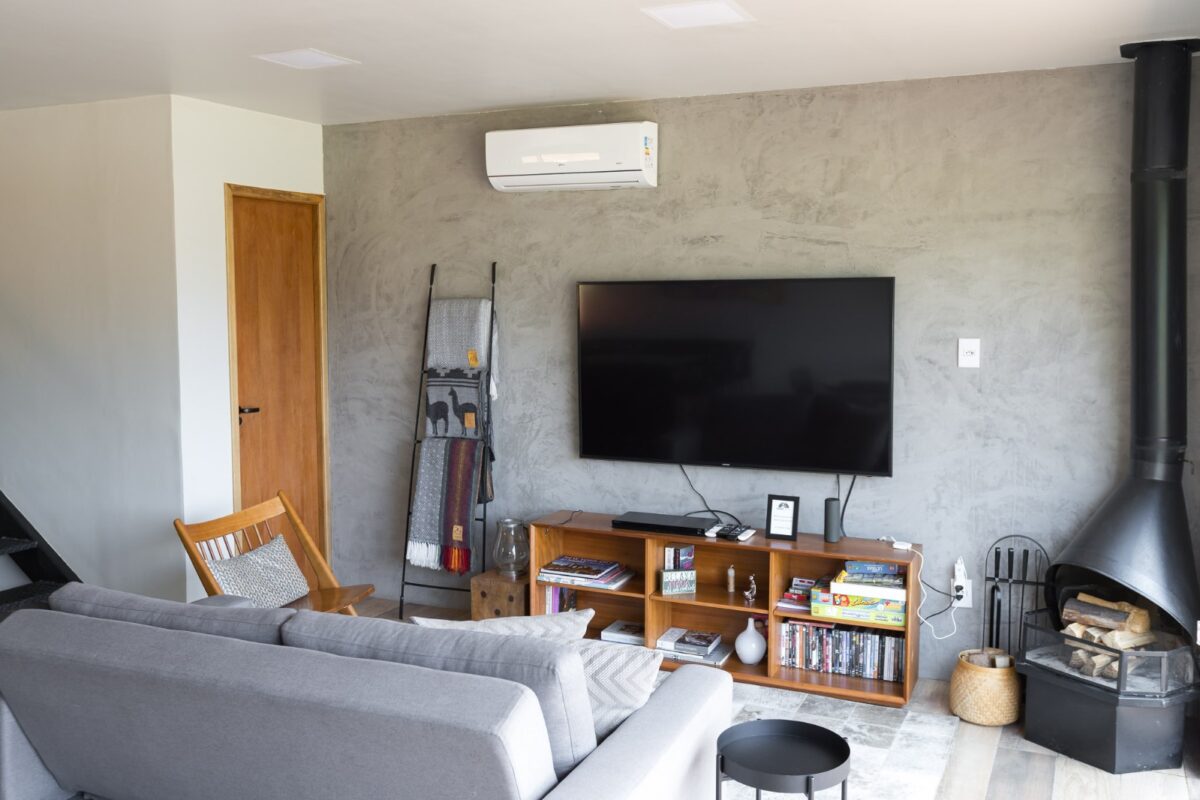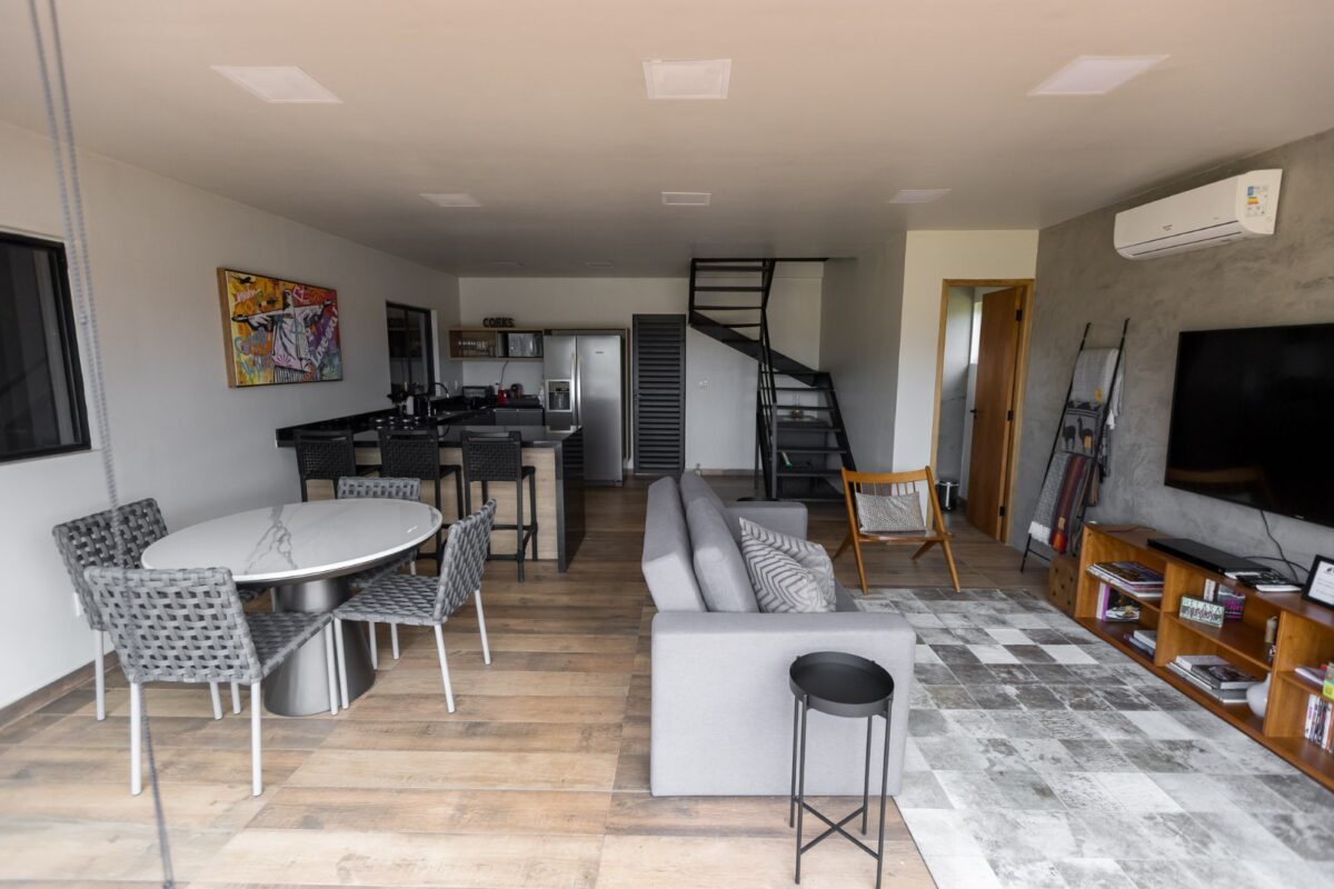 Na área interna, o espaço de estar é puro aconchego: sofá-cama super confortável, poltrona com mantas, lareira, Smart TV e ar-condicionado criam o ambiente ideal para relaxar. Ao lado, a mesa de refeições integra-se à cozinha completa, equipada com geladeira, cooktop, forninho elétrico, micro-ondas, cafeteiras e uma variedade de utensílios e eletroportáteis para o preparo de refeições.