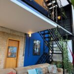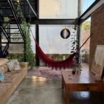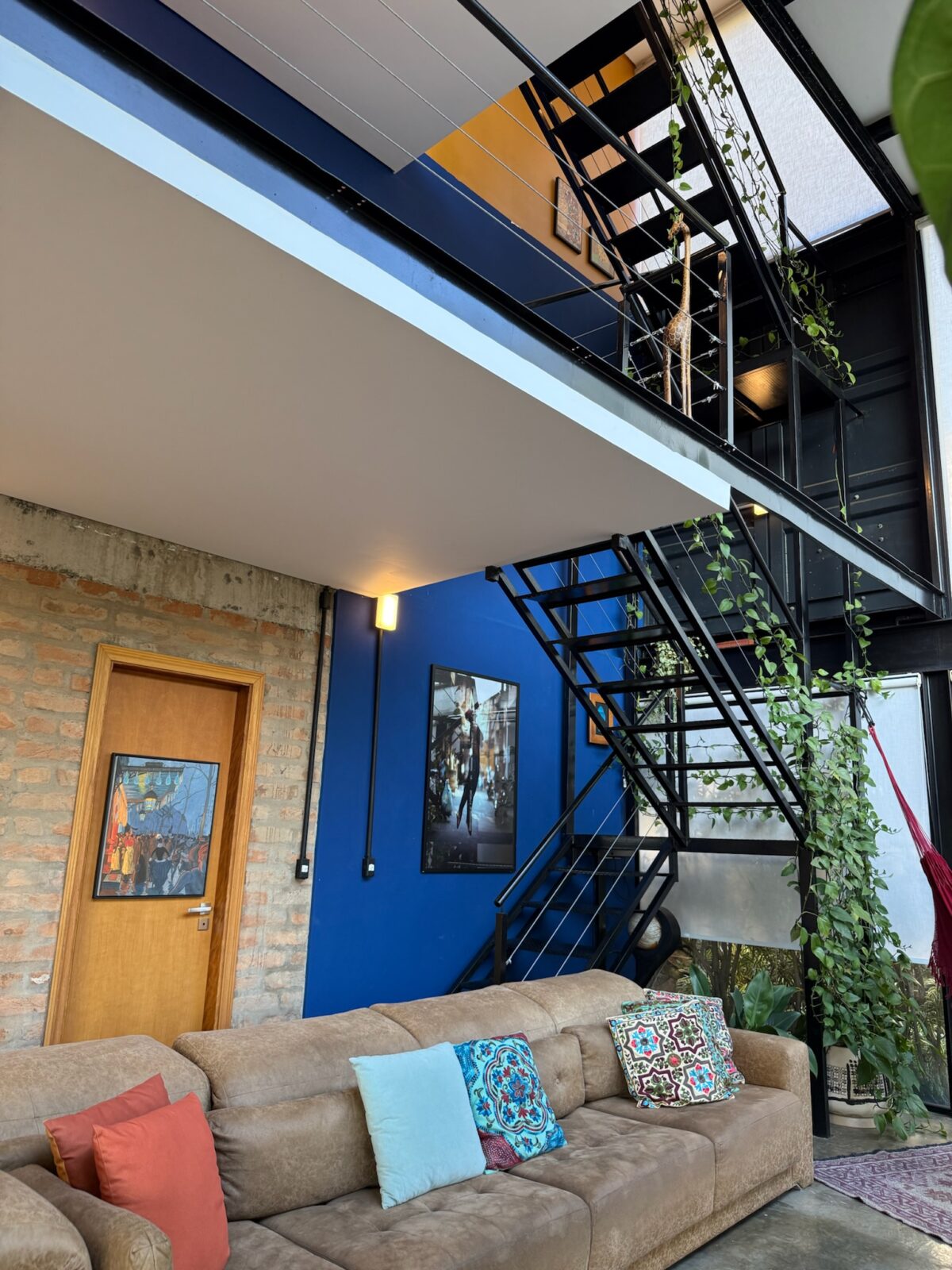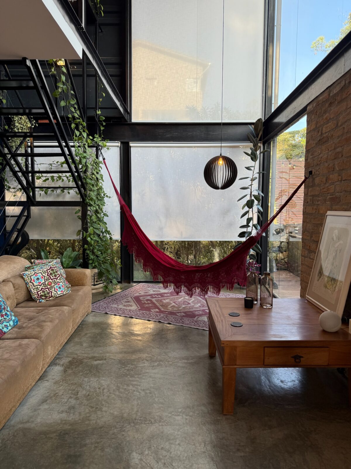Uma construção híbrida, combinando contêineres nas áreas íntimas com alvenaria de tijolos de demolição, criando um espaço sustentável e acolhedor. Por estar em um terreno em declive, o acesso principal leva diretamente ao nível superior, onde fica a suíte, com cama king, closet e varanda privativa. Além do hall de entrada e a charmosa varanda jardim, que traz a natureza para dentro da casa.