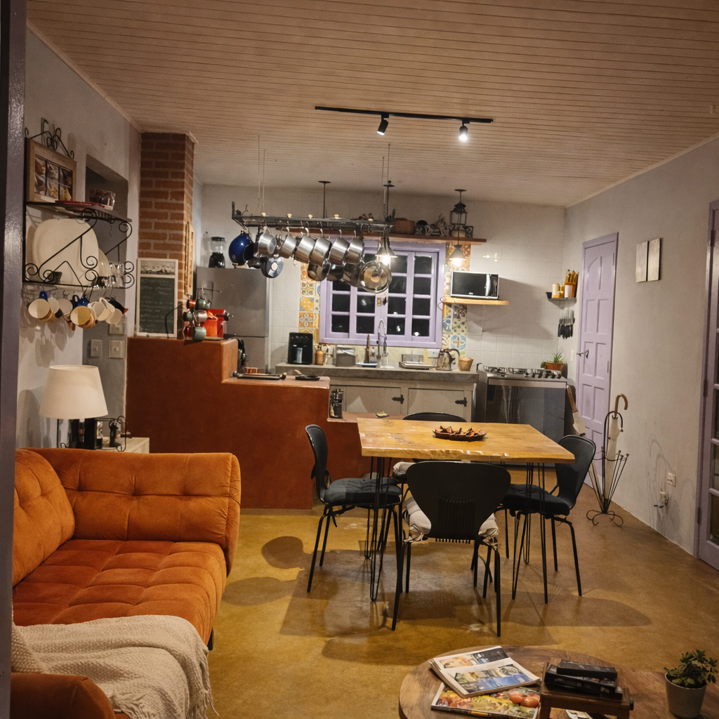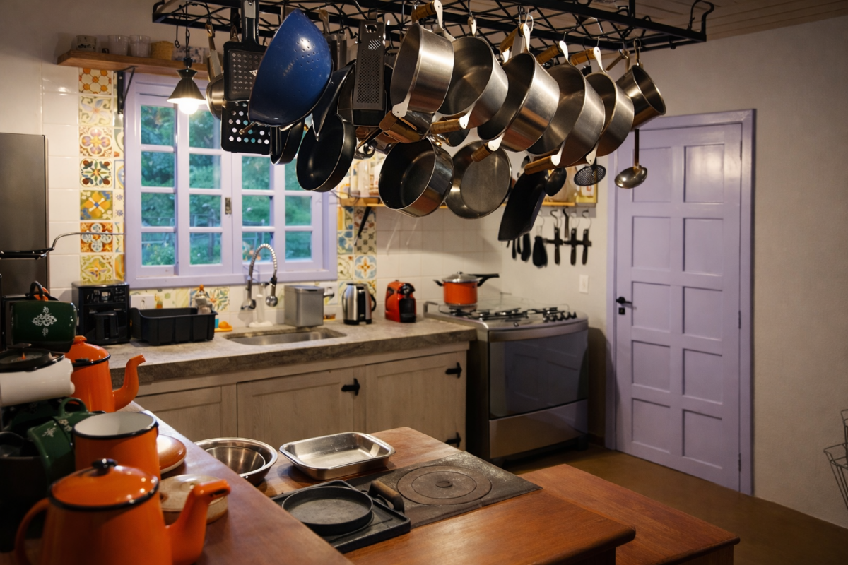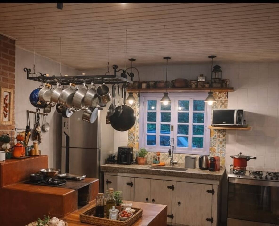 Os ambientes internos são integrados e muito aconchegantes. A sala de estar conta com sofá confortável e lareira, criando o cenário perfeito para relaxar. Integrado ao espaço, o espaço de de jantar com mesa para refeições se conecta à cozinha equipada, com geladeira, fogão, forno, micro-ondas, armários com diversos utensílios e eletroportáteis, além de um charme especial: o fogão a lenha.