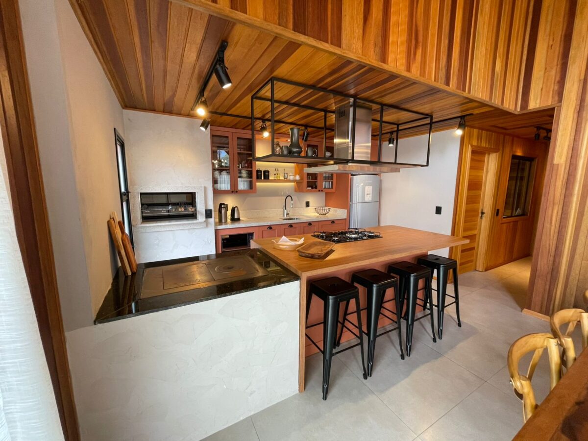 Integrada ao ambiente, a cozinha conta com uma ilha central, equipada com geladeira, cooktop, forno elétrico, micro-ondas, frigobar e uma variedade de utensílios, além de um charmoso fogão a lenha que traz o clima de interior.