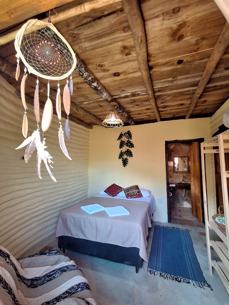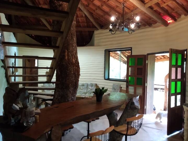 A cozinha integra o espaço, equipada com geladeira, fogão, forno e utensílios necessários para o preparo de refeições com calma. Há um mezanino em madeira de 30 m² com 1 colchão de casal e 2 de solteiro.