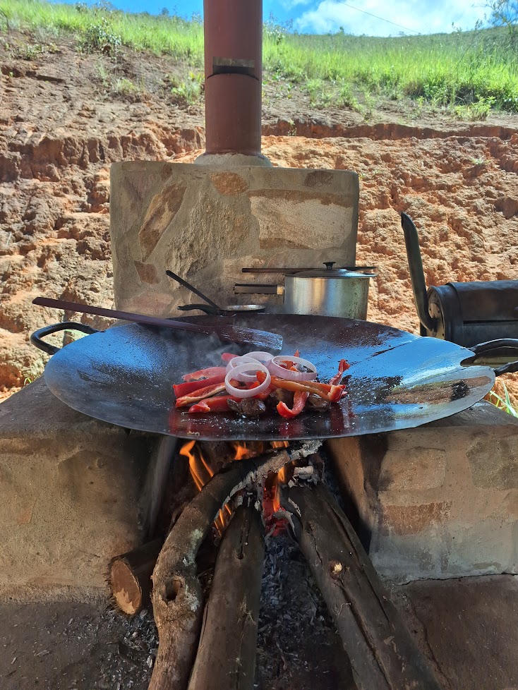 - Área externa com jardim, fogão a lenha e churrasqueira.