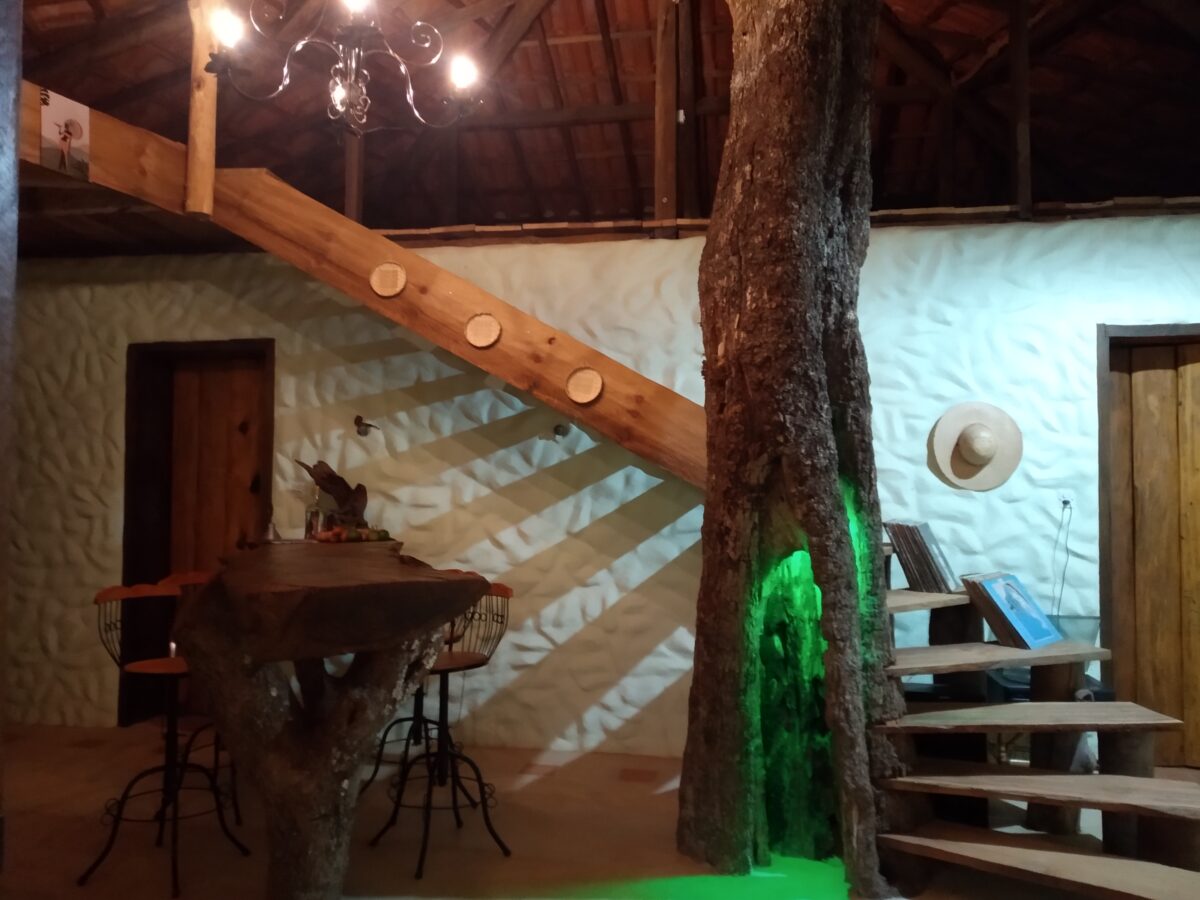 A área interna combina rusticidade e conforto na medida certa. O ambiente de estar é acolhedor, com sofá e poltronas, além de uma Smart TV para momentos de descanso. Um charmoso som de vinil, acompanhado de uma seleção diversa de LPs.