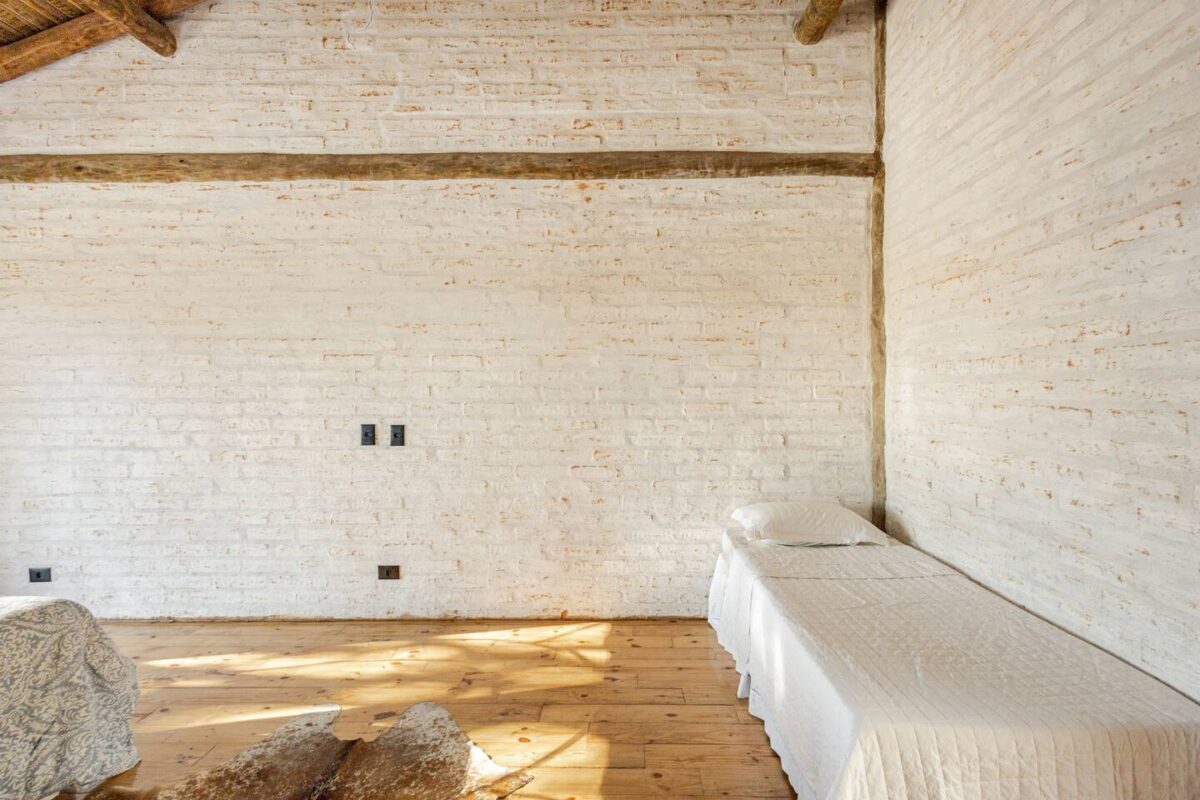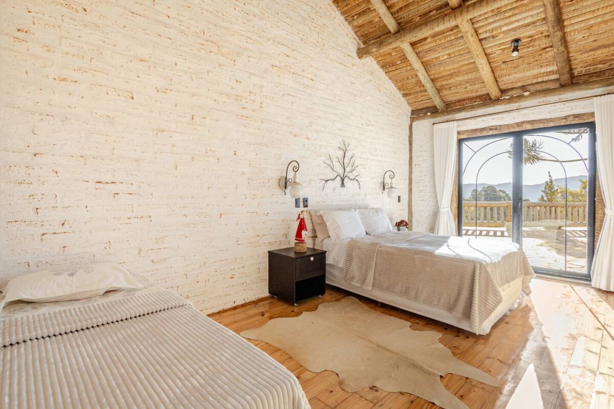 Possuímos duas suítes com cama de casal, uma cama de solteiro e um sofá cama de solteiro. Ainda conta com uma suíte master com direito a banheira de hidromassagem. Todos os quartos possuem saída para o deck e vista para o jardim de inverno. Acomodamos 12 pessoas confortavelmente nos quartos.