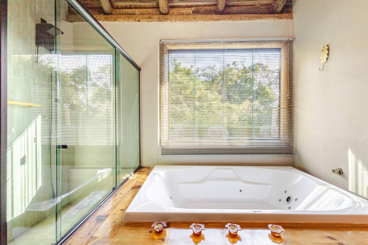 O banheiro da suíte master possui uma super vista para a natureza. Fornecemos roupa de cama, travesseiros, toalhas internas e externas.