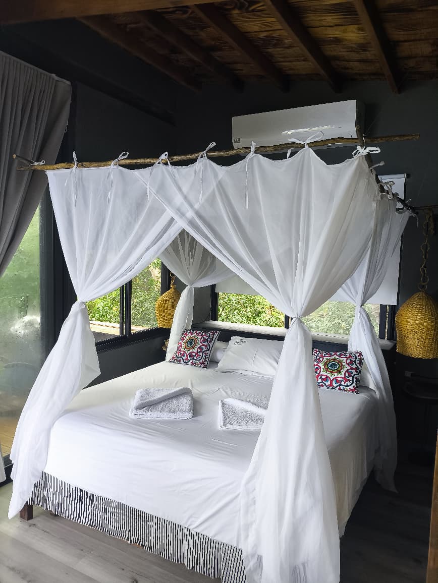 O quarto principal com uma cama king size com enxoval completo, cortinas blackout e ar-condicionado, além de uma cama auxiliar de casal, acomodando até quatro pessoas com conforto. O banheiro dispõe de ducha com água quente, toalhas, amenidades e secador de cabelo.