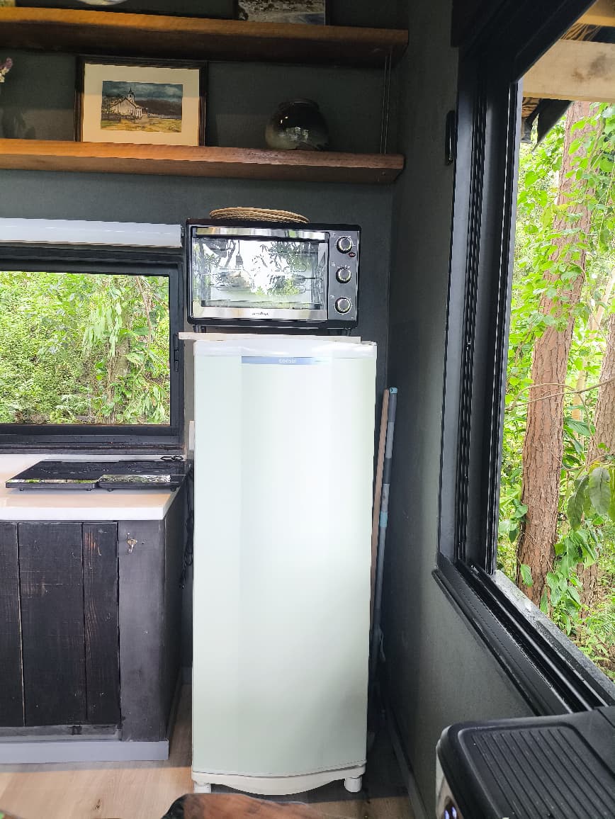 Além disso, integrando o ambiente, a cozinha compacta, mas bem equipada com cooktop por indução, geladeira, forninho elétrico, cafeteira e armários com utensílios e eletroportáteis para o preparo de refeições.