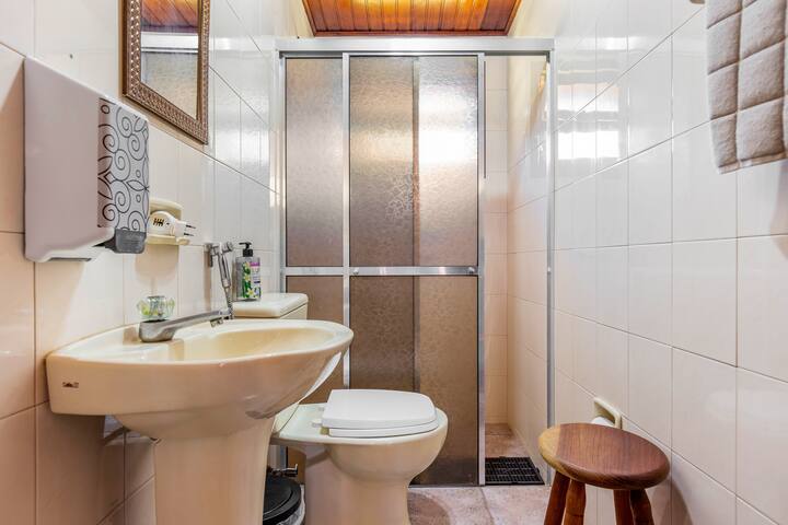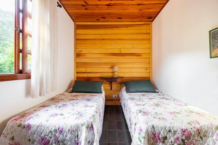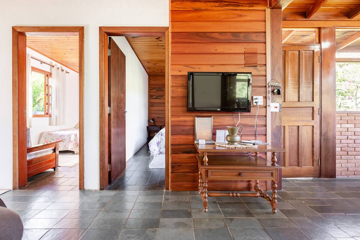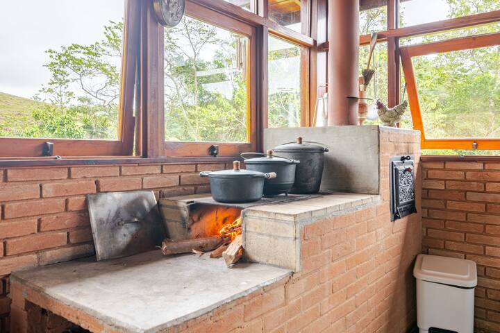 Na área interna, a casa reúne charme e conforto em cada cantinho. A sala principal conta com sofá e poltrona aconchegante, Smart TV e lareira para aquecer os dias frios da serra. Integrando o ambiente, a mesa de refeições conecta-se à cozinha completa, equipada com geladeira, fogão, forno, micro-ondas, utensílios e eletroportáteis, além de um charmoso fogão a lenha que dá um toque especial.