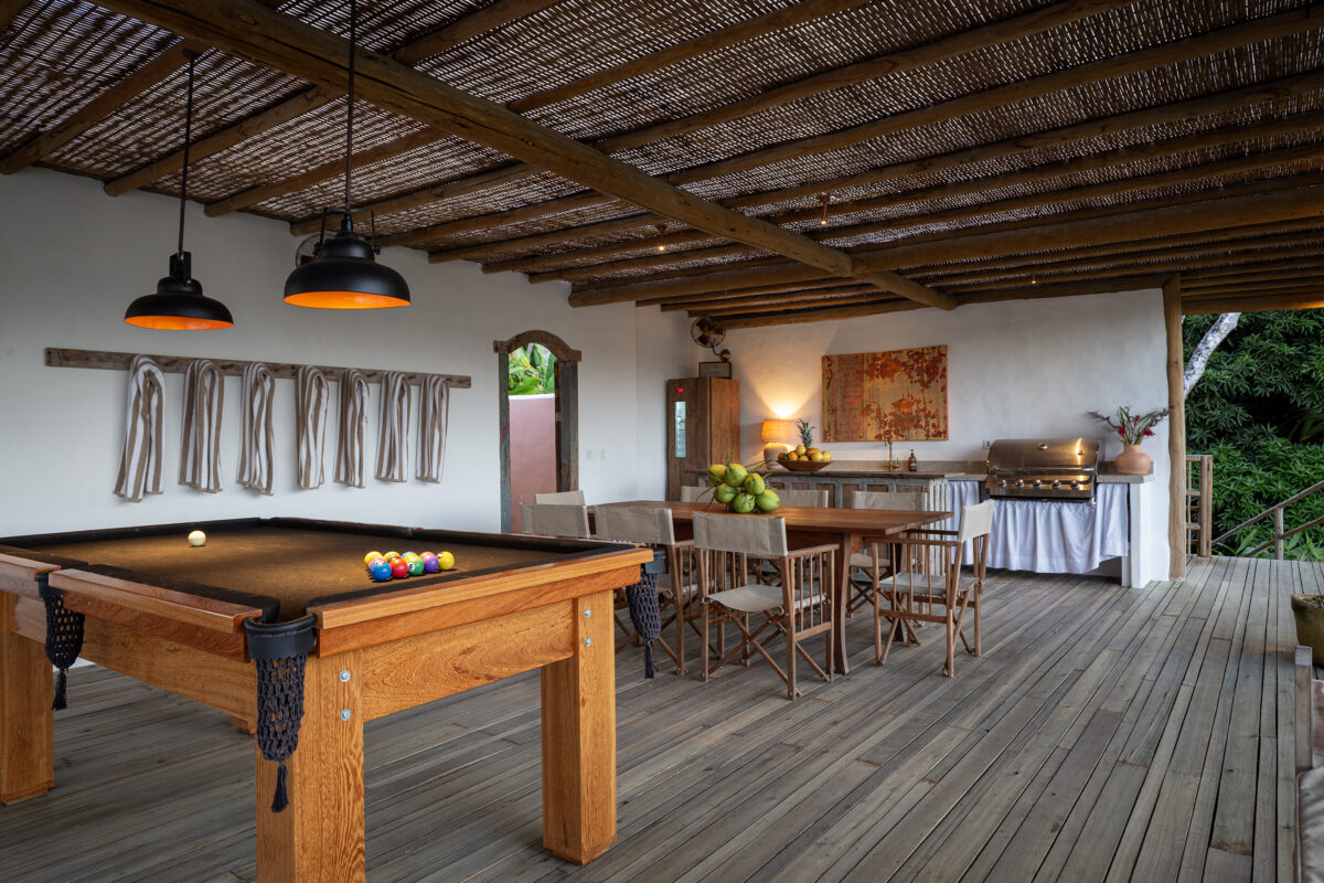 Na área externa, a experiência é simplesmente encantadora. A casa é cercada por um amplo deck de madeira, com mesas e cadeiras para refeições ao ar livre, espreguiçadeiras, churrasqueira e mesa de sinuca para momentos de descontração. O grande destaque fica por conta da piscina com borda infinita, que se integra à paisagem. Situada em uma fazenda cercada por natureza, a propriedade ainda oferece quadra de beach tênis, trilhas, área de agrofloresta e acesso ao Rio da Barra.
