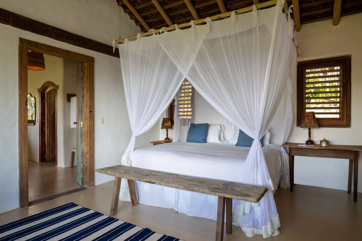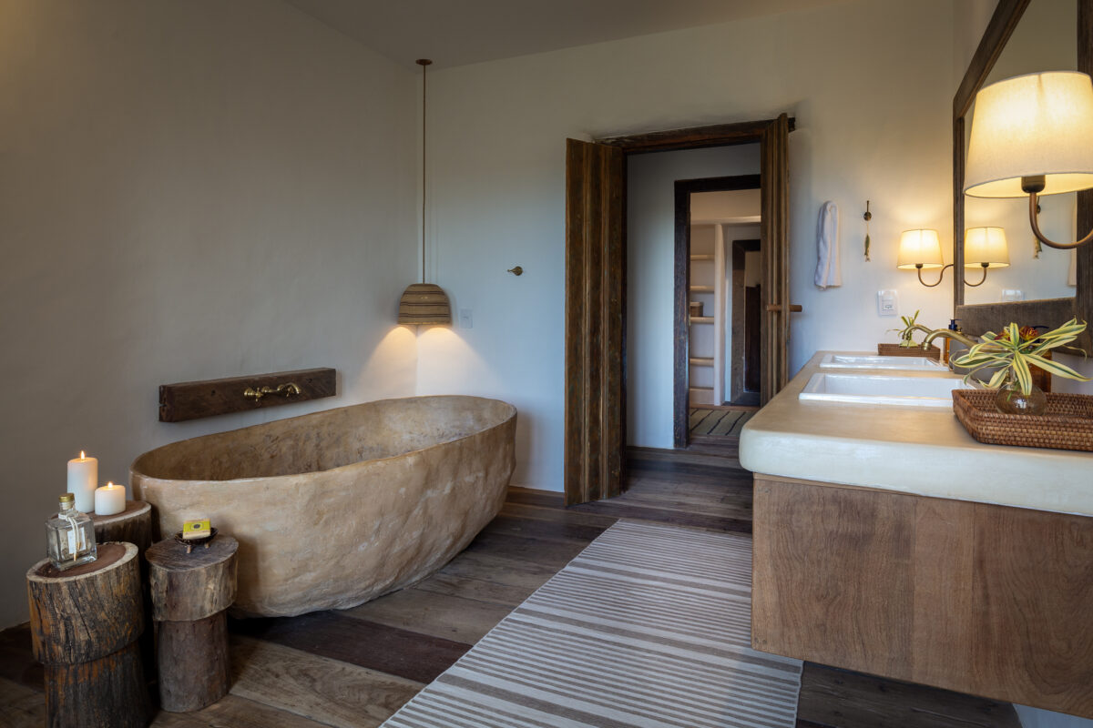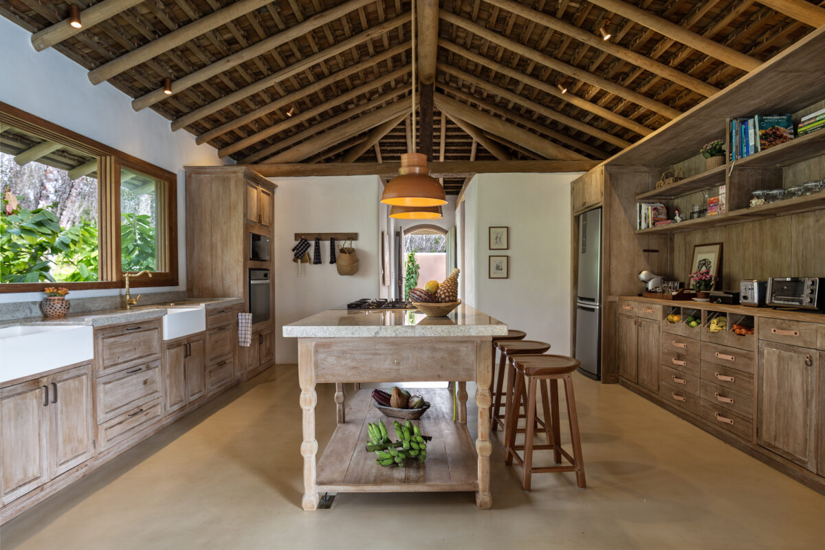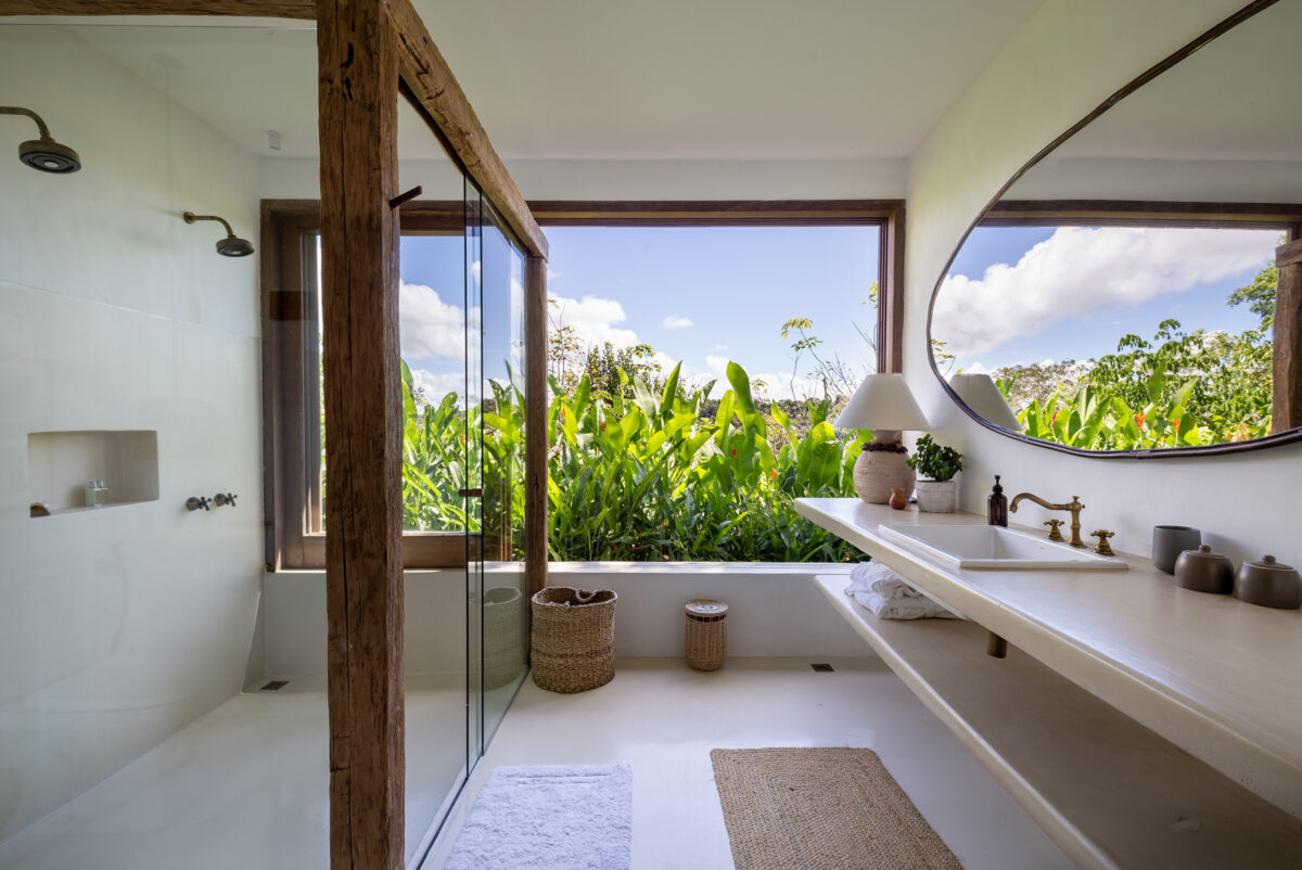 Além disso, a casa dispõe de quatro suítes, todas com uma cama queen size cada, enxoval completo, ar-condicionado e espaço para itens pessoais. Algumas delas ainda oferecem acesso a uma varanda privativa, reforçando a conexão com o entorno natural. Os banheiros possuem ducha com água quente, toalhas, amenidades e secador de cabelo, e uma das suítes conta com banheira de imersão, perfeita para momentos de relaxamento.