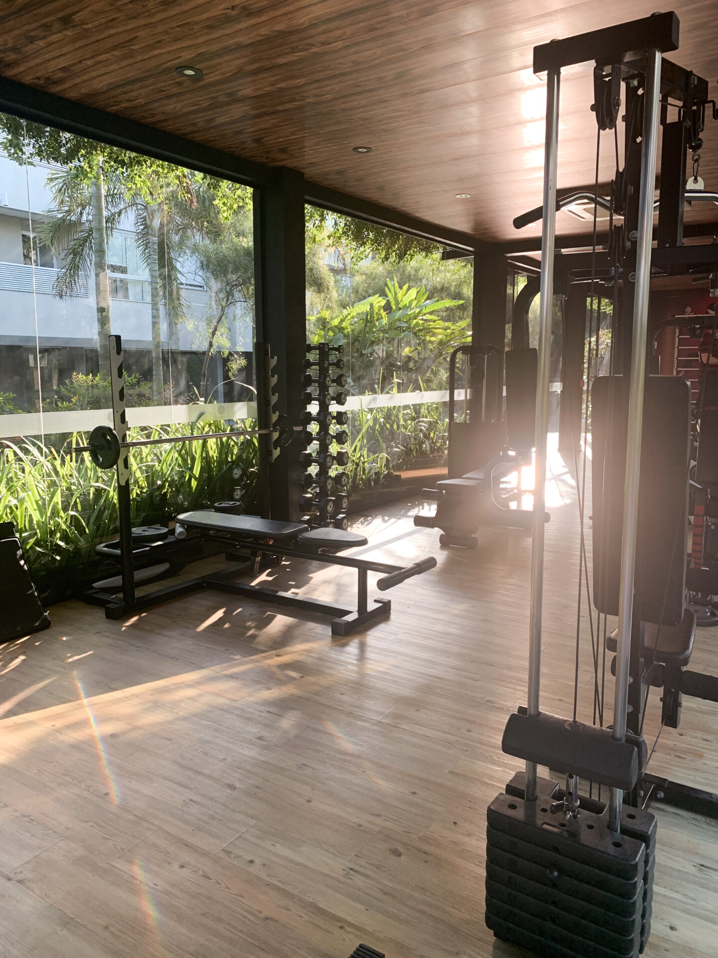 Já no pavimento inferior você encontra o hall de entrada, a espaçosa e equipada academia, assim como outra suíte com vista para o jardim frontal.