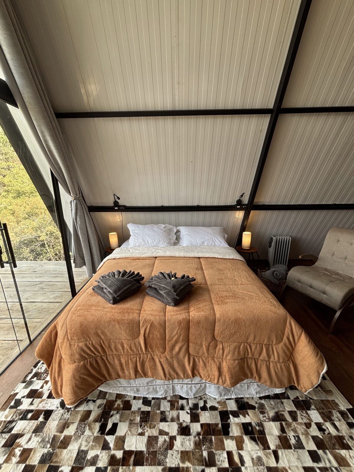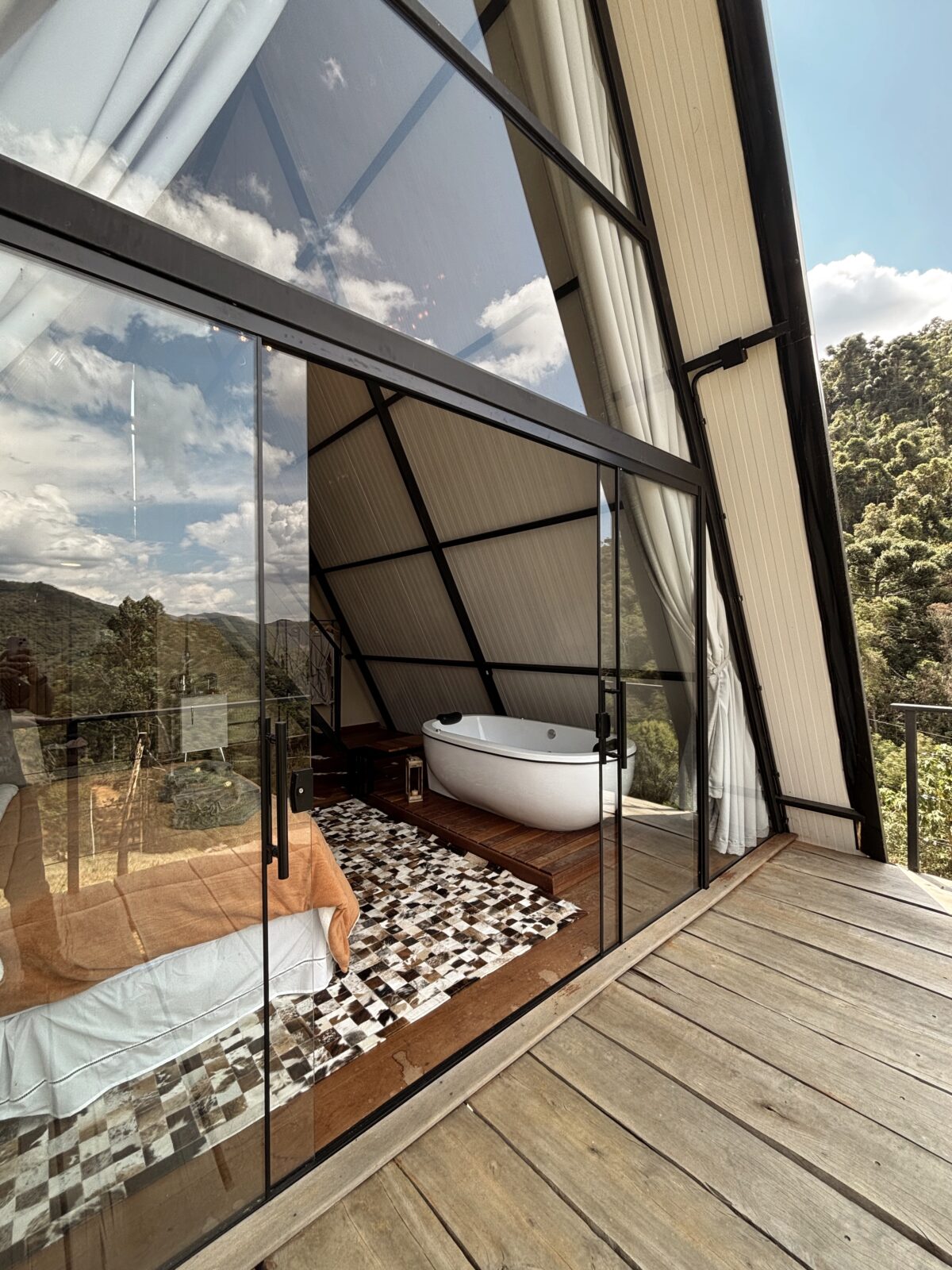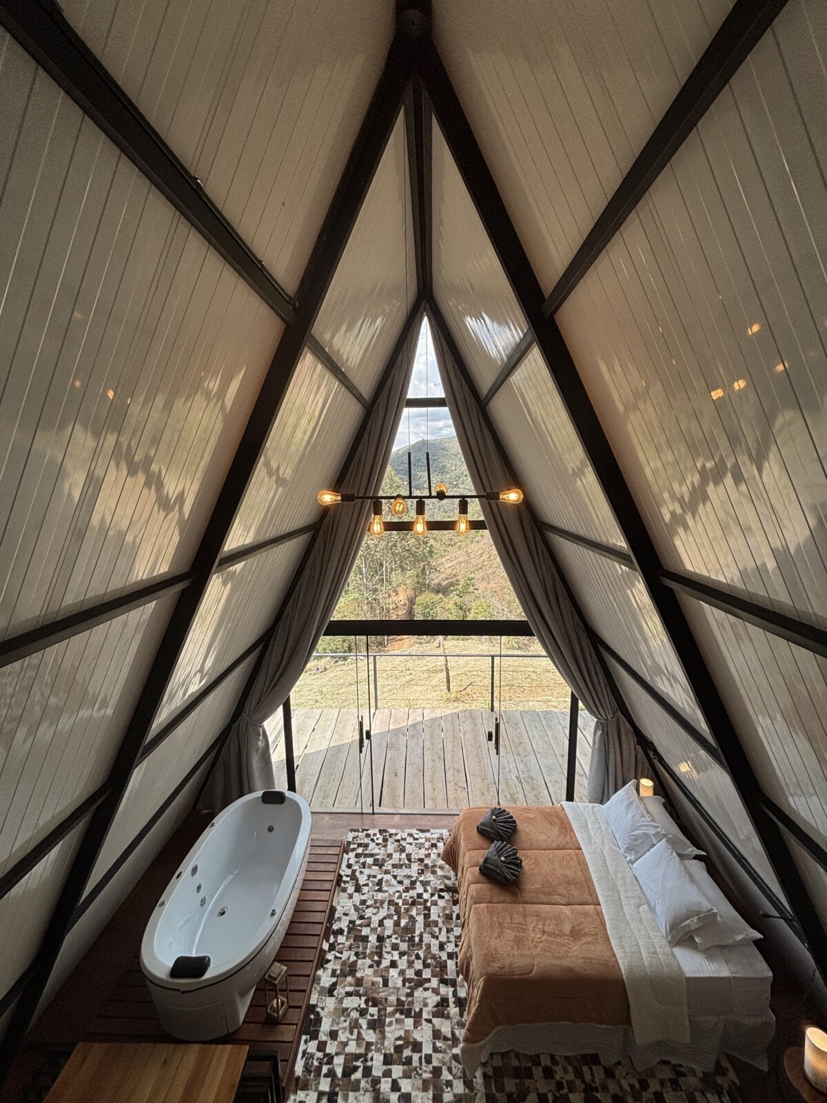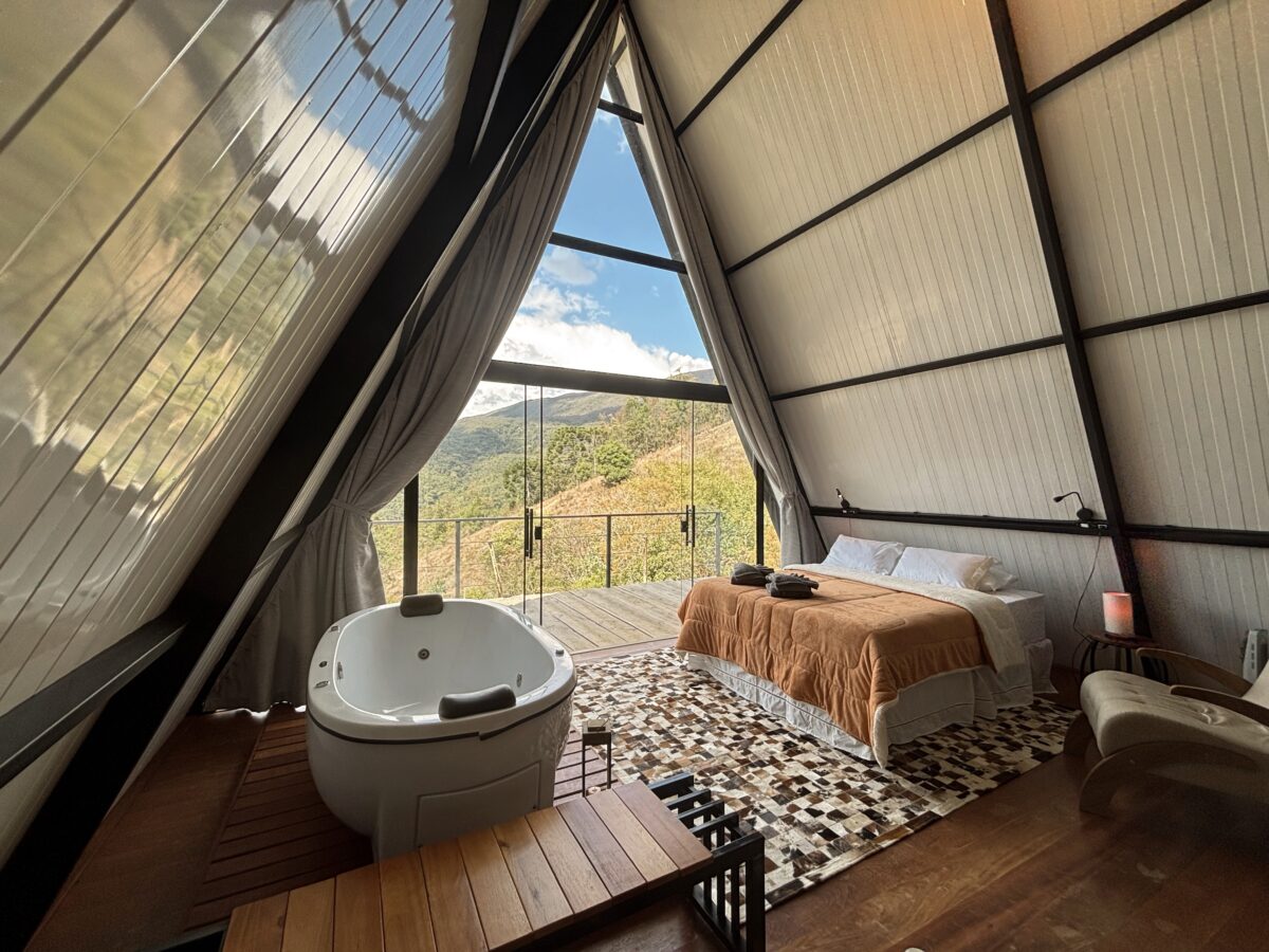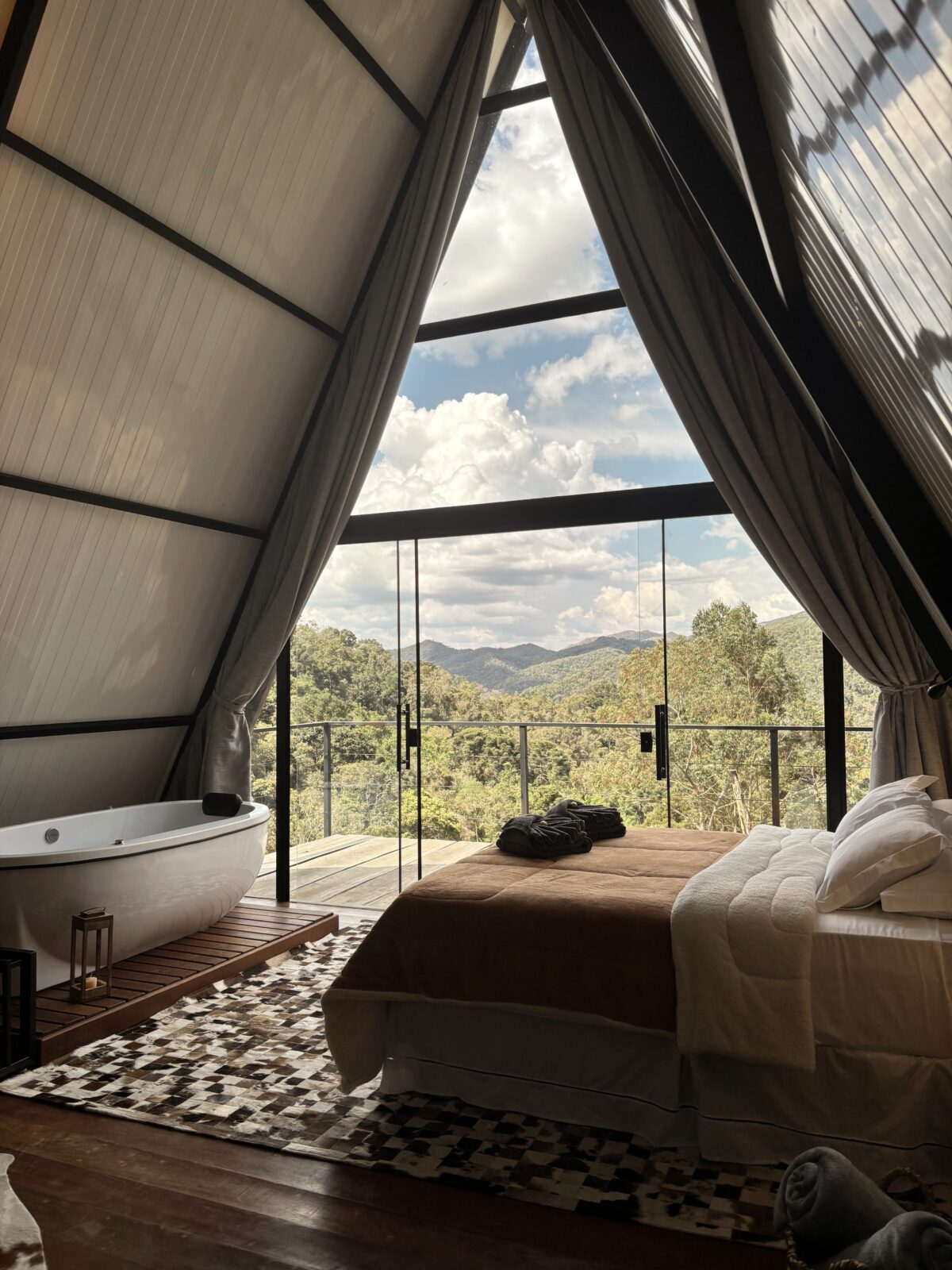 Na área interna, o chalé combina conforto e charme em cada detalhe. O quarto conta com cama de casal, enxoval completo, cortinas blackout, poltrona aconchegante, Smart TV e aquecedor — criando um ambiente ideal para relaxar. O destaque fica por conta da banheira de imersão, perfeita para banhos tranquilos com vista para as montanhas.