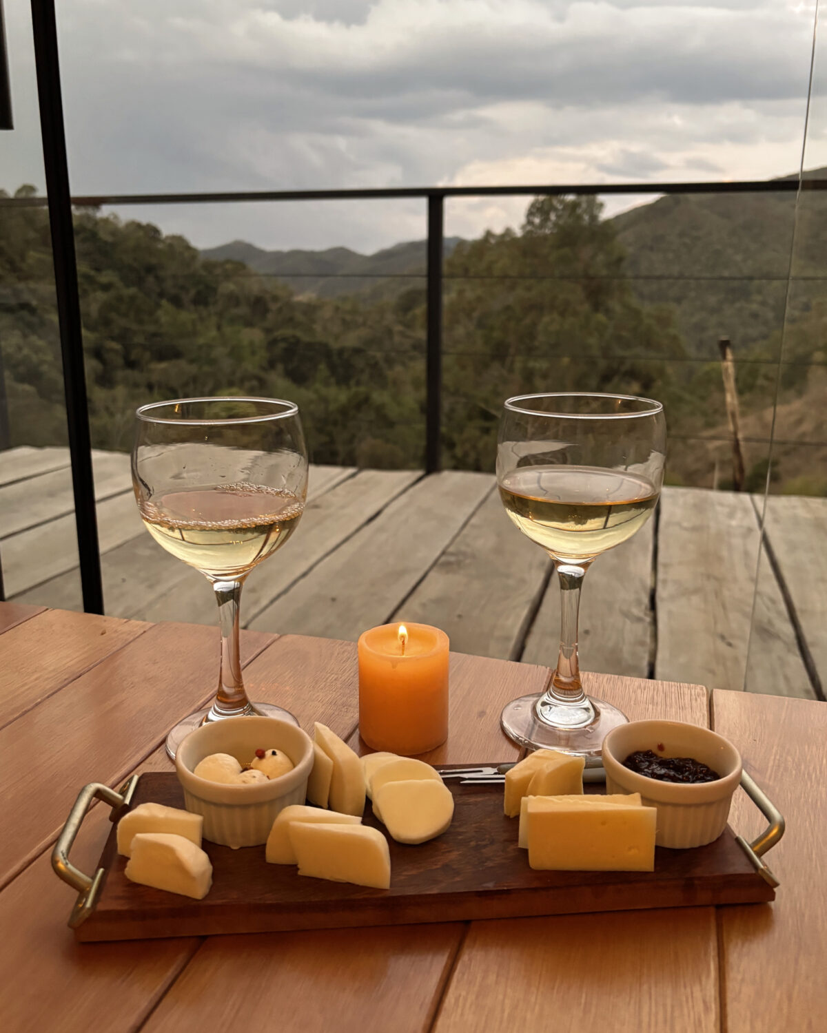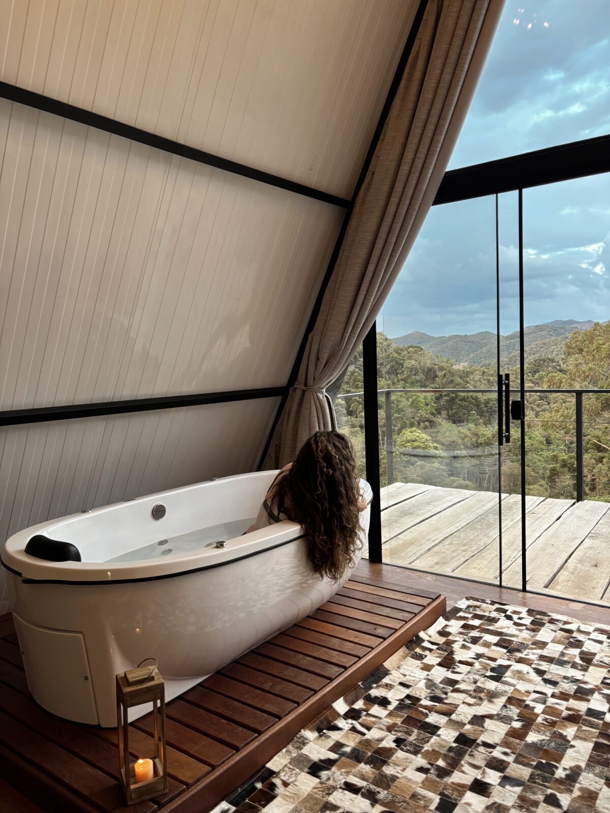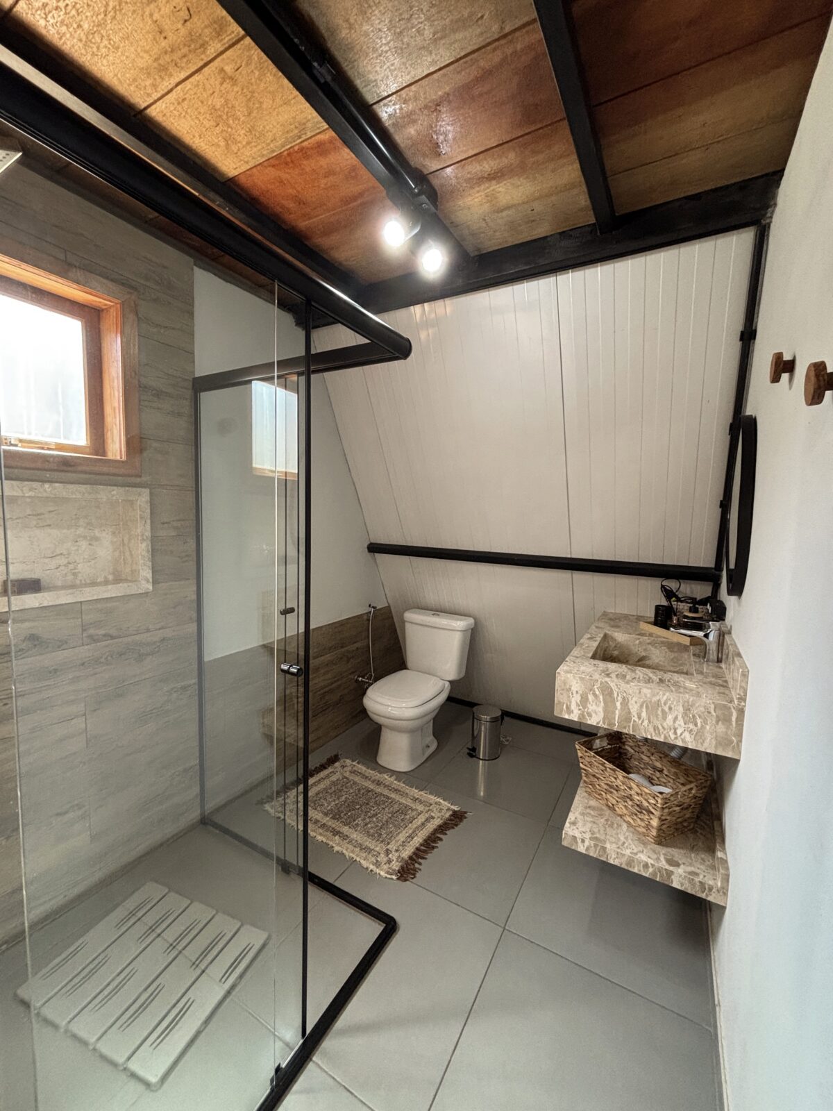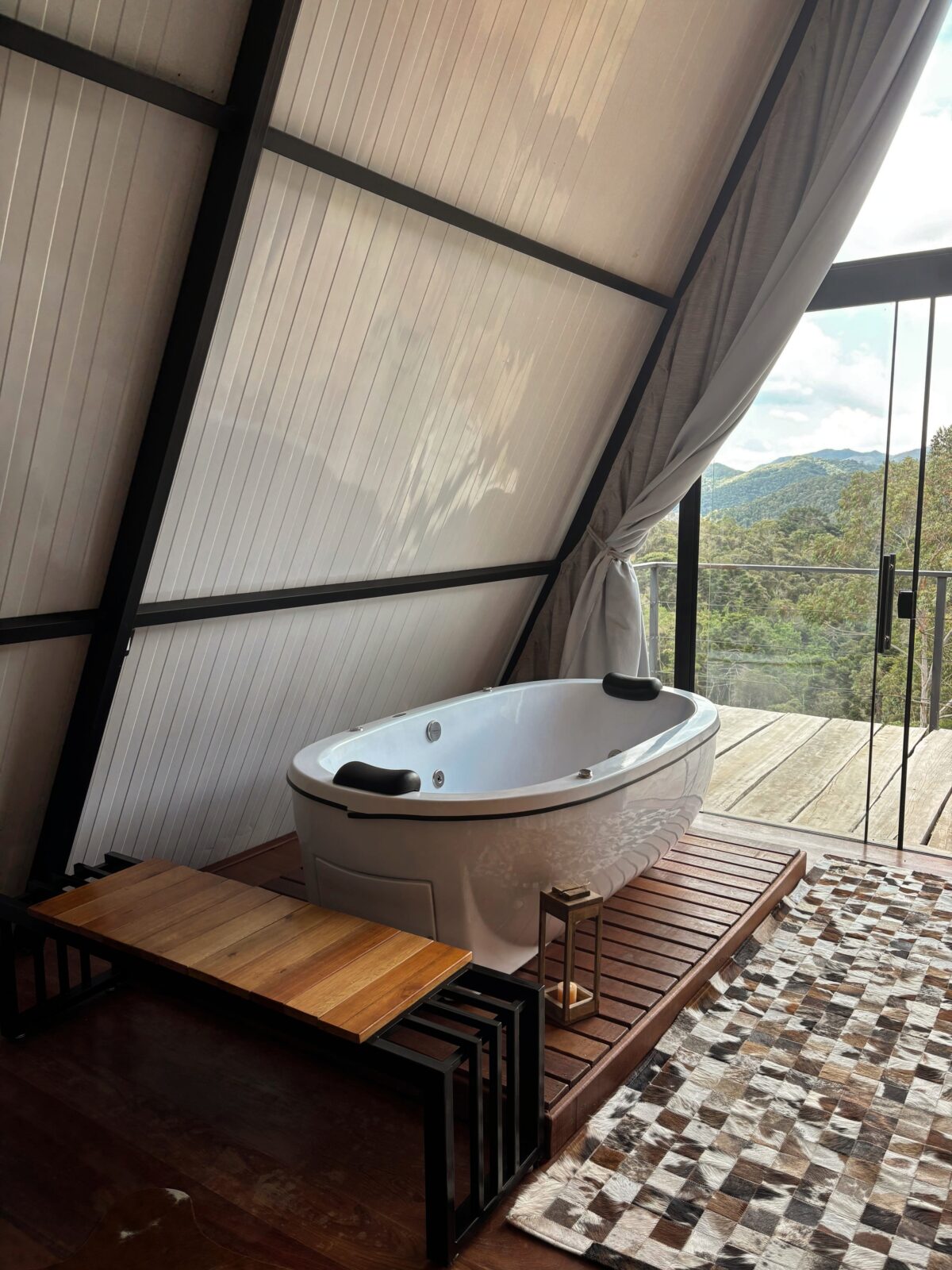 Na área interna, o chalé combina conforto e charme em cada detalhe. O quarto conta com cama de casal, enxoval completo, cortinas blackout, poltrona aconchegante, Smart TV e aquecedor — criando um ambiente ideal para relaxar. O destaque fica por conta da banheira de imersão, perfeita para banhos tranquilos com vista para as montanhas.