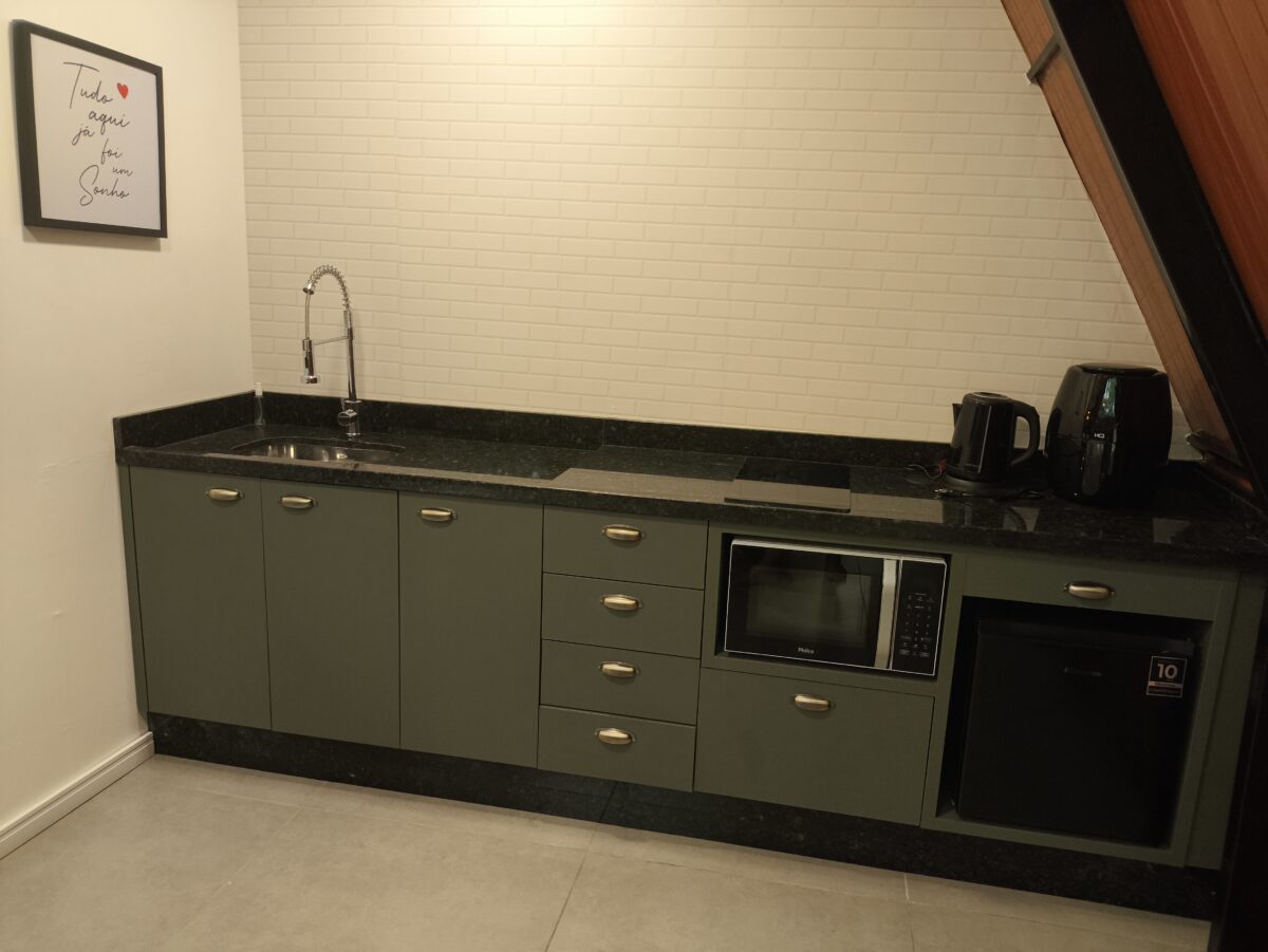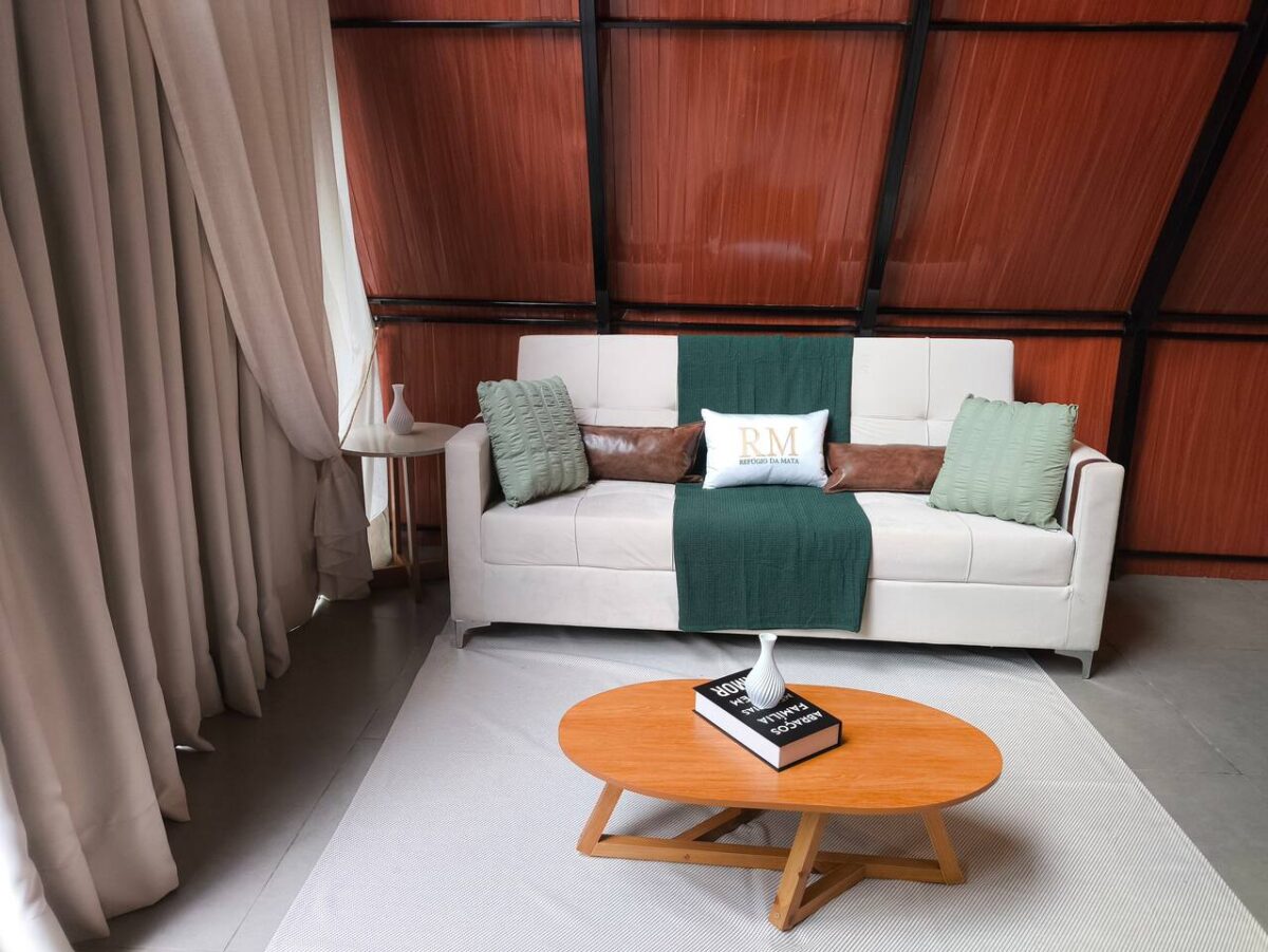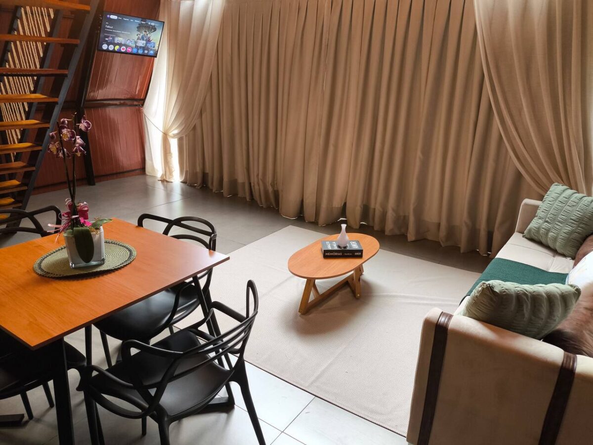 Na área interna, combinando conforto e praticidade em um ambiente integrado e acolhedor. A sala conta com sofá-cama aconchegante e Smart TV. Uma mesa de refeições conecta os espaços e se integra à cozinha equipada, que dispõe de frigobar, cooktop, air fryer e armários com utensílios e eletroportáteis para o preparo das refeições.
