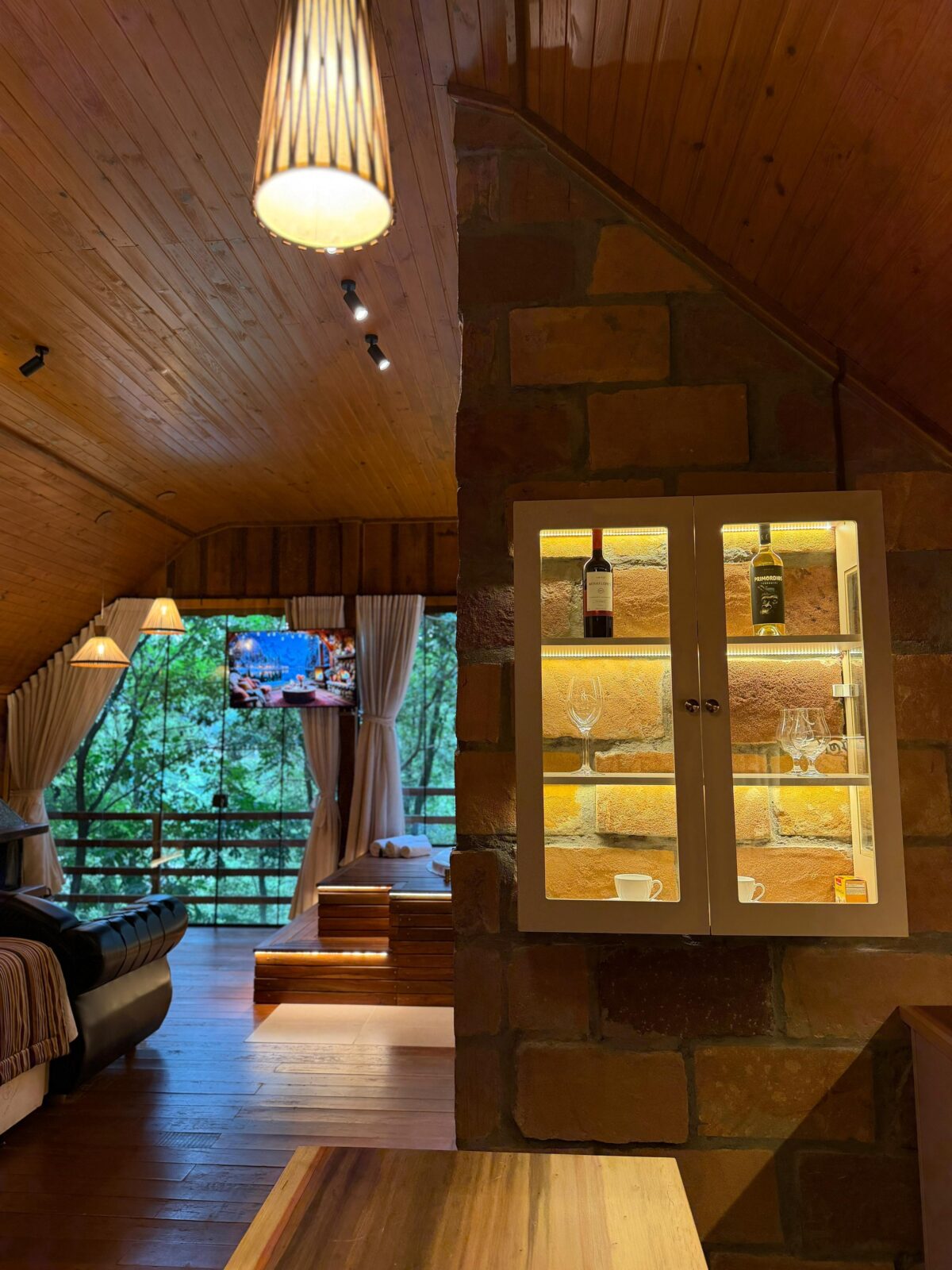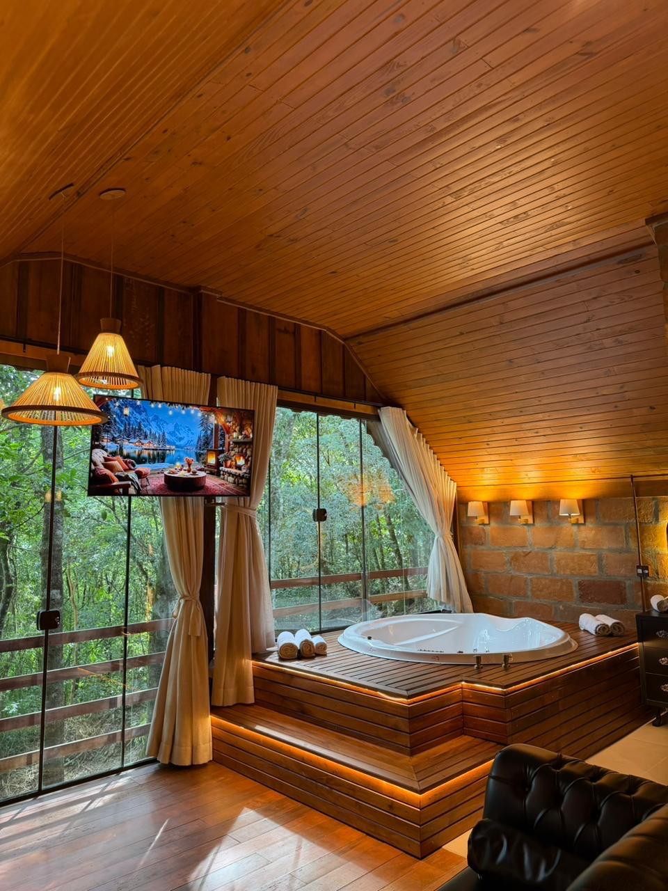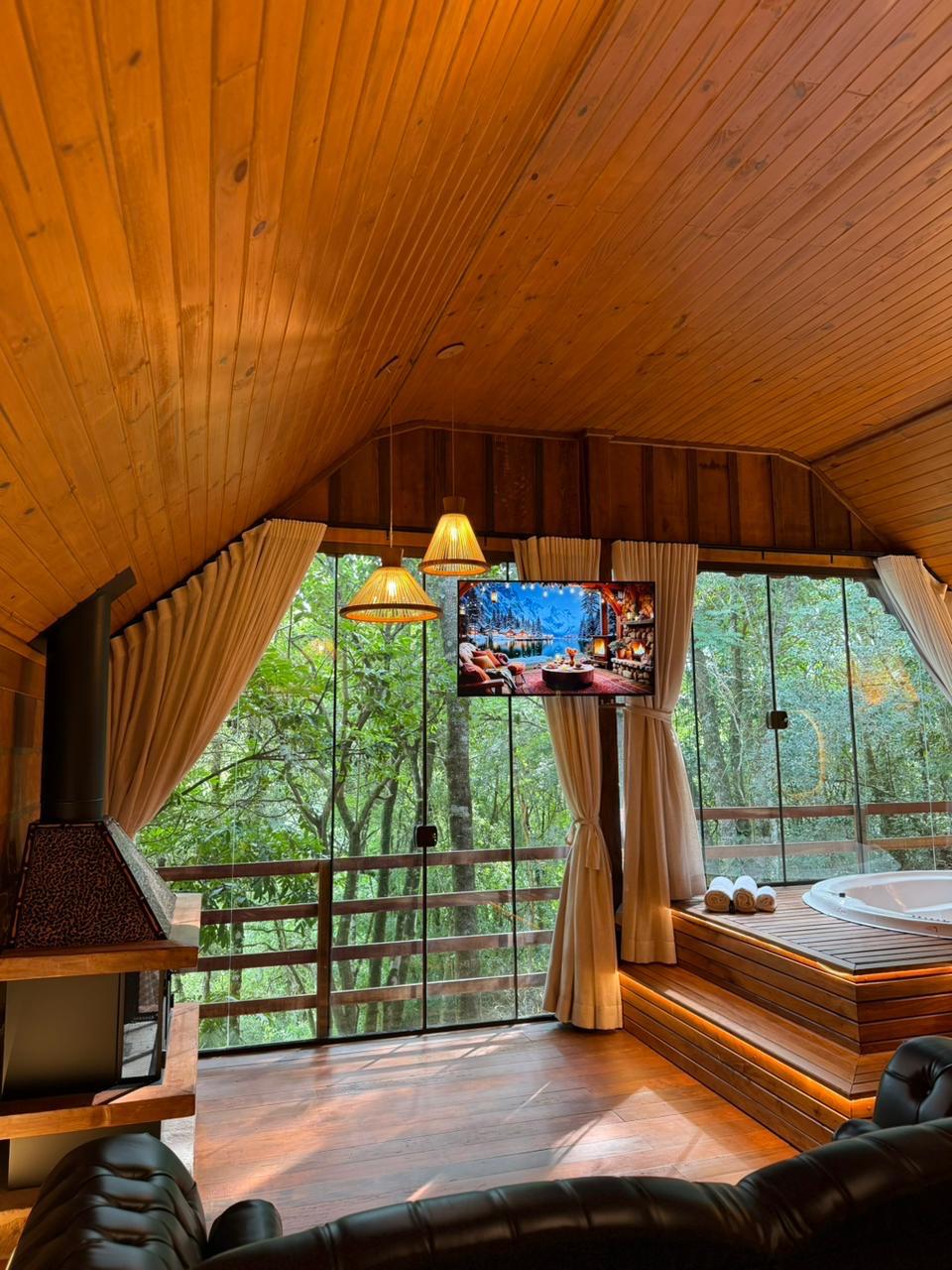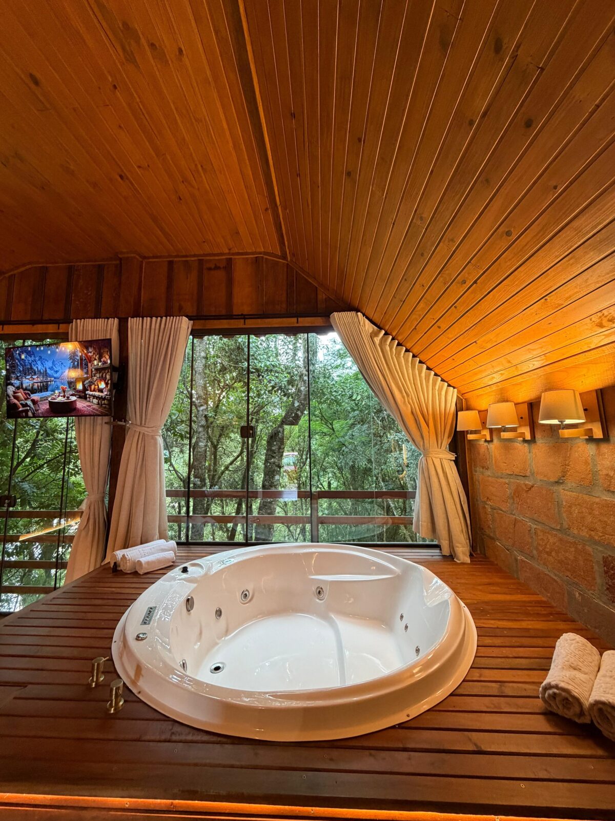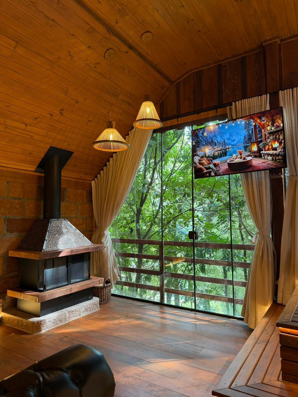 O espaço interno combina uma arquitetura com muita madeira, pensando num ambiente acolhedor para o descanso a dois. O espaço principal possui uma cama de casal com enxoval completo, Smart TV, ar condicionado e cortinas blackout. O grande destaque fica por conta da jacuzzi com hidromassagem, posicionada abaixo de uma janela, perfeita para banhos relaxantes com vista para a natureza. Além disso, há um espaço com sofá confortável e lareira.