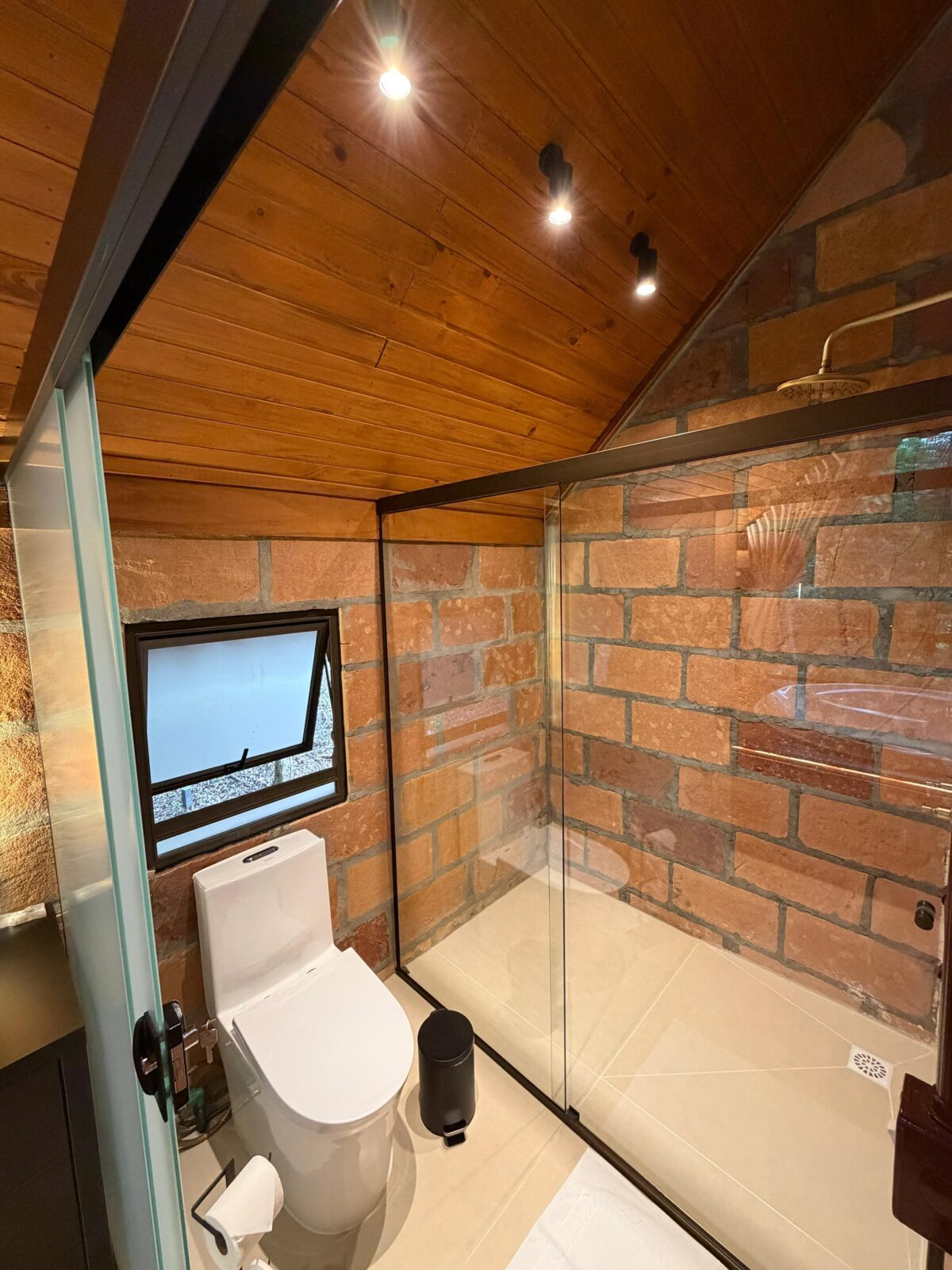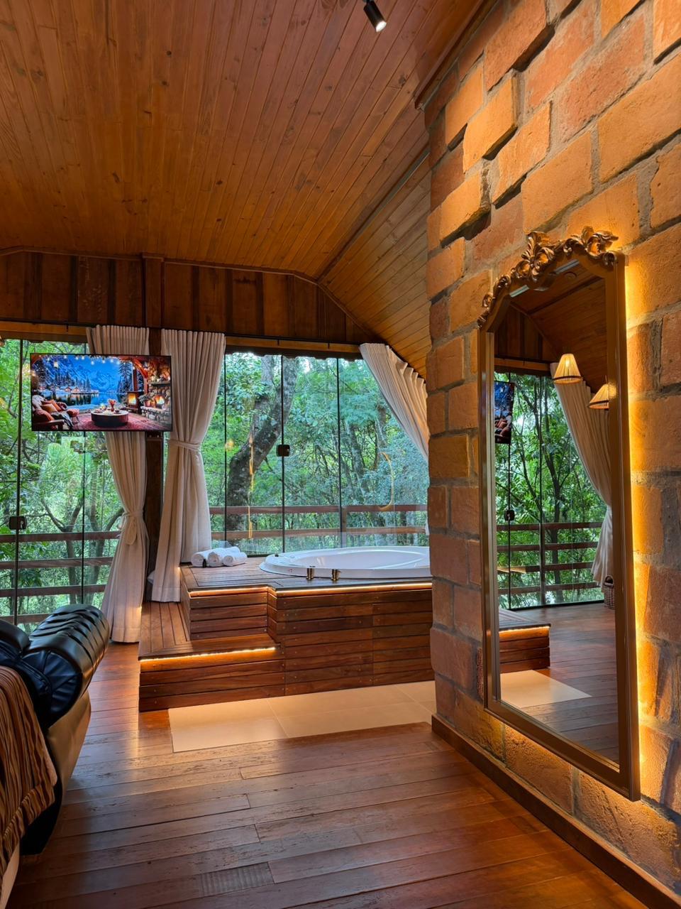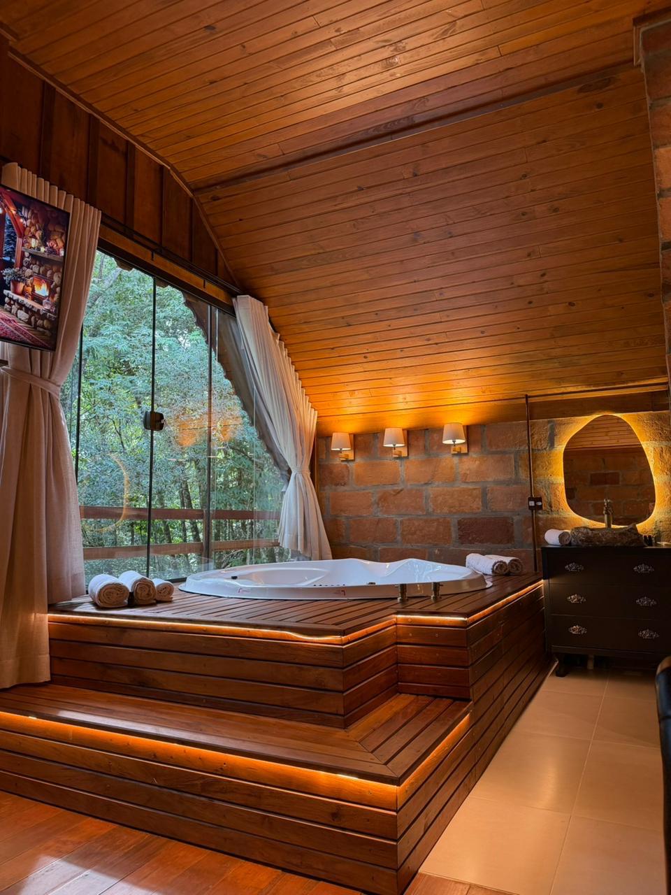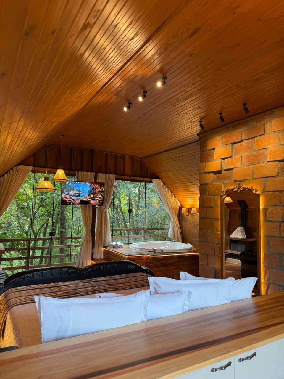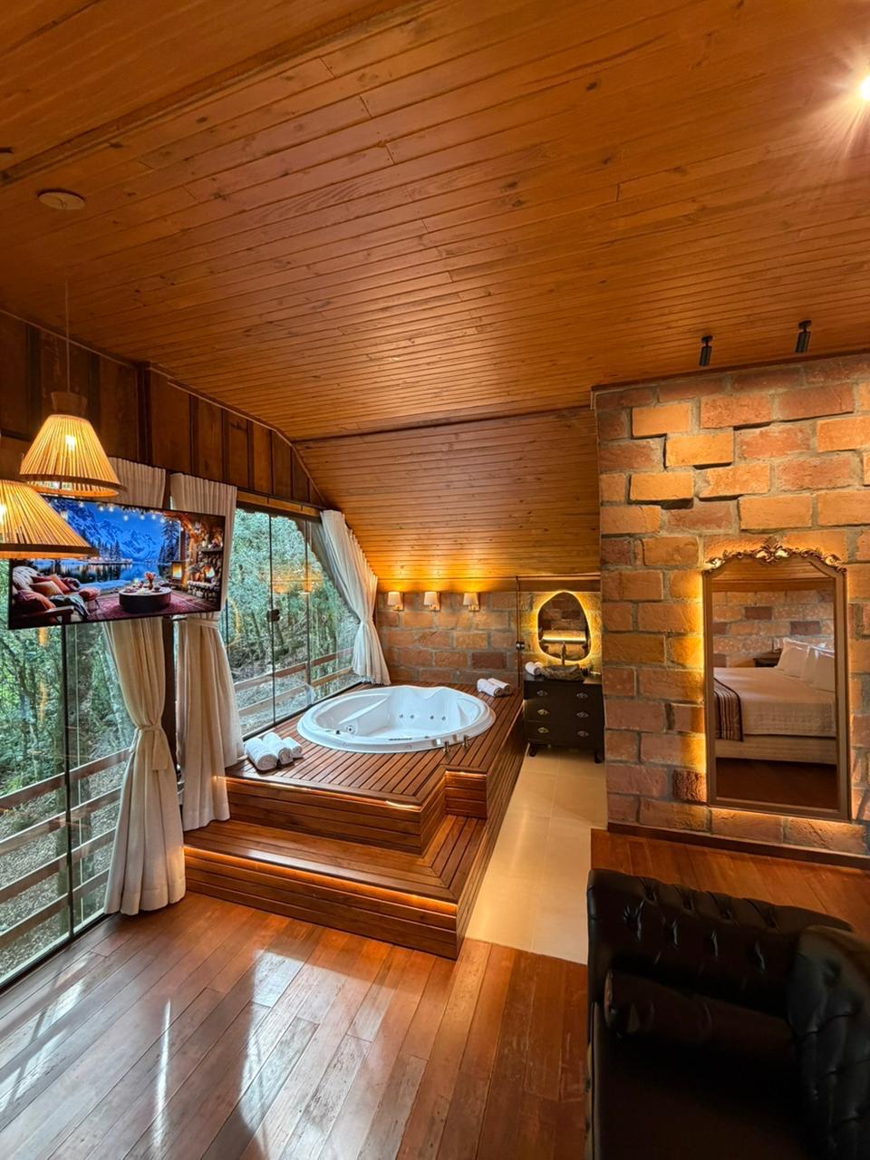 O espaço interno combina uma arquitetura com muita madeira, pensando num ambiente acolhedor para o descanso a dois. O espaço principal possui uma cama de casal com enxoval completo, Smart TV, ar condicionado e cortinas blackout. O grande destaque fica por conta da jacuzzi com hidromassagem, posicionada abaixo de uma janela, perfeita para banhos relaxantes com vista para a natureza. Além disso, há um espaço com sofá confortável e lareira.