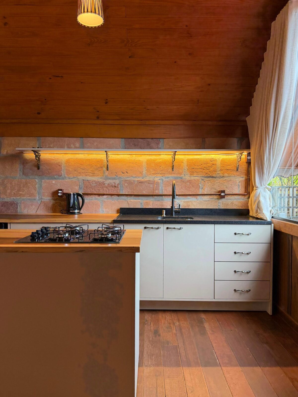 Há também uma cozinha, compacta bem equipada para refeições práticas, com cooktop, frigobar, chaleira e utensílios. O banheiro oferece ducha quente, toalhas e amenidades.