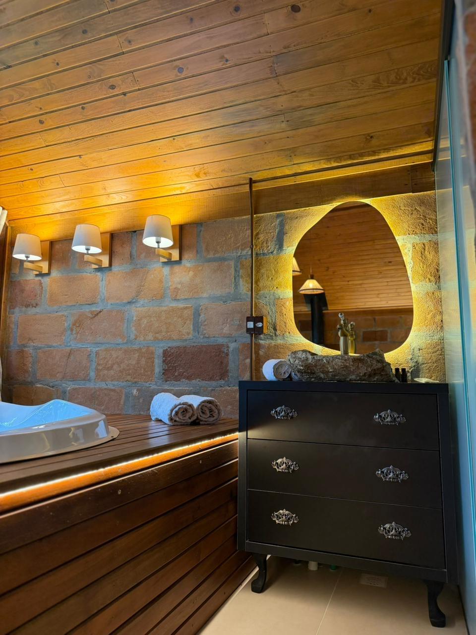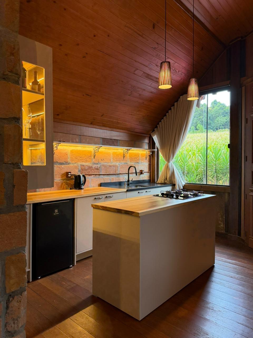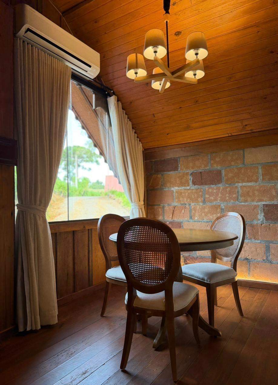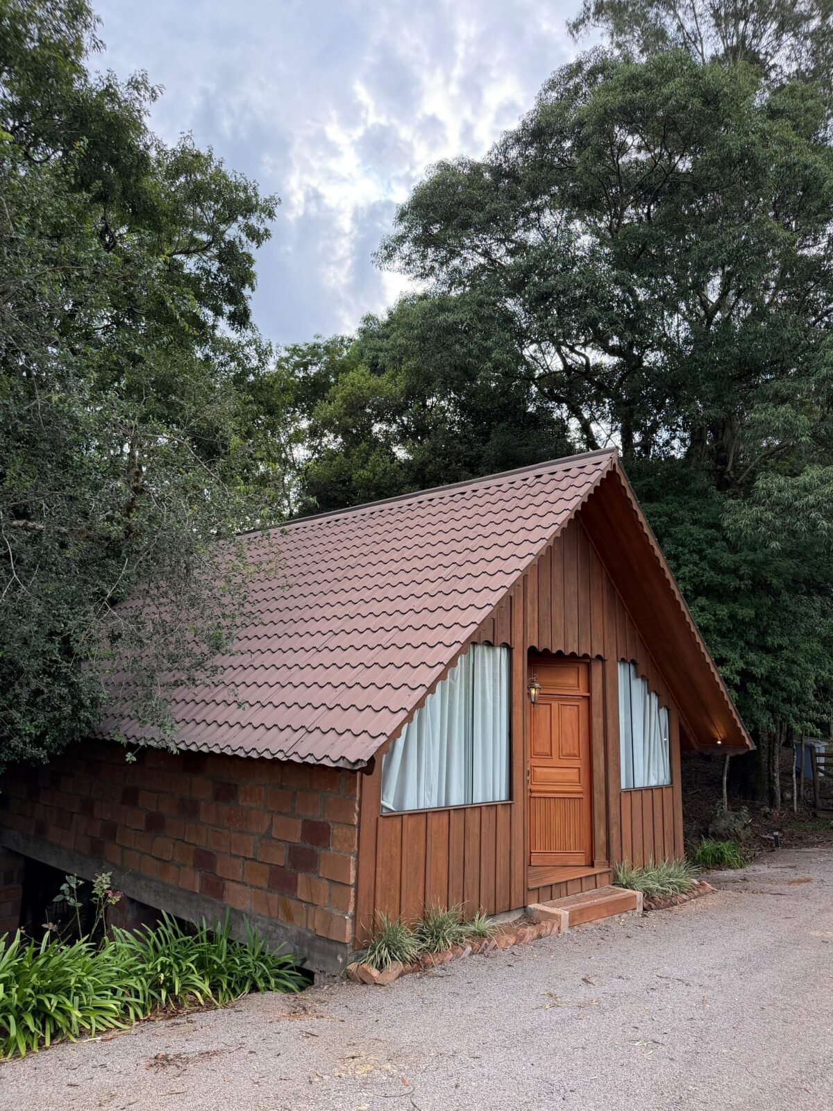 Na área externa, o chalé está cercado pela natureza da Serra Gaúcha, oferecendo um cenário tranquilo e cheio de verde ao redor. Mesmo localizado em um terreno com outros chalés, cada unidade foi pensada para garantir privacidade, com bom distanciamento e acesso independente. No local, há também um restaurante que oferece opções de refeições.