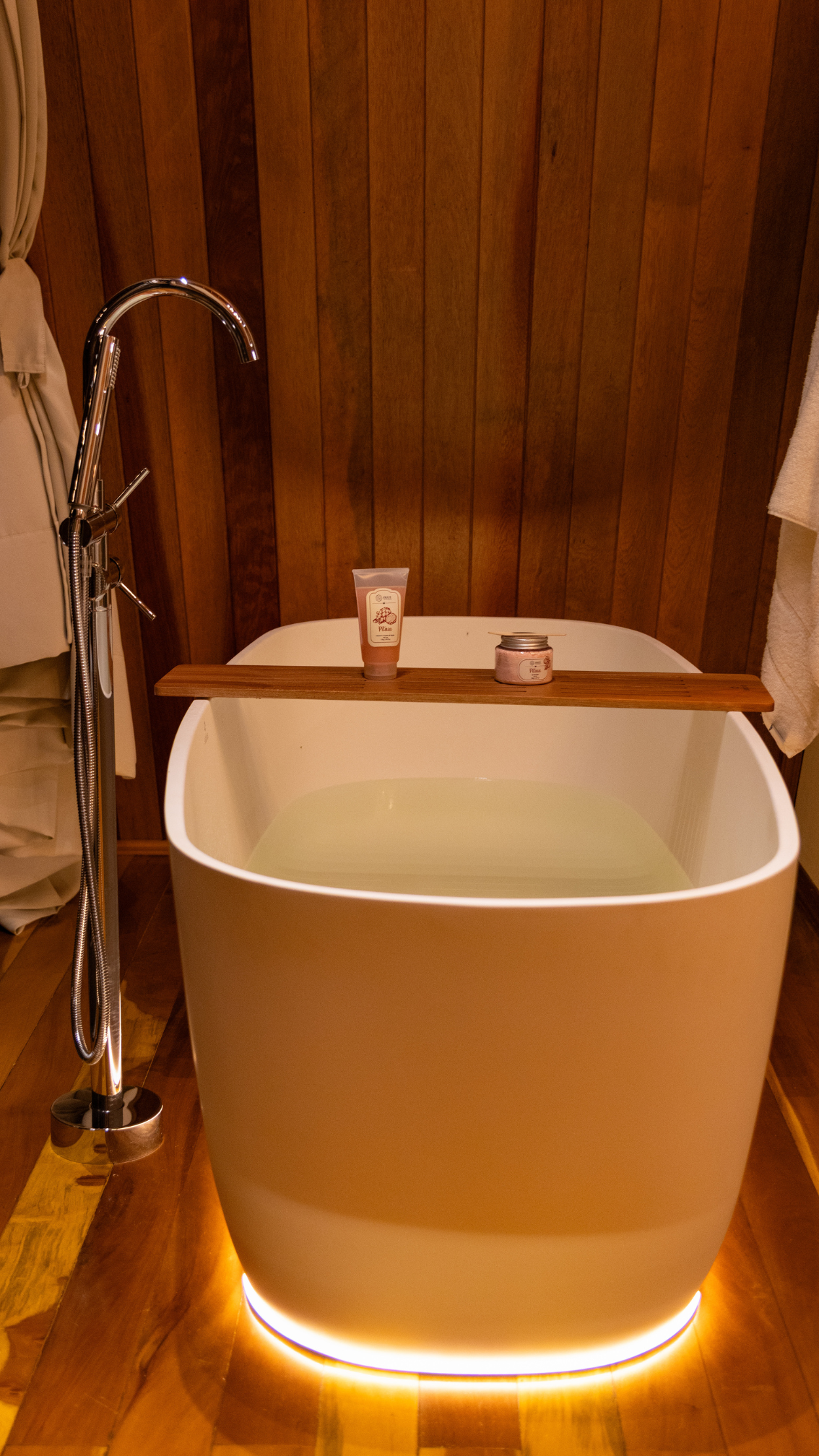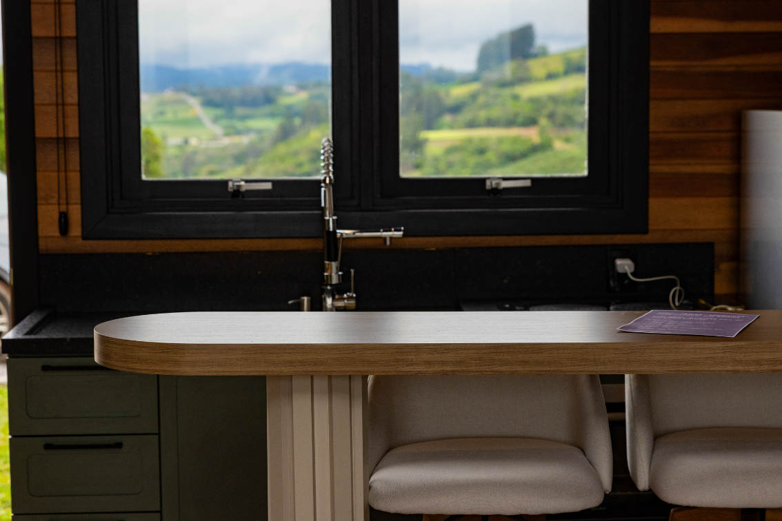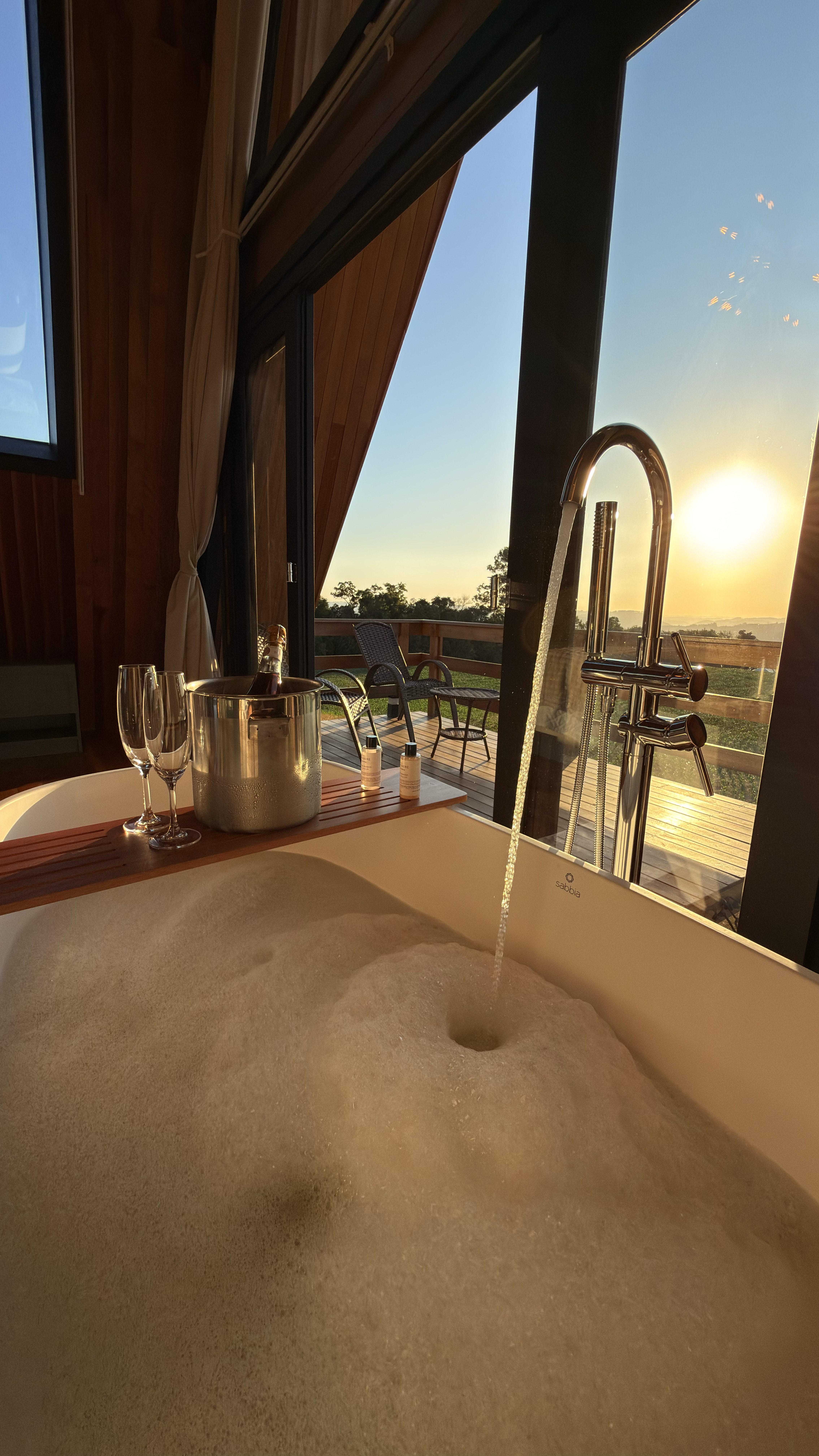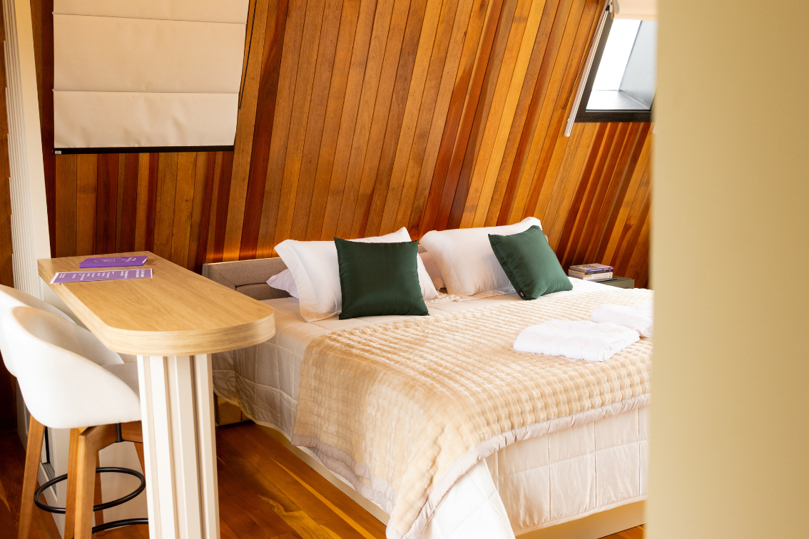 Na área interna, o chalé conta com uma cama de casal aconchegante, enxoval completo, cortinas blackout, lareira, Smart TV, ar-condicionado e espaço para itens pessoais. O ambiente ainda dispõe de automação inteligente com Alexa. Além disso, um dos grandes destaques é a banheira de imersão, perfeita para momentos de relaxamento com vista para a natureza.